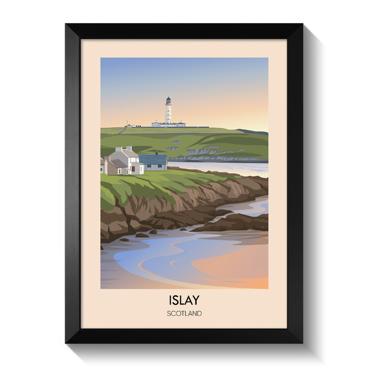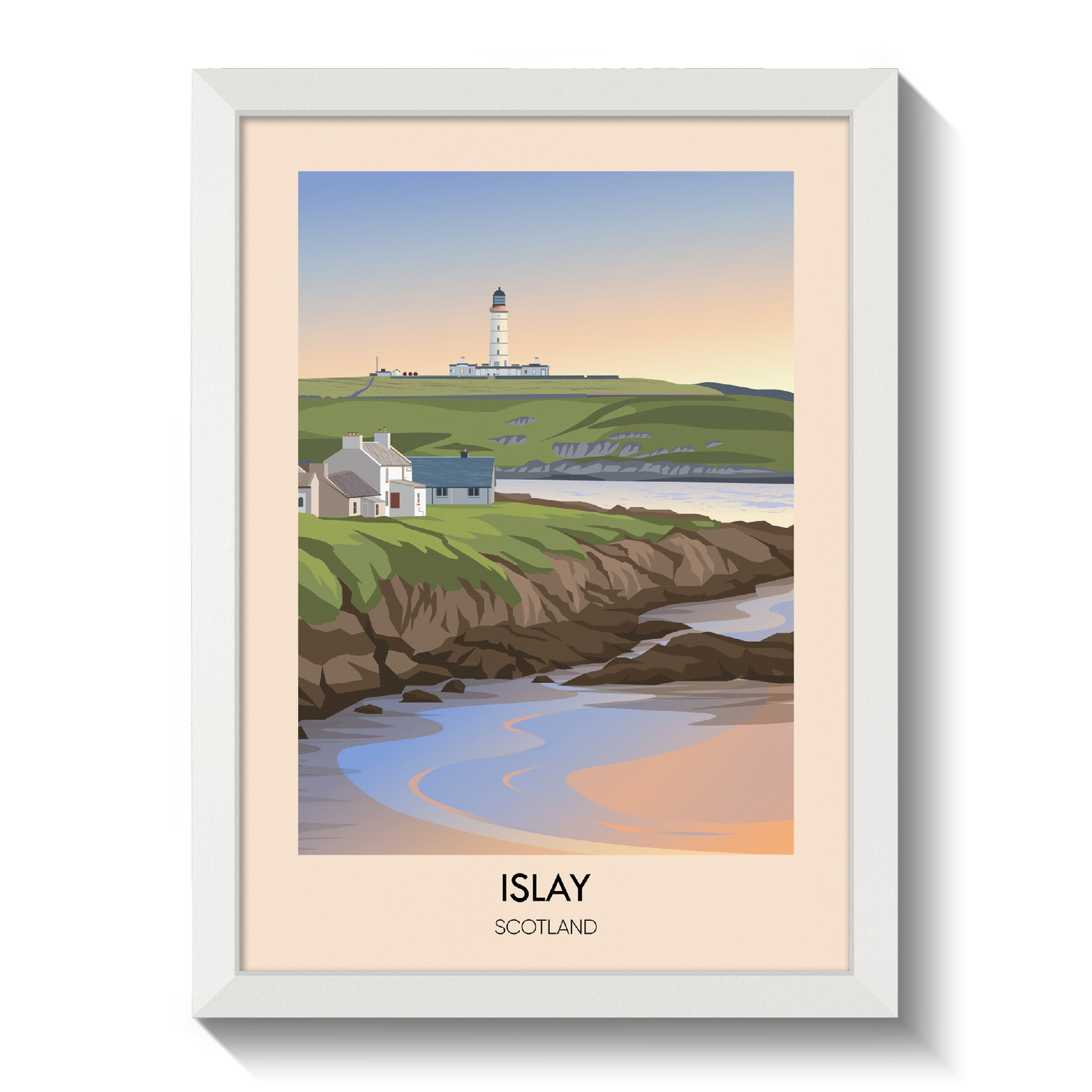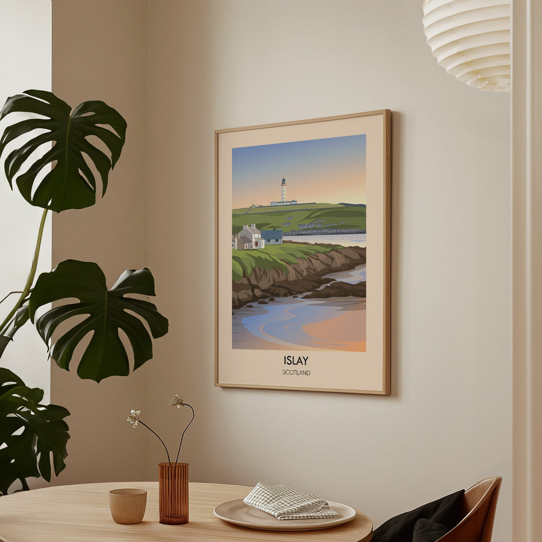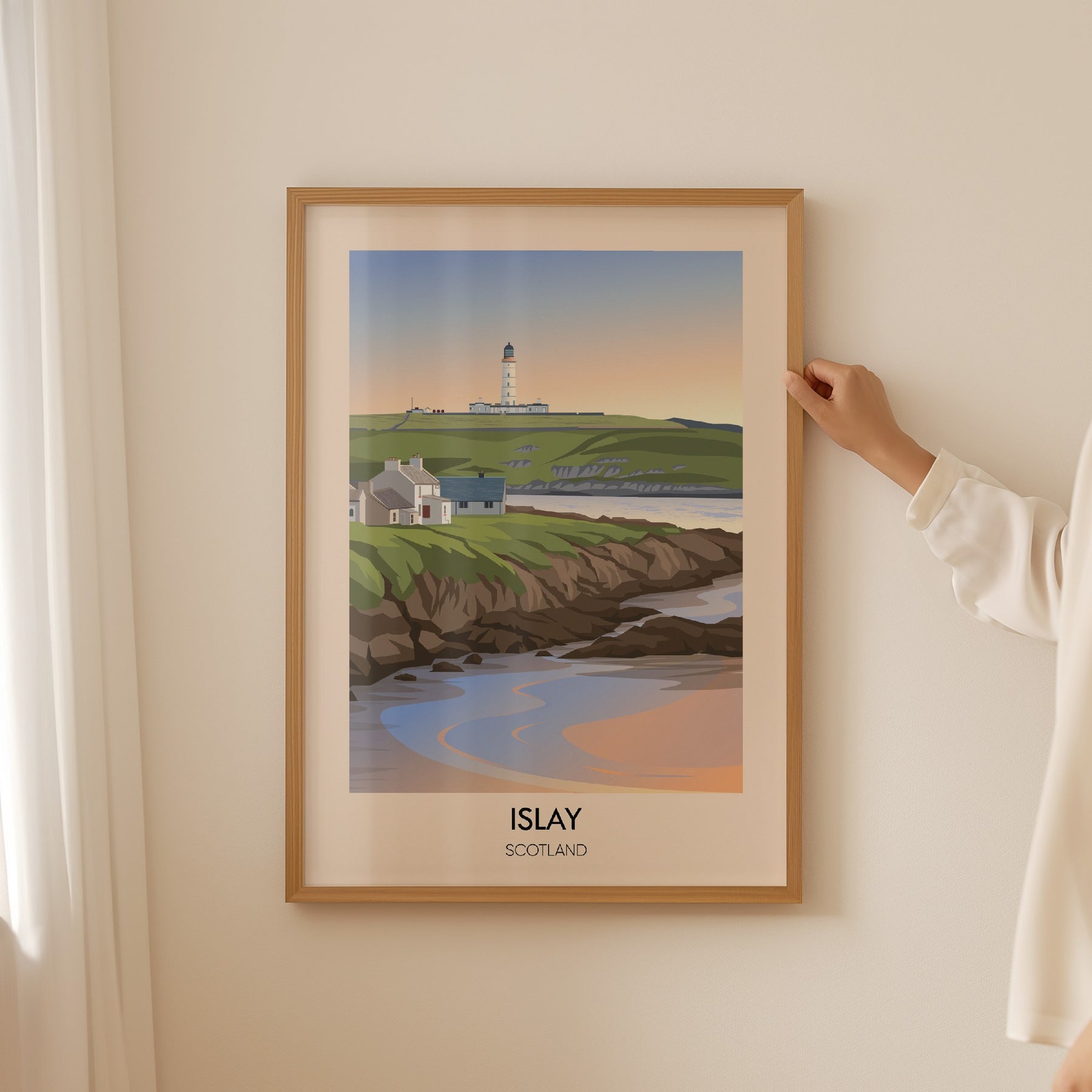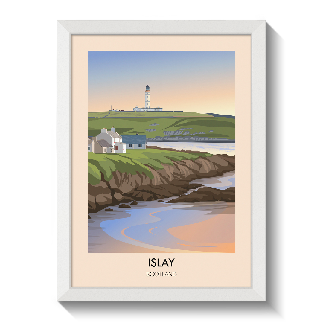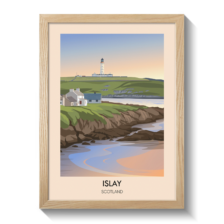 An original travel poster featuring Scotland's Islay. Islay is an island located on the west coast of Scotland and is the Southernmost in the Inner Hebrides. It is the fifth largest Scottish island and is best known for its distilleries, producing peaty, smoky whisky. In the poster you can see the picturesque Rhinns Of Islay Lighthouse.