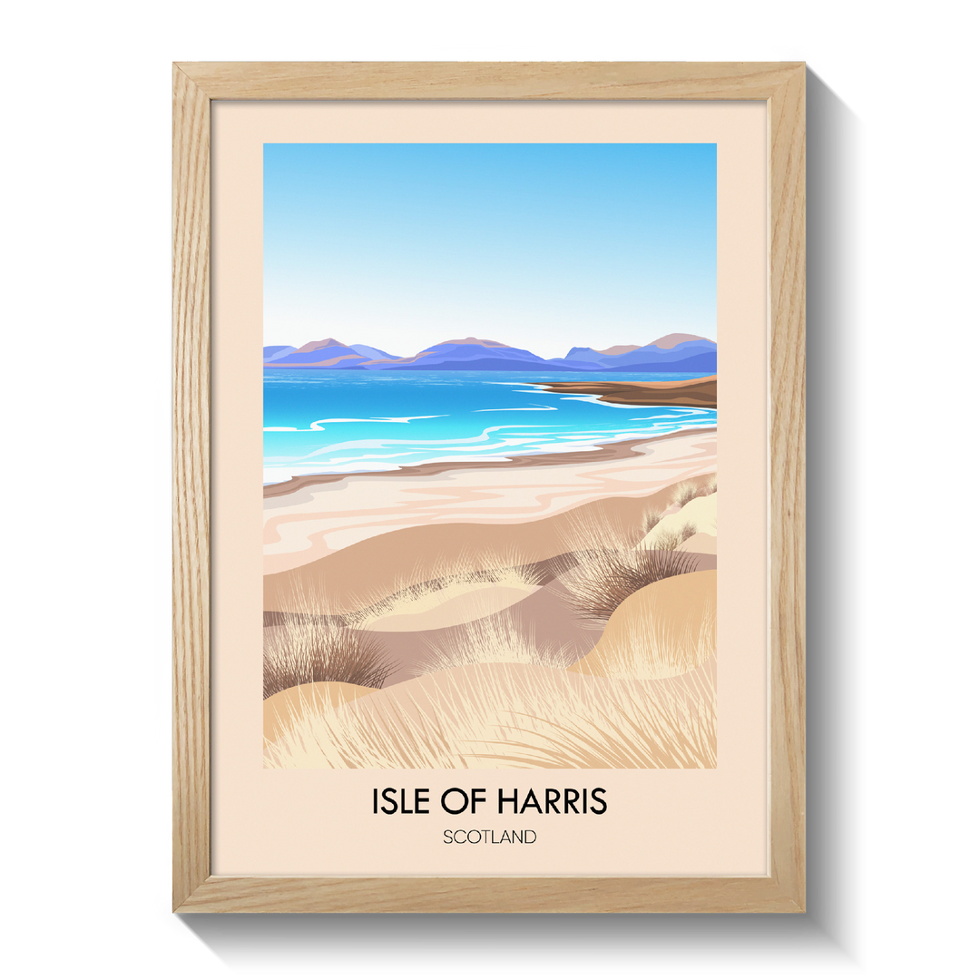 An original travel poster featuring Scotland's Isle of Harris. The Isle of Harris is part of Lewis and Harris which between them make up the largest Scottish island. They are divided by mountains and often referred to as separate islands.