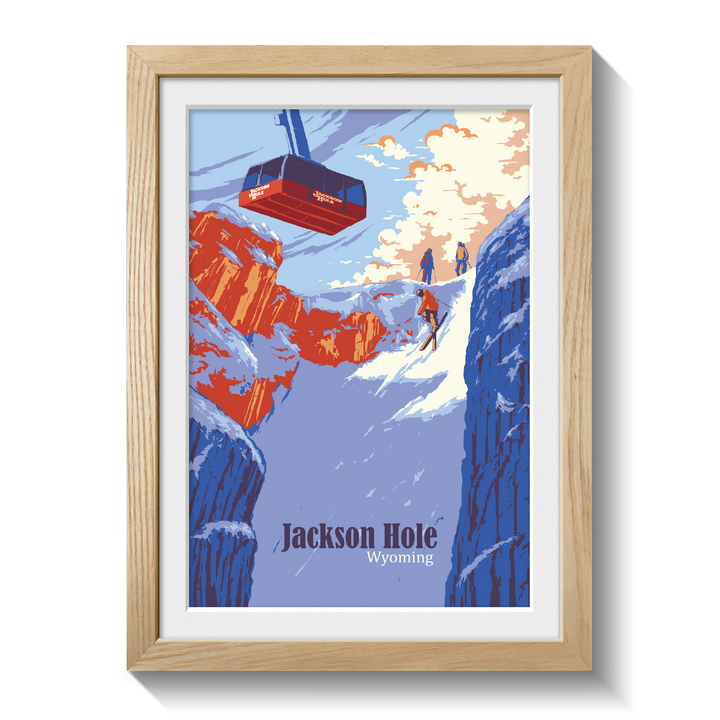 This is an original travel poster featuring the iconic Corbet's Couloir in the ski resort of Jackson Hole, Wyoming, next door to Grand Teton and Yellowstone National Park.