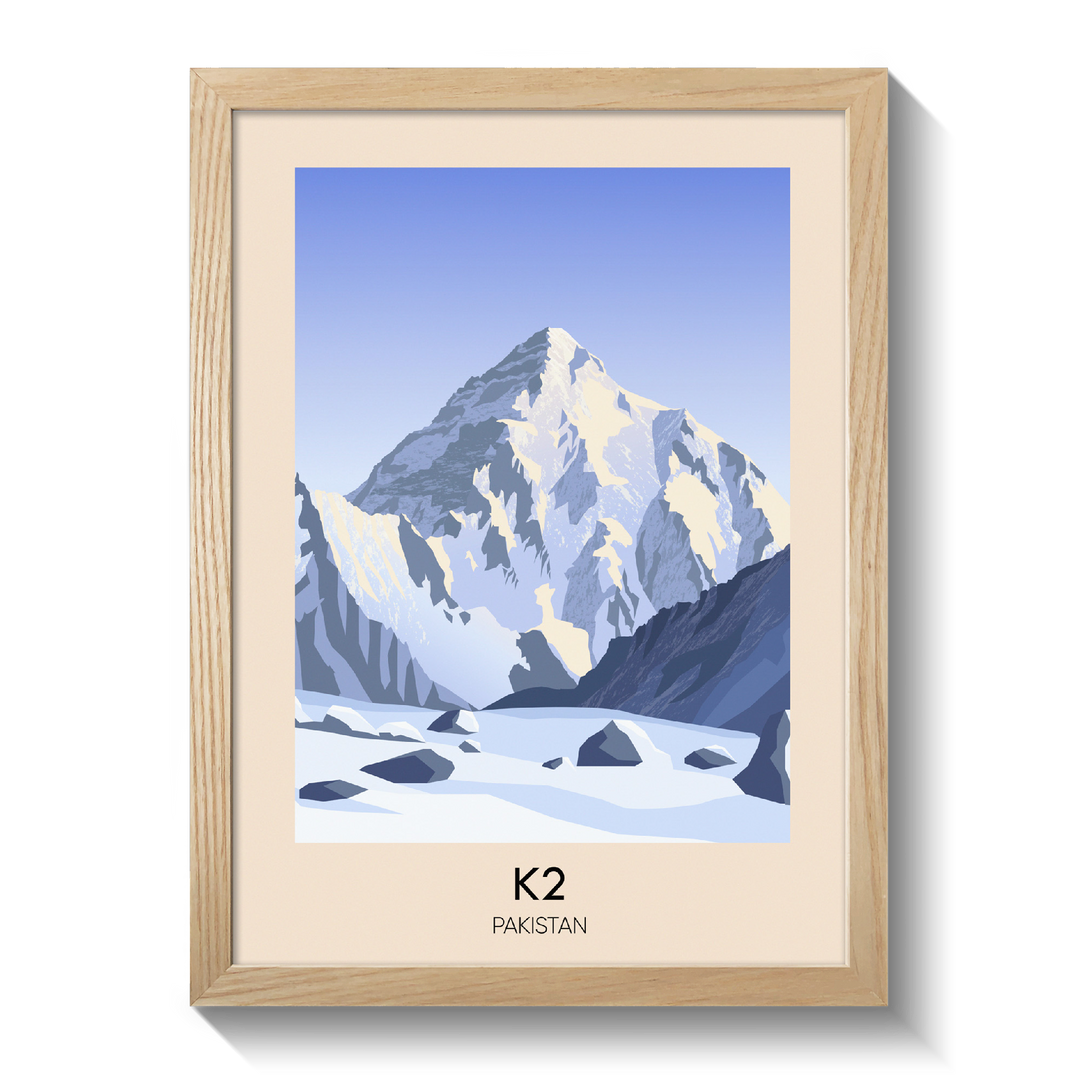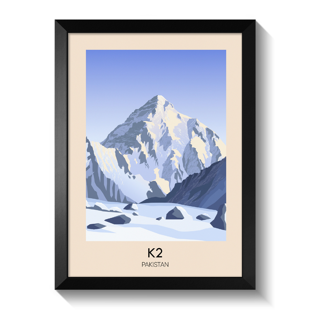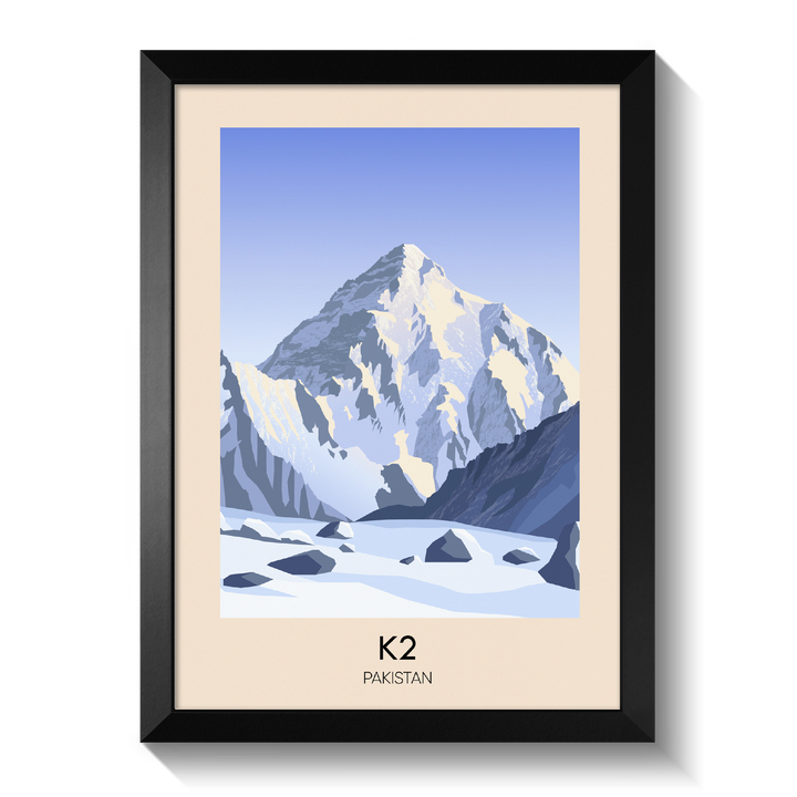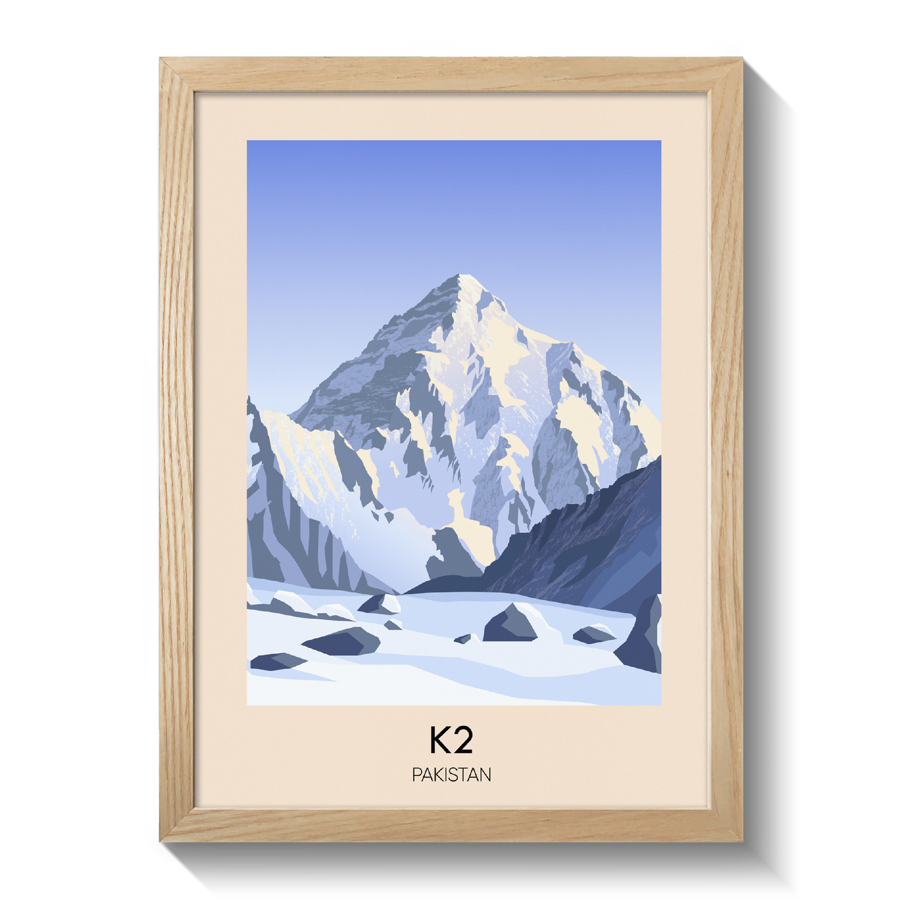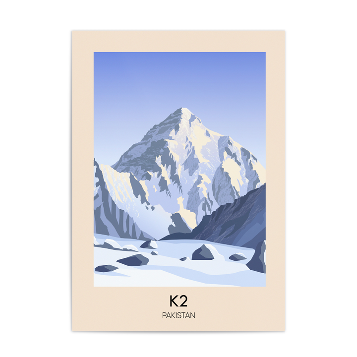 An original travel poster of the iconic K2 Mountain, the second tallest mountain in the world after Mount Everest. K2 attracts a small number of hardcore mountaineers every year who wish to attempt to reach the summit. Though technically smaller than Everest, it is considered by many to be a much more technically challenging mountain.