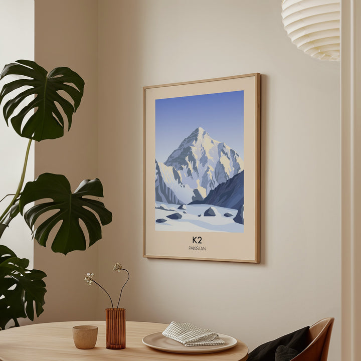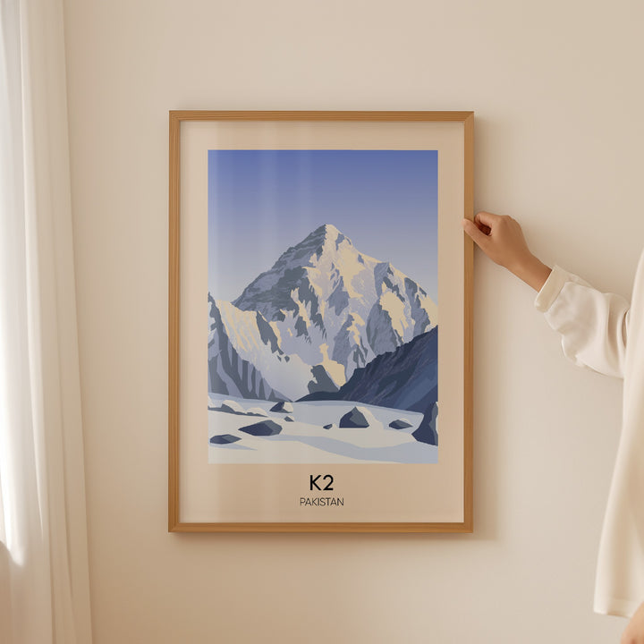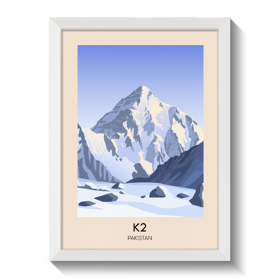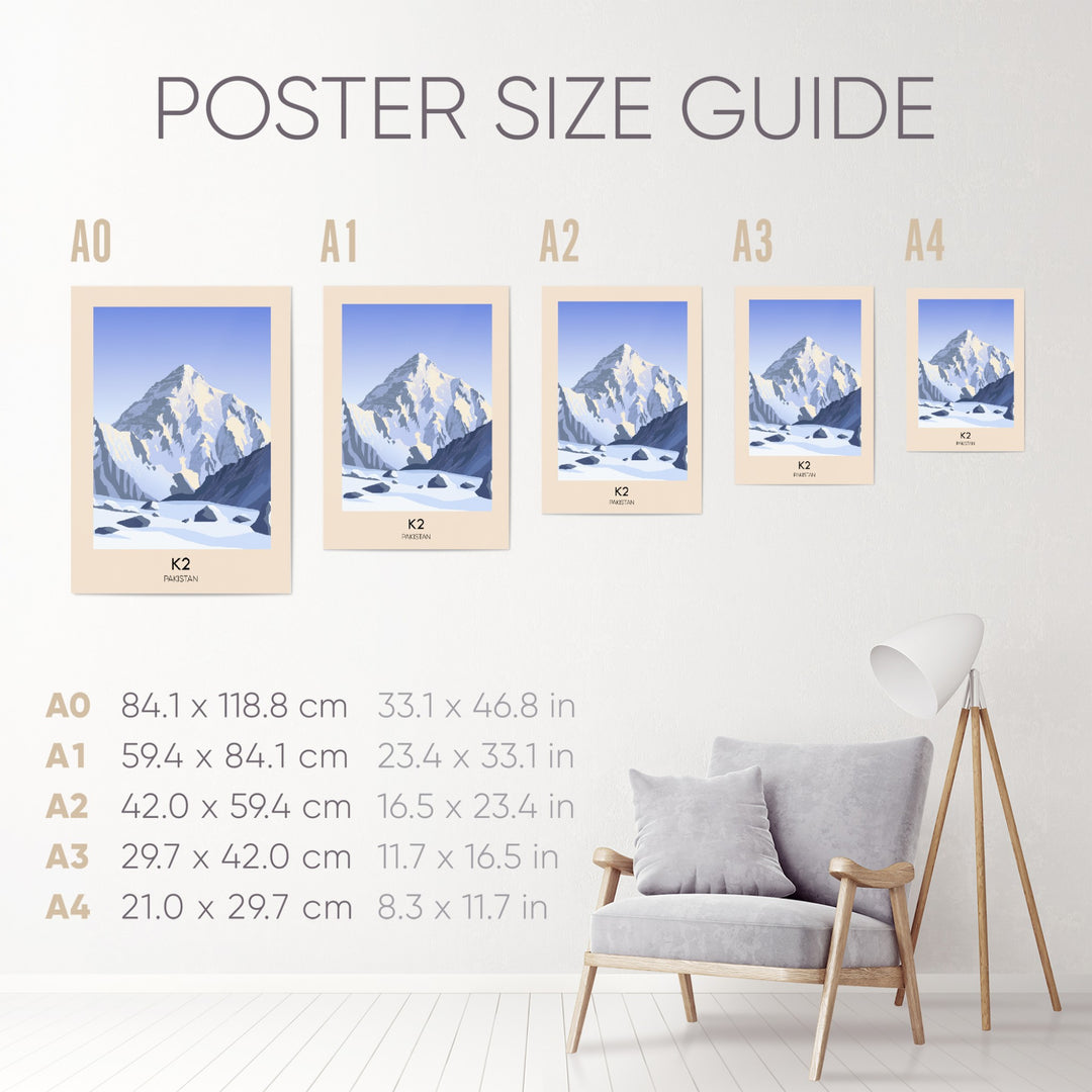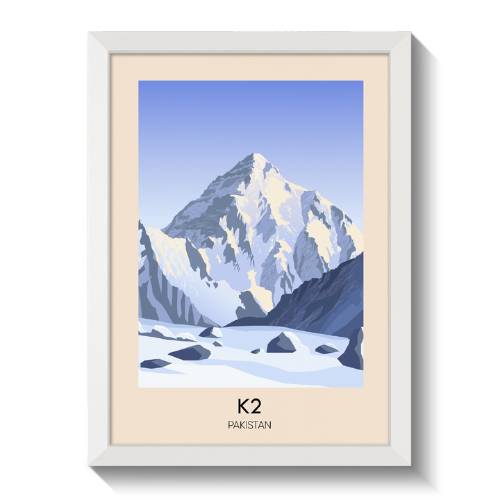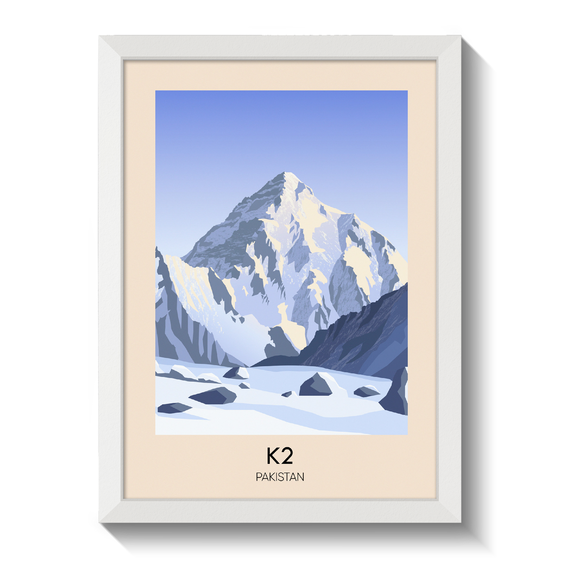 An original travel poster of the iconic K2 Mountain, the second tallest mountain in the world after Mount Everest. K2 attracts a small number of hardcore mountaineers every year who wish to attempt to reach the summit. Though technically smaller than Everest, it is considered by many to be a much more technically challenging mountain.