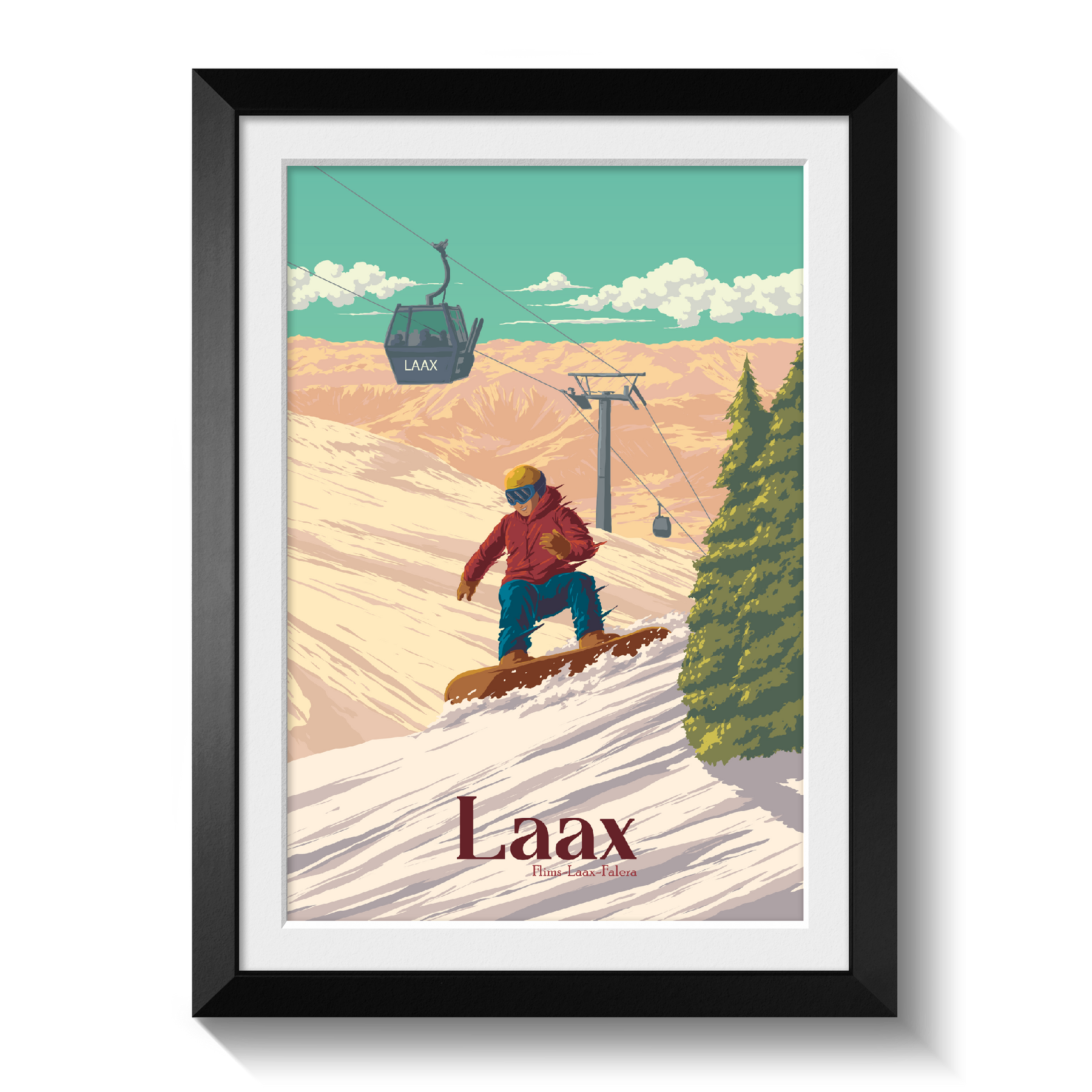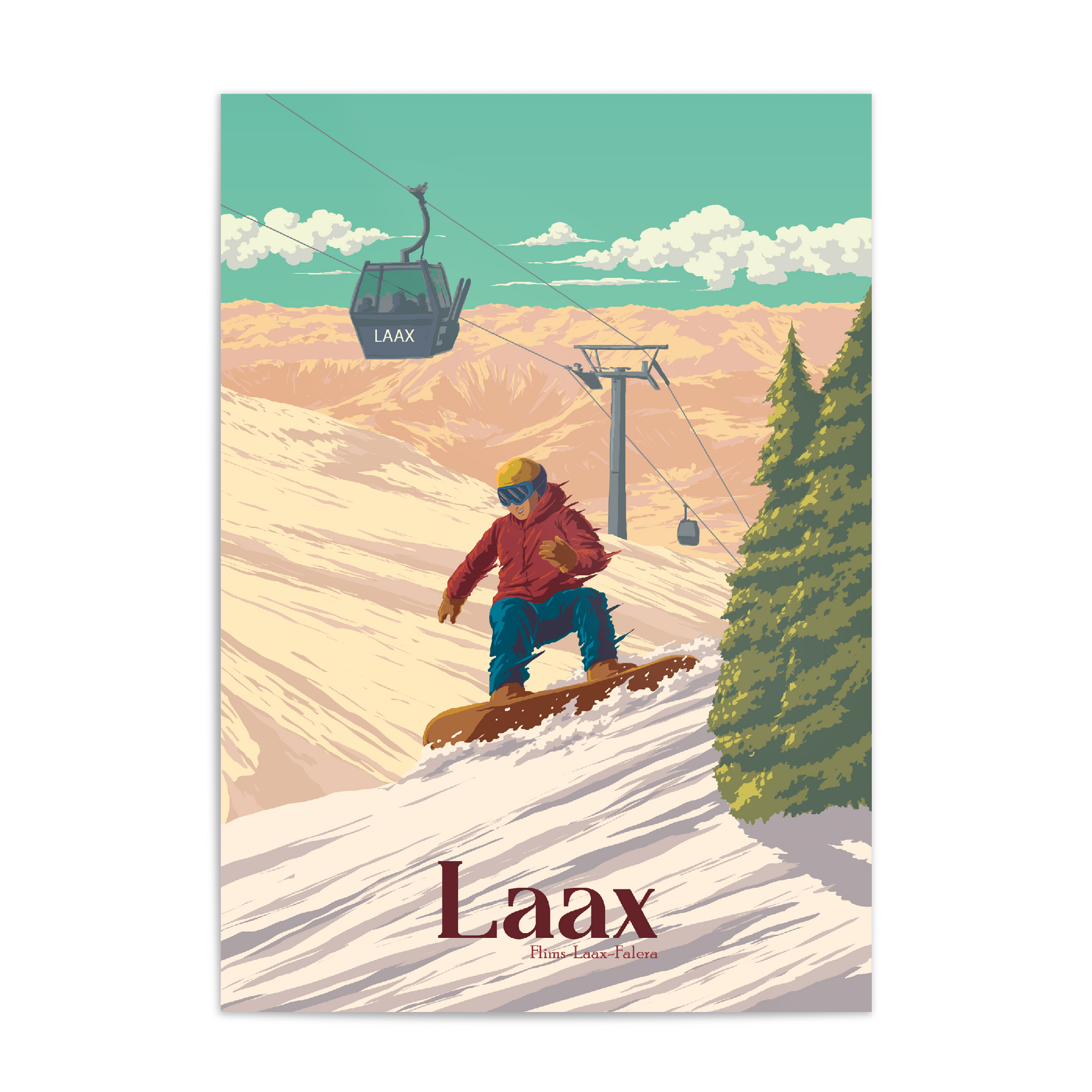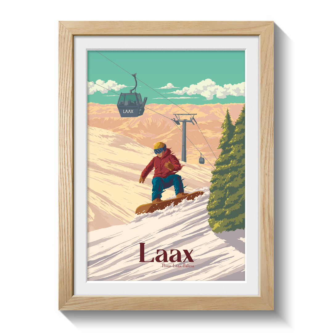 An original snowboarding travel poster featuring the Swiss ski resort of Laax in the 'Flims Laax Falera' ski area of the Swiss Alps.