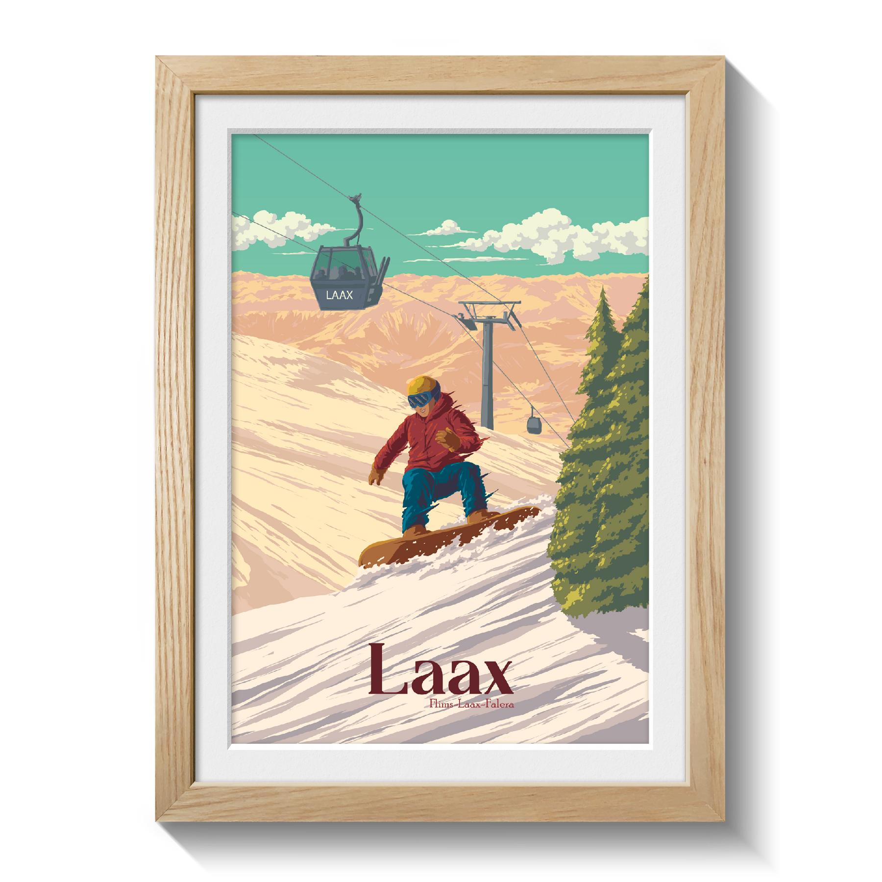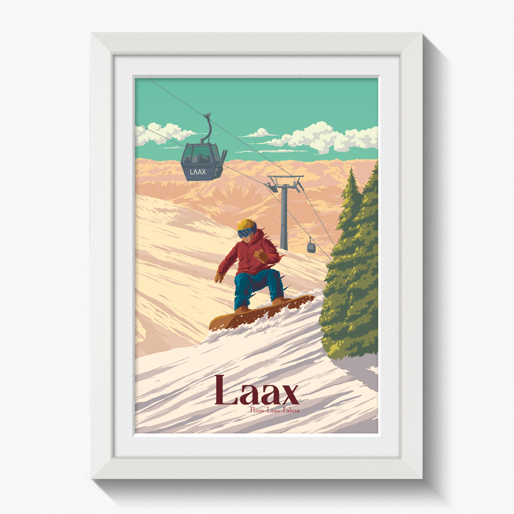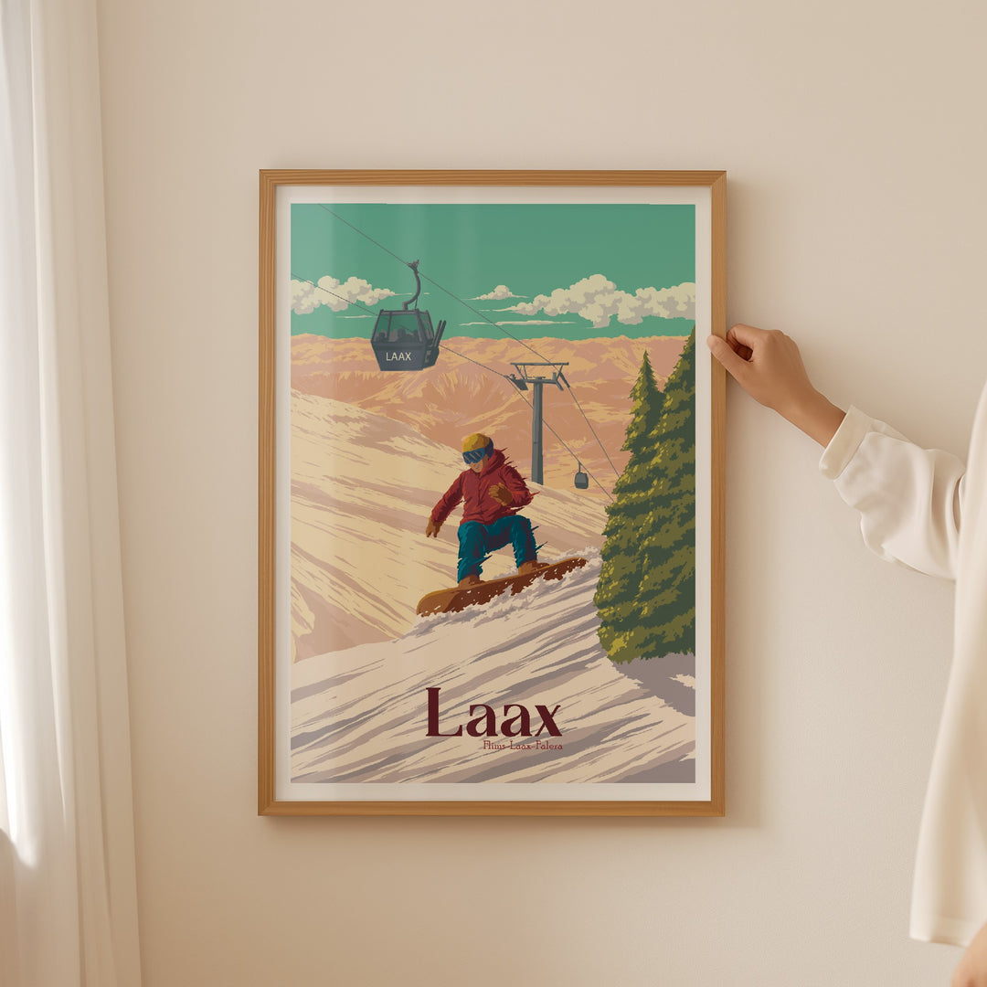 An original snowboarding travel poster featuring the Swiss ski resort of Laax in the 'Flims Laax Falera' ski area of the Swiss Alps.