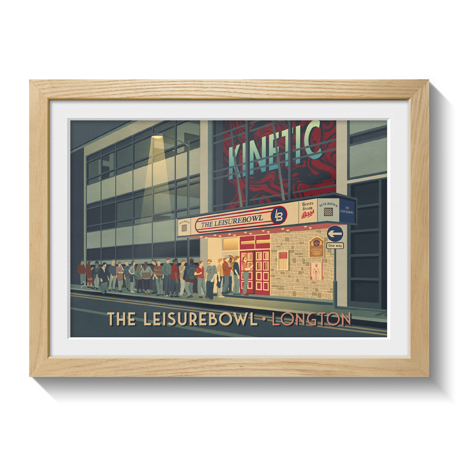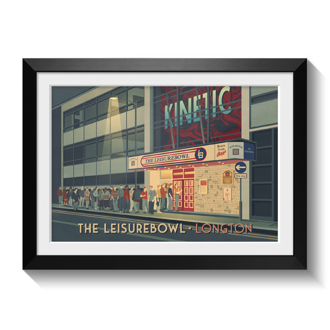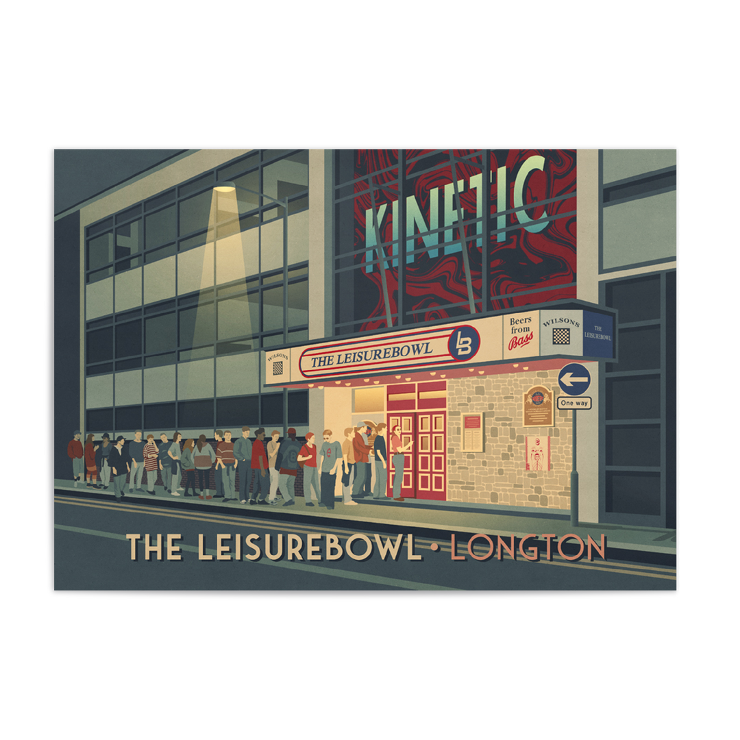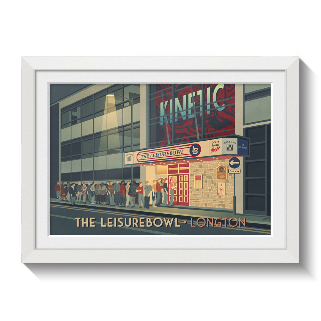 An original travel poster featuring The Leisurebowl in Longton, home to legendary event, Kinetic. The Leisurebowl was a favourite rave venue and hosted many famous DJs in its short history.