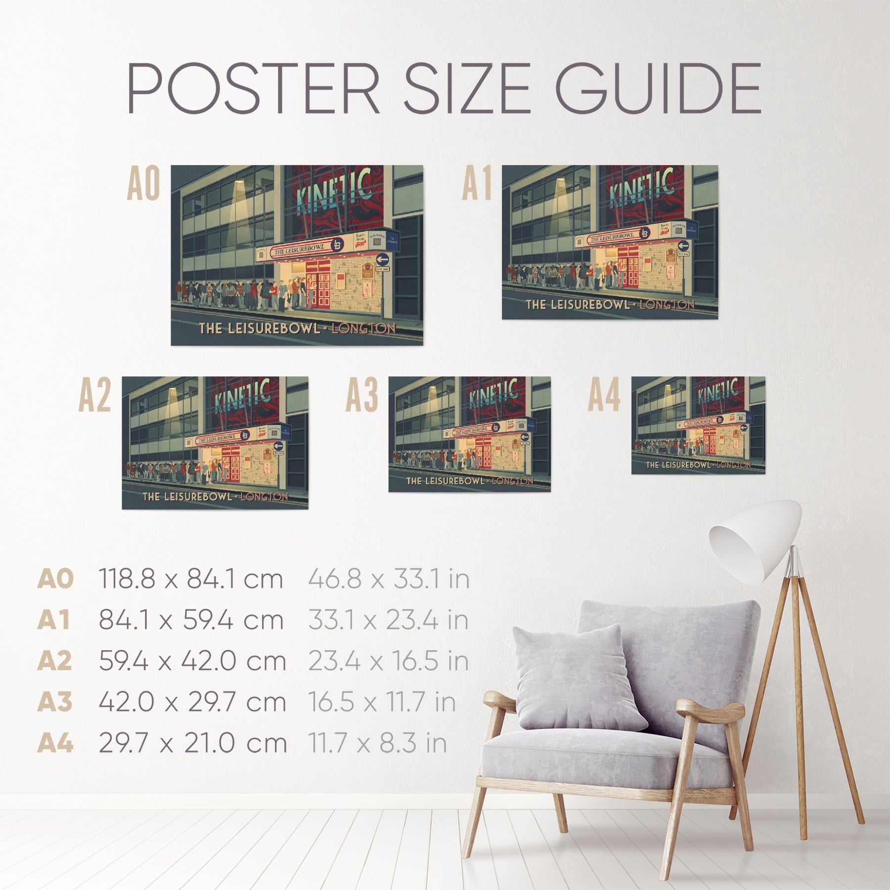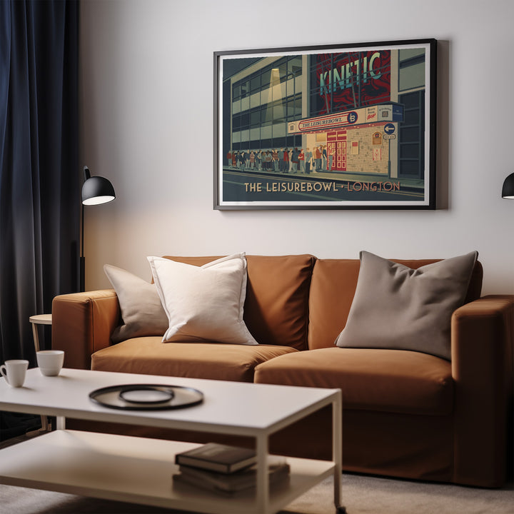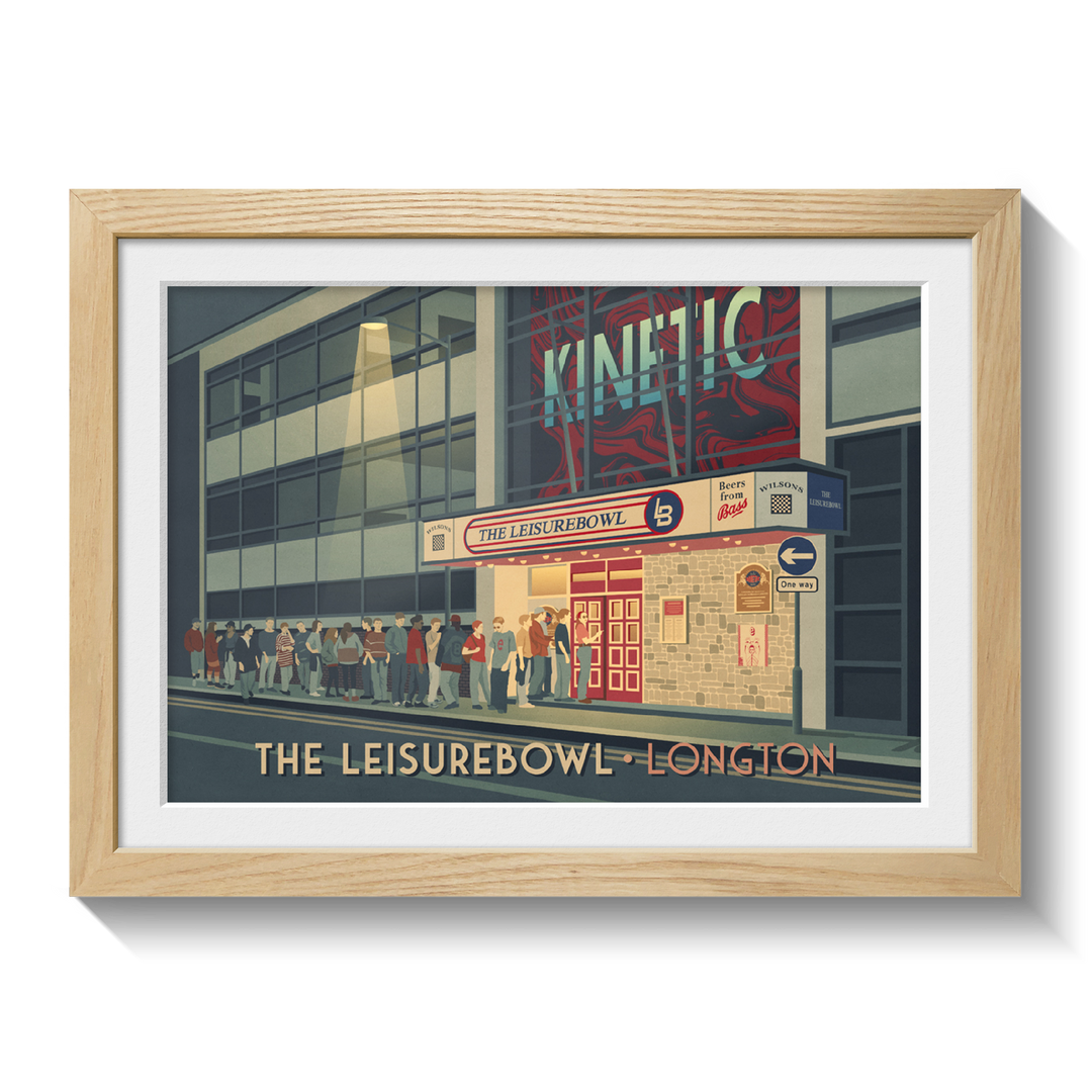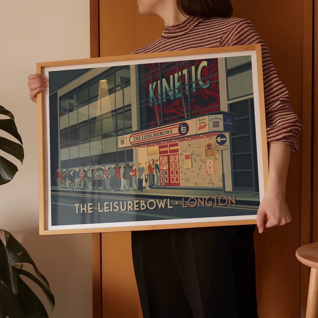 An original travel poster featuring The Leisurebowl in Longton, home to legendary event, Kinetic. The Leisurebowl was a favourite rave venue and hosted many famous DJs in its short history.
