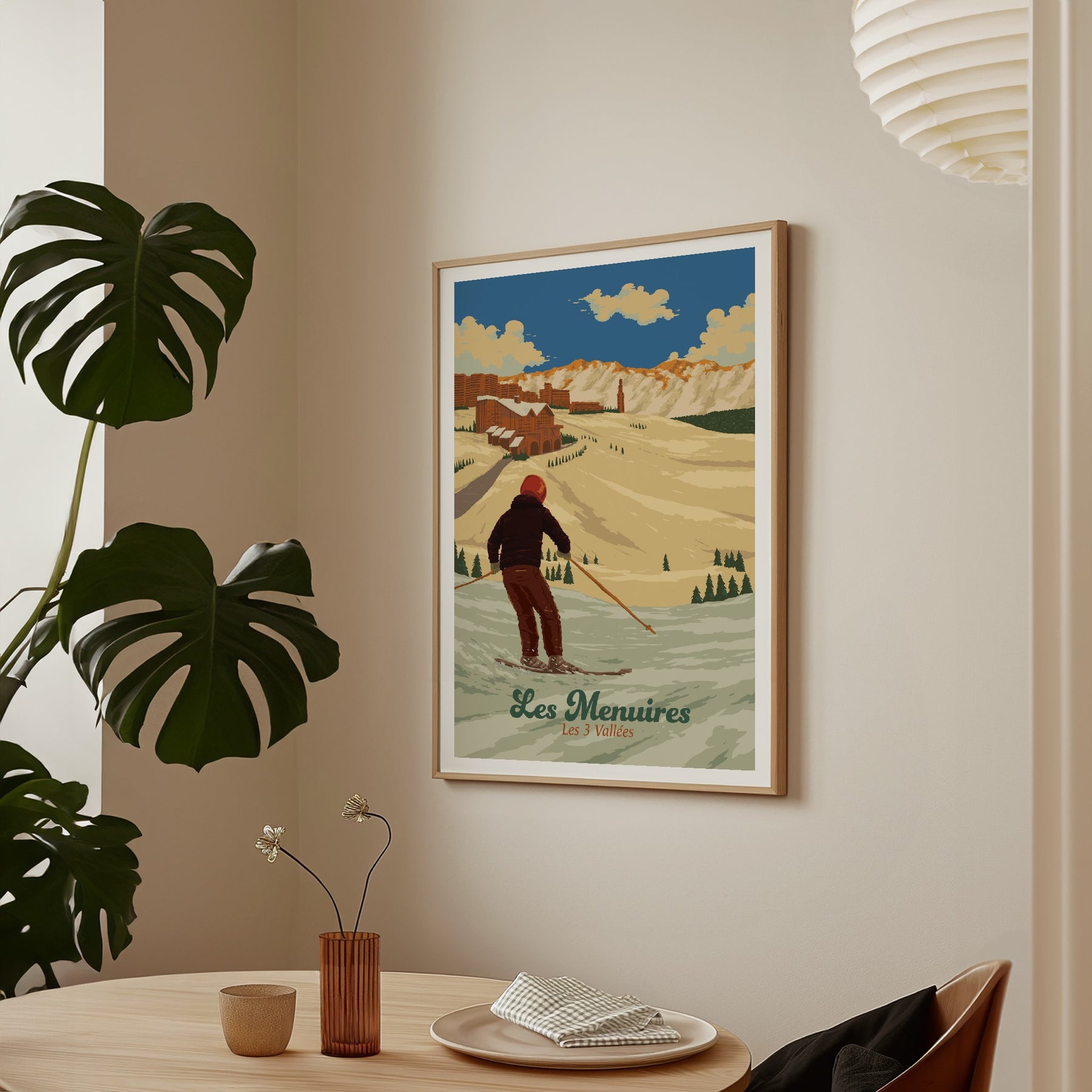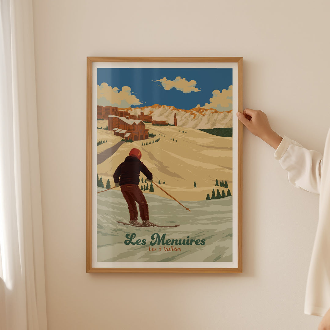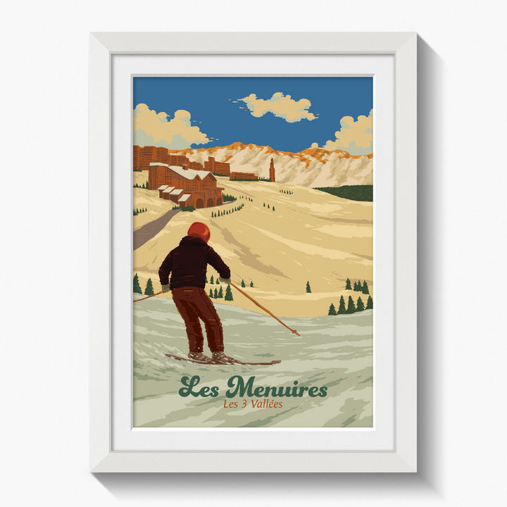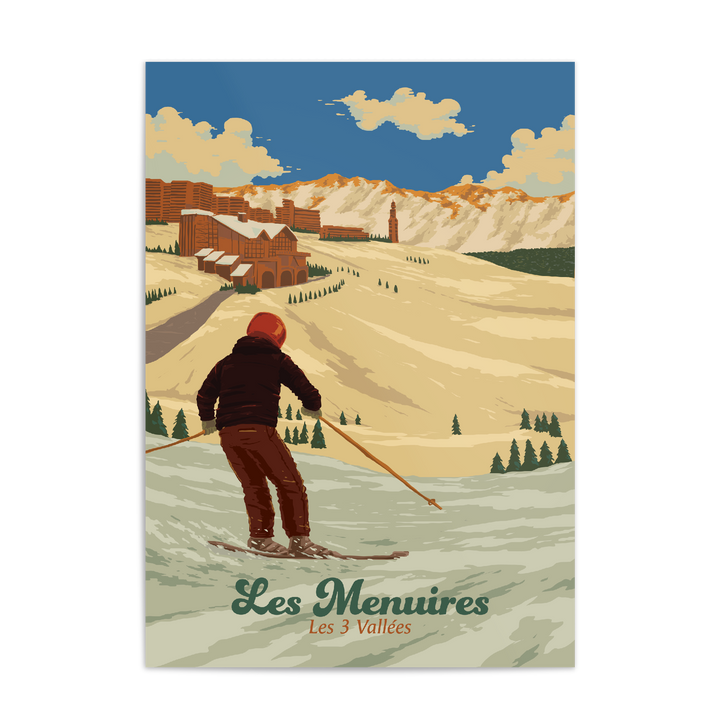 This is an original travel poster featuring the French ski resort of Les Menuires in the Trois Vallees area of the French Alps.
