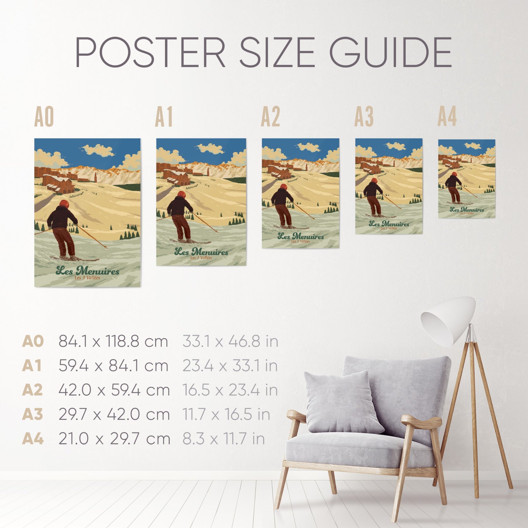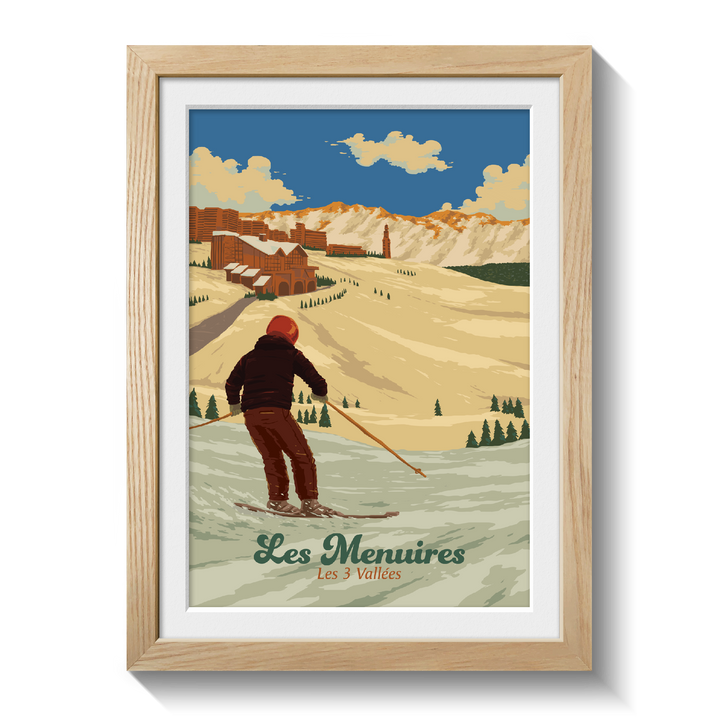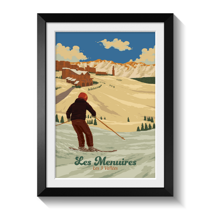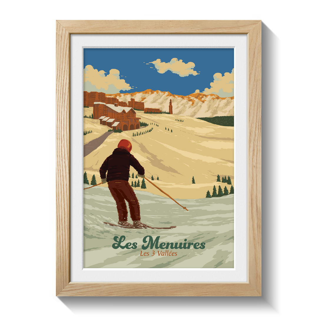 This is an original travel poster featuring the French ski resort of Les Menuires in the Trois Vallees area of the French Alps.