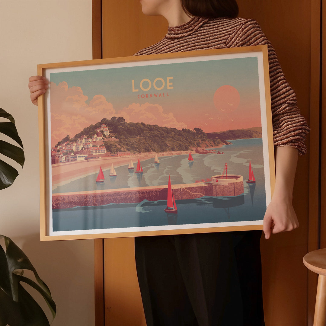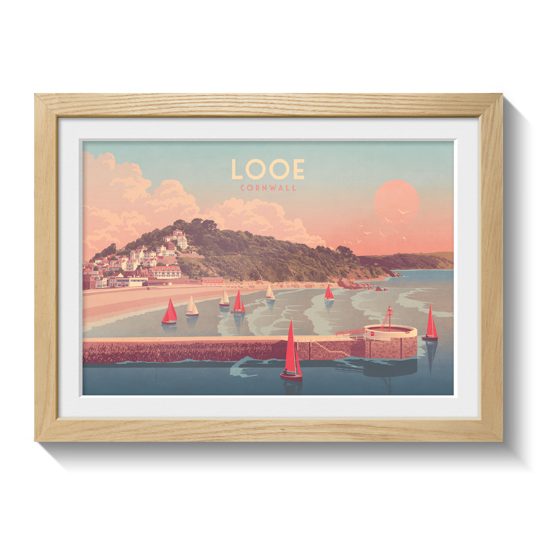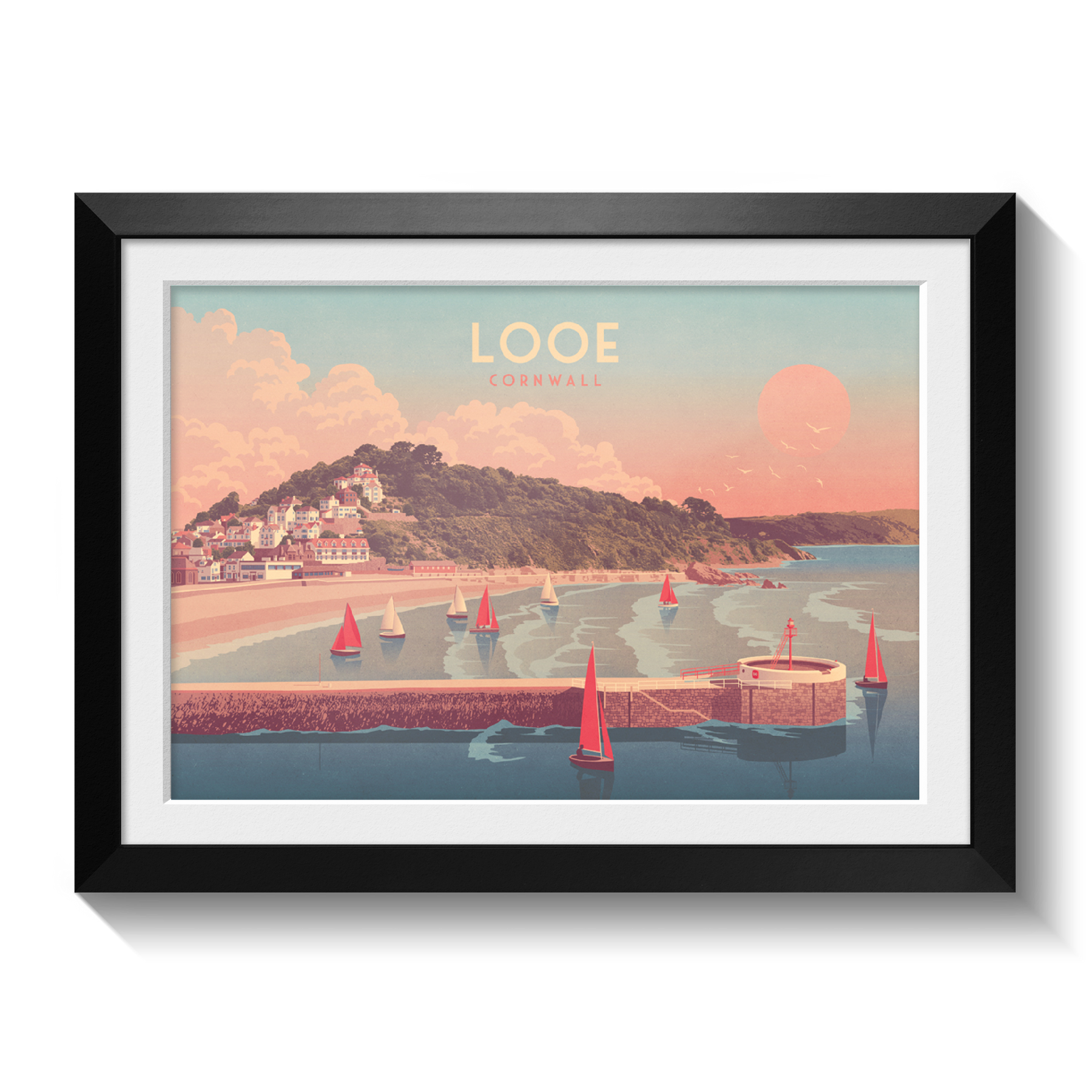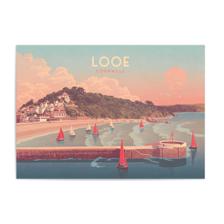 Original travel poster featuring the iconic Banjo Pier in Looe, Cornwall, named as it is roughly banjo shaped when viewed from above. It is located on the east side of the Looe river mouth and the breakwater protects boats from stormy seas.