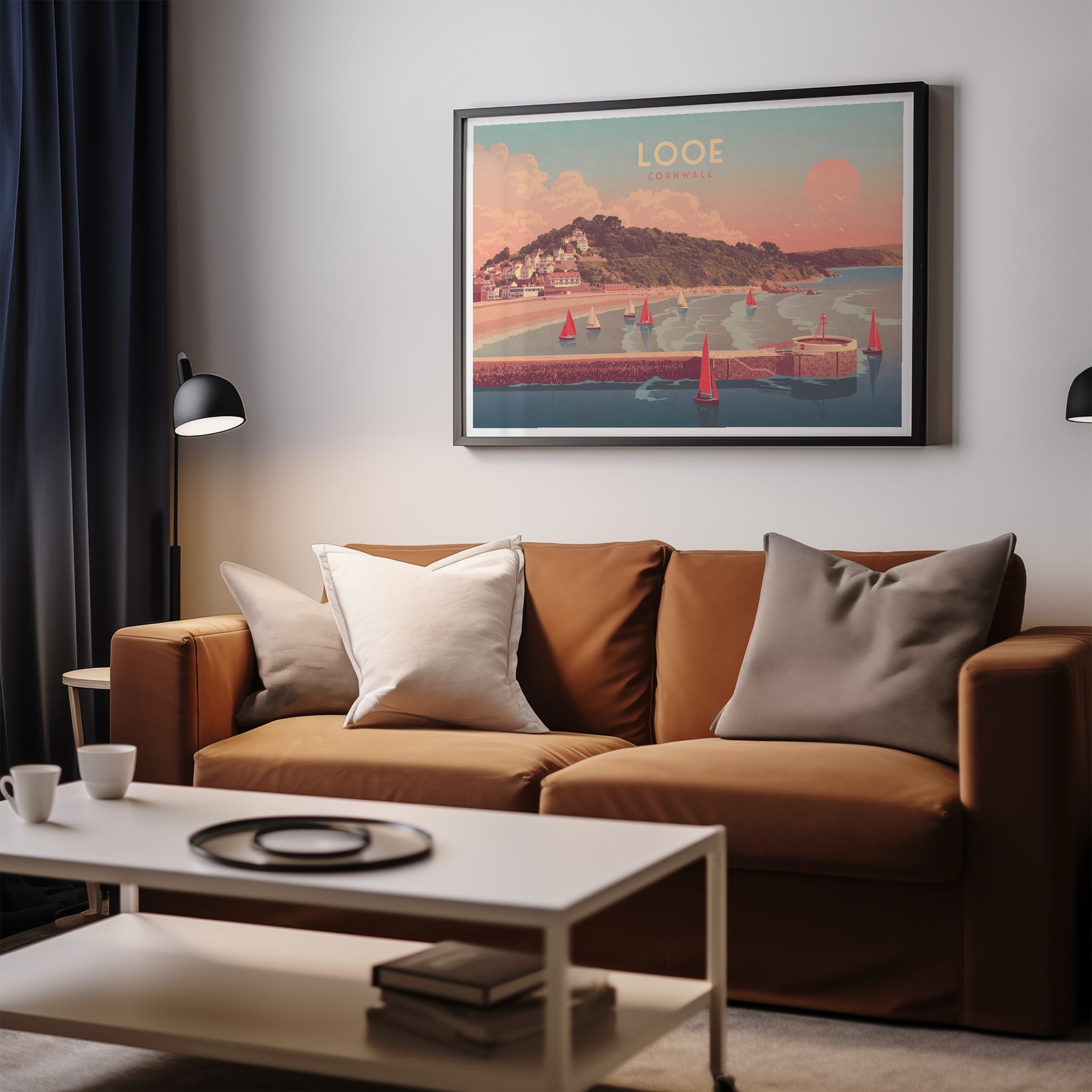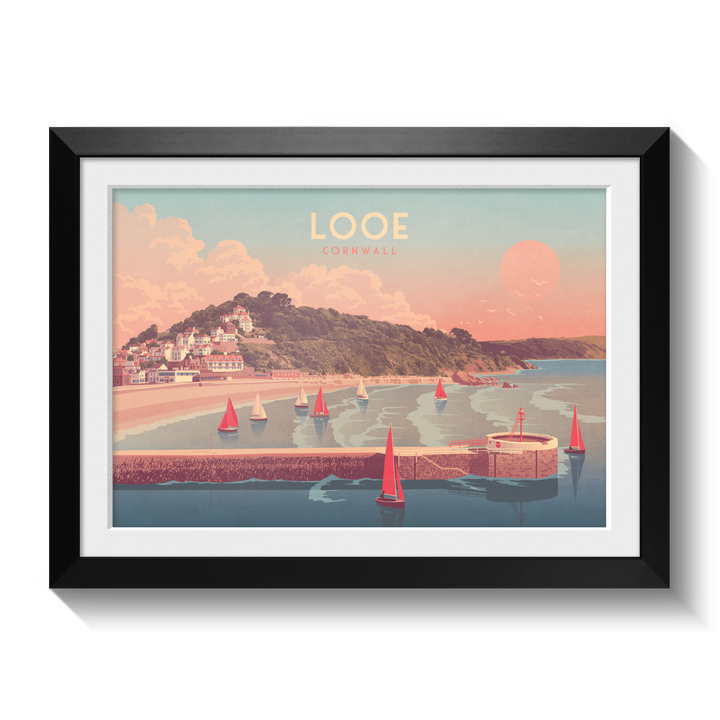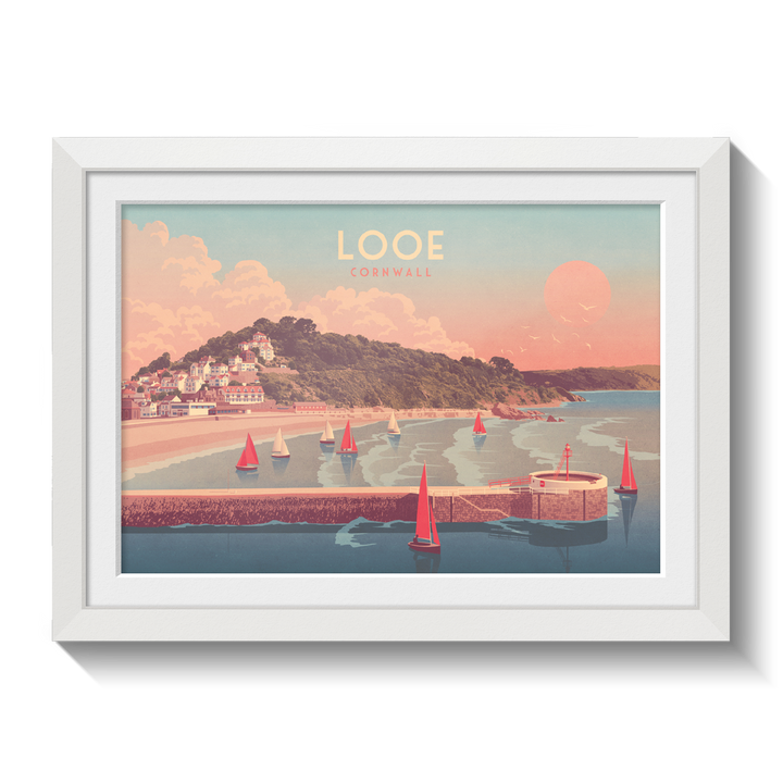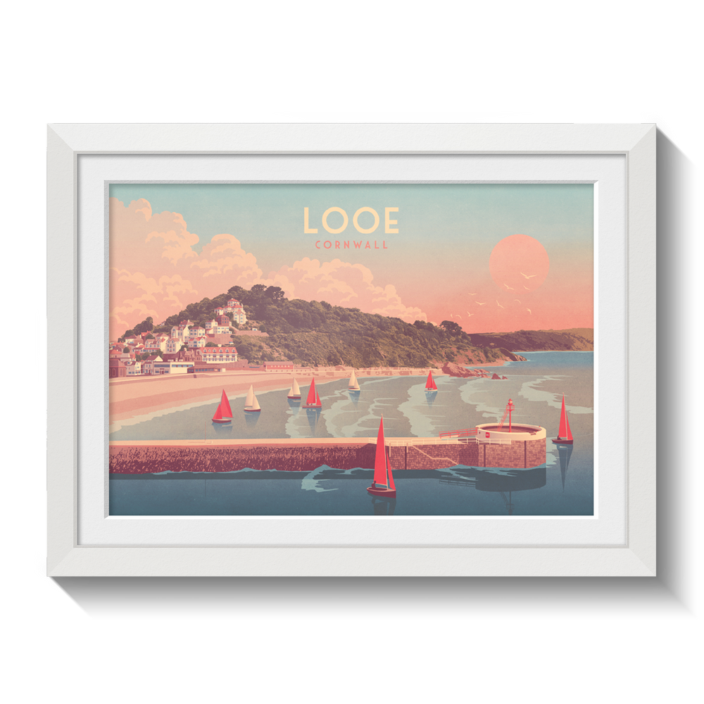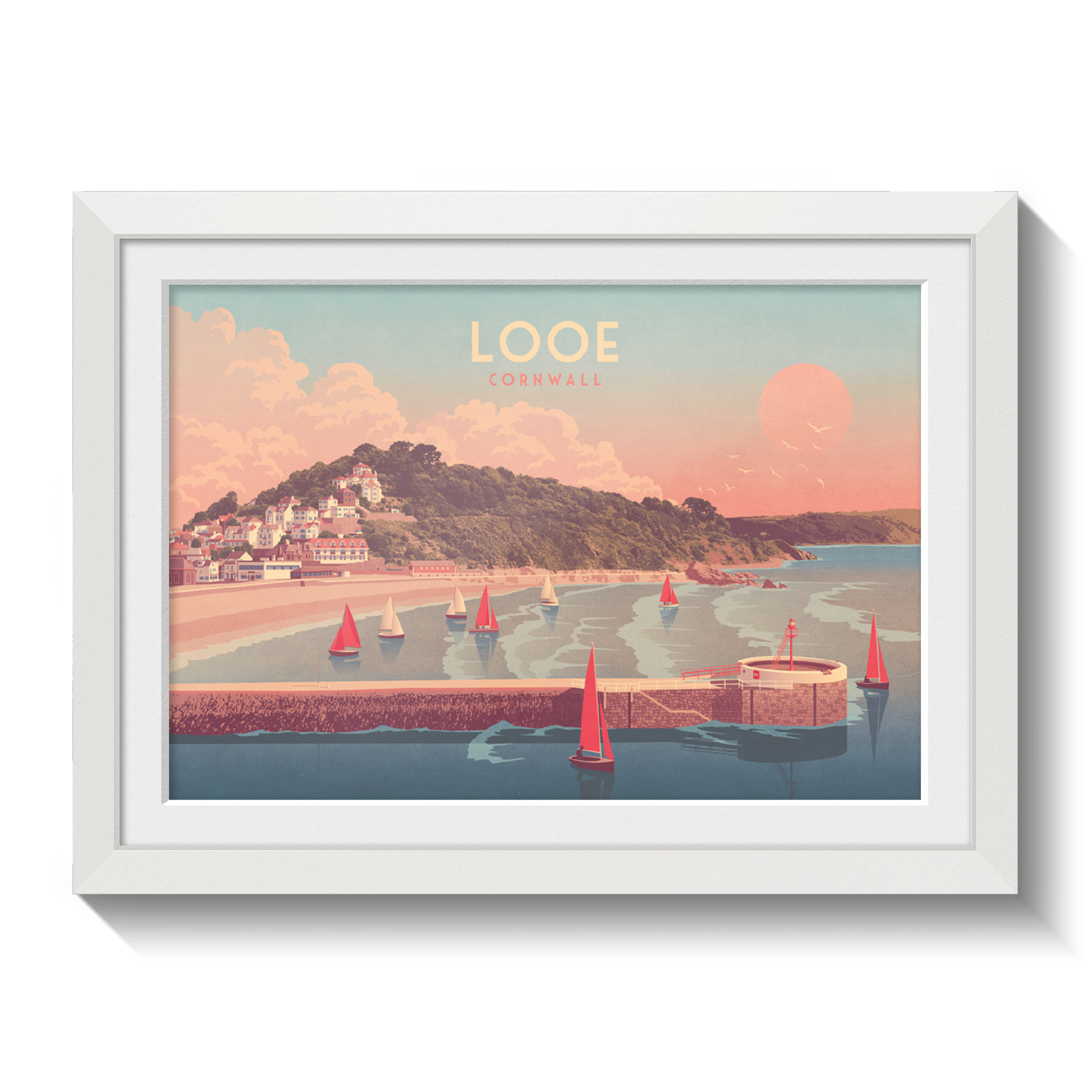 Original travel poster featuring the iconic Banjo Pier in Looe, Cornwall, named as it is roughly banjo shaped when viewed from above. It is located on the east side of the Looe river mouth and the breakwater protects boats from stormy seas.