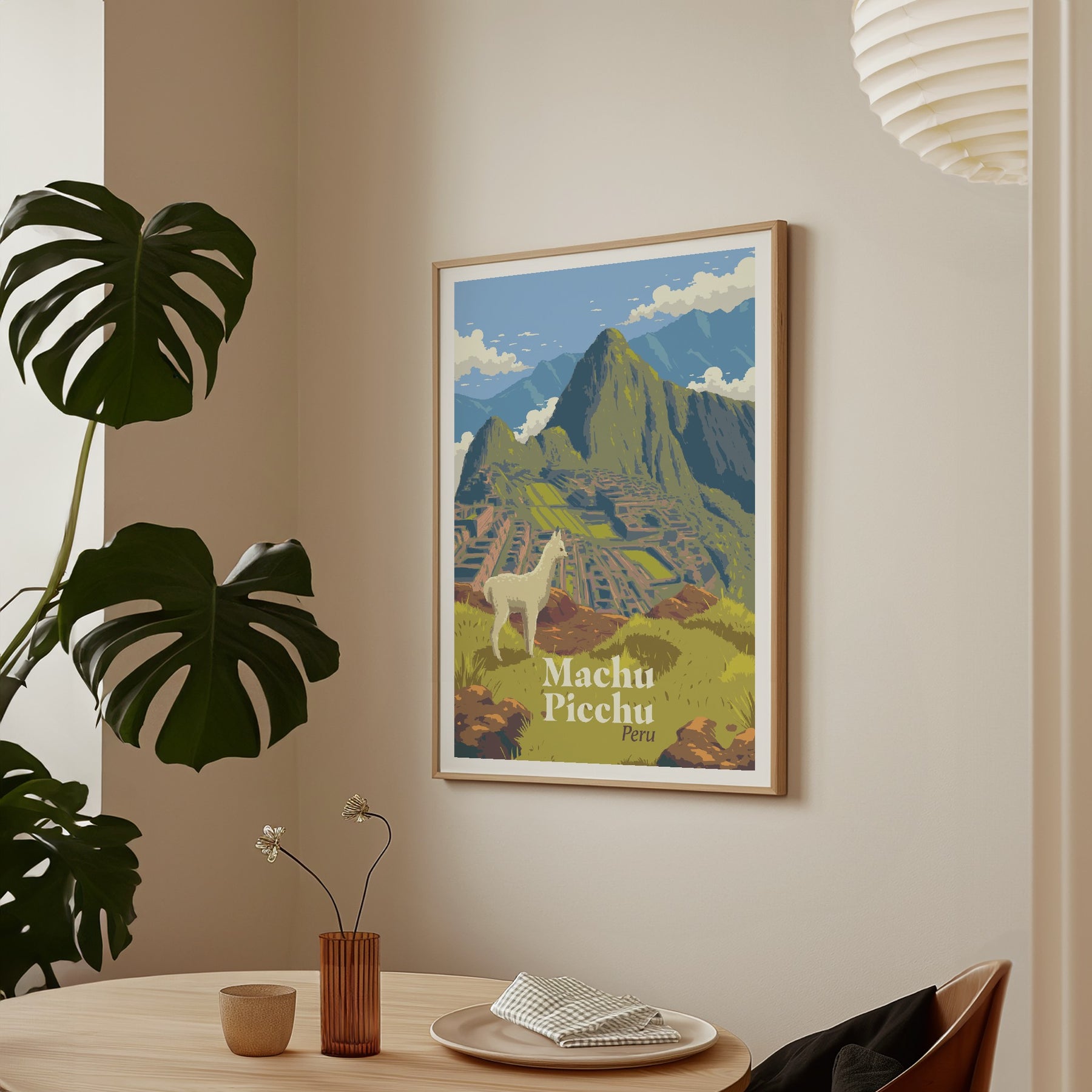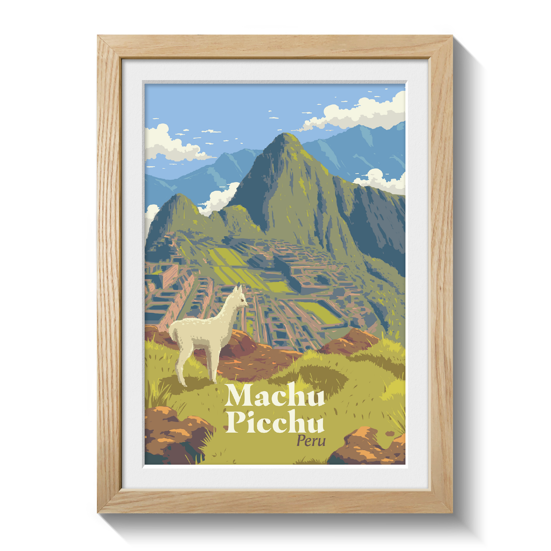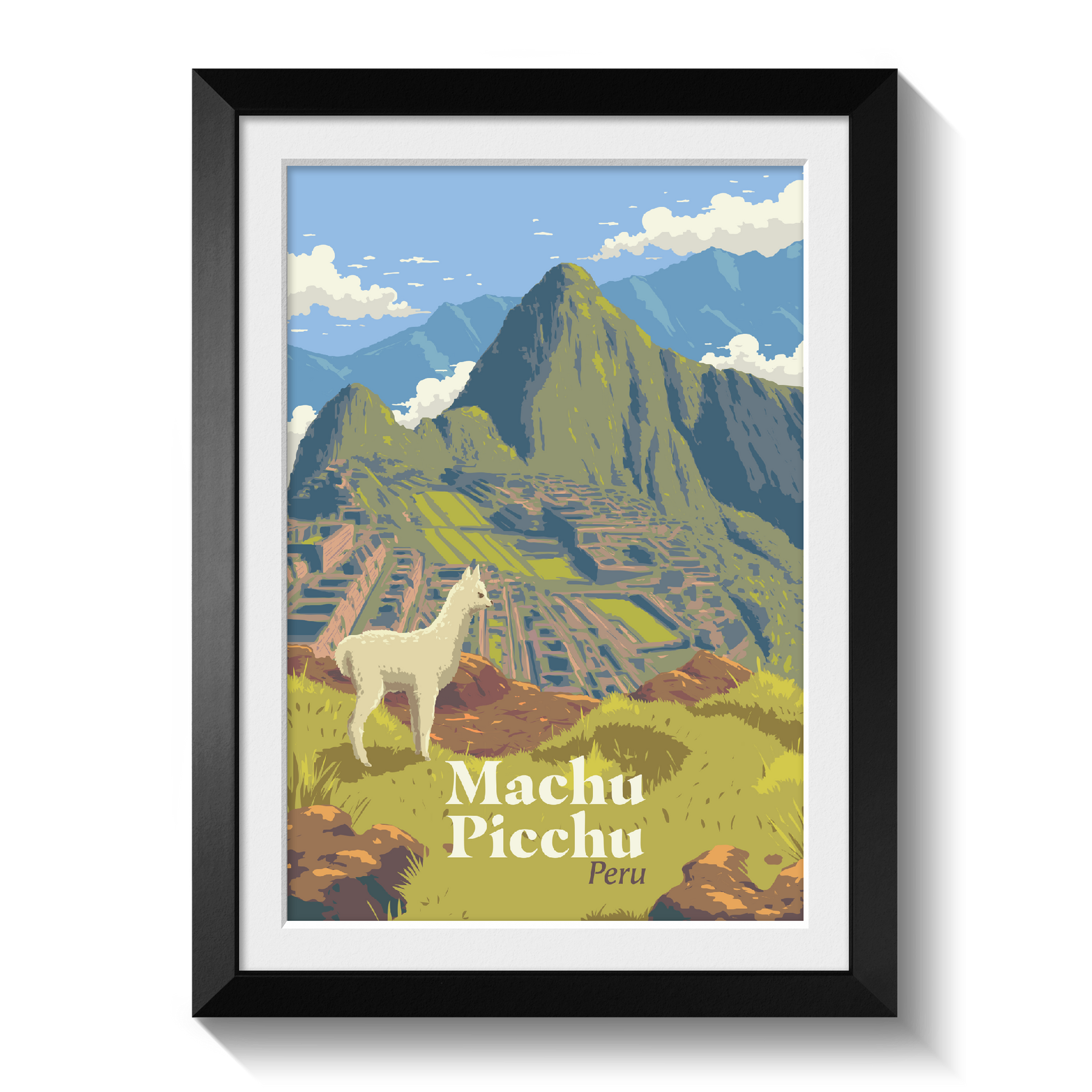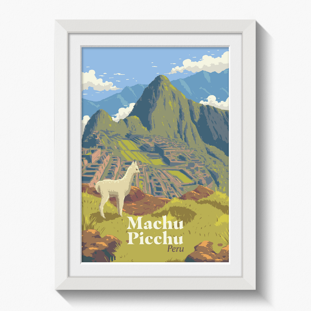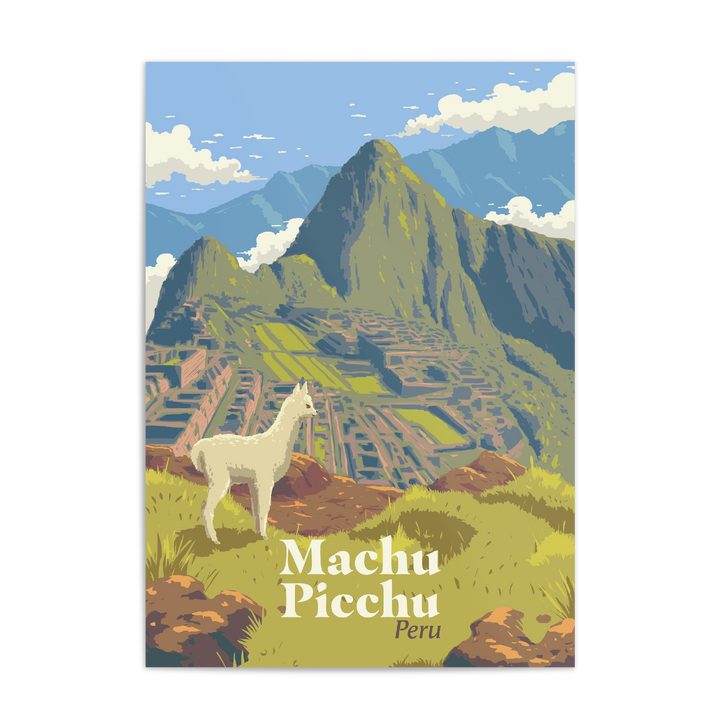 travel poster featuring the mystical Machu Picchu ruins, high up on the slopes of the Andes.