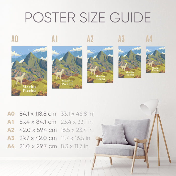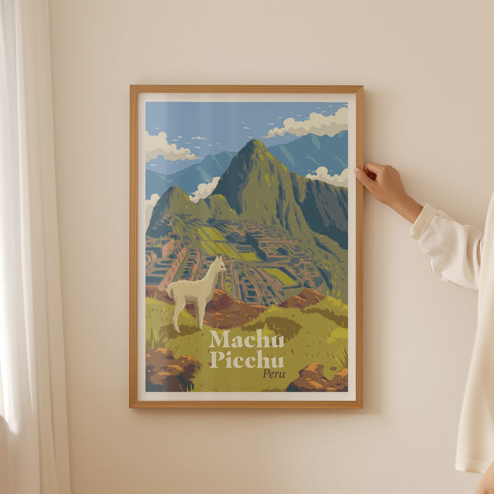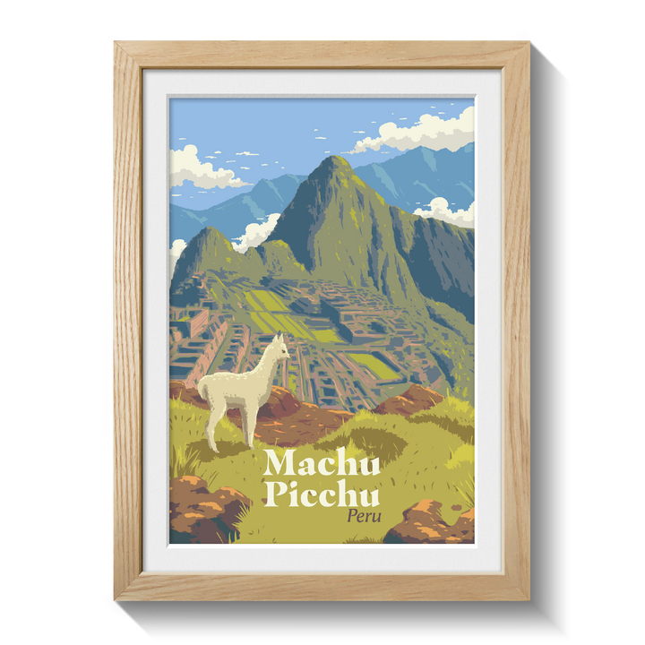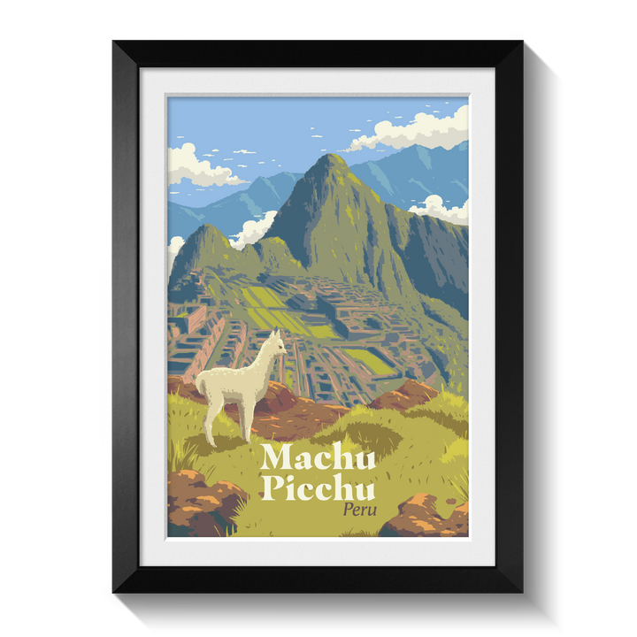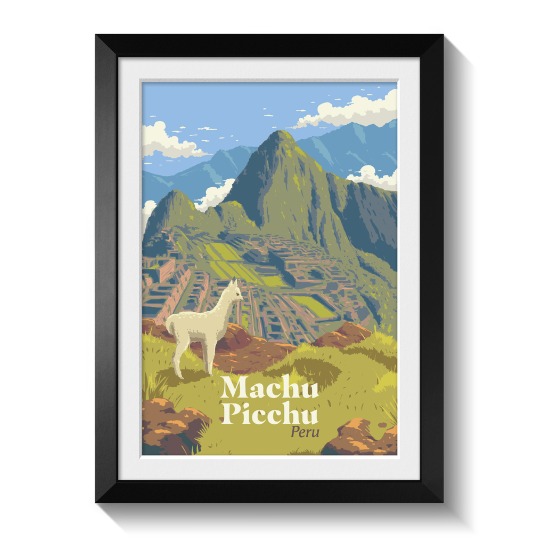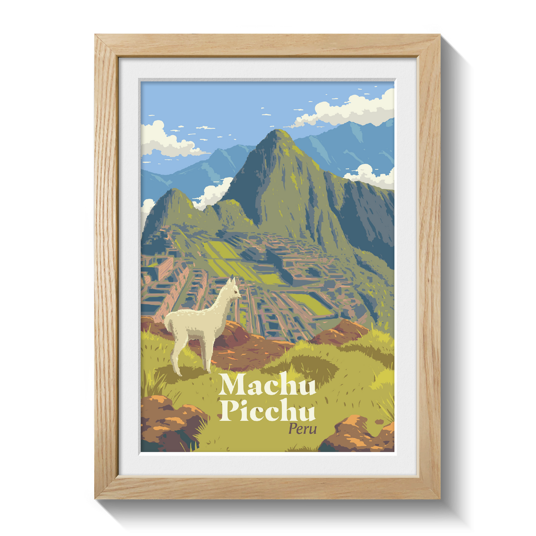 travel poster featuring the mystical Machu Picchu ruins, high up on the slopes of the Andes.
