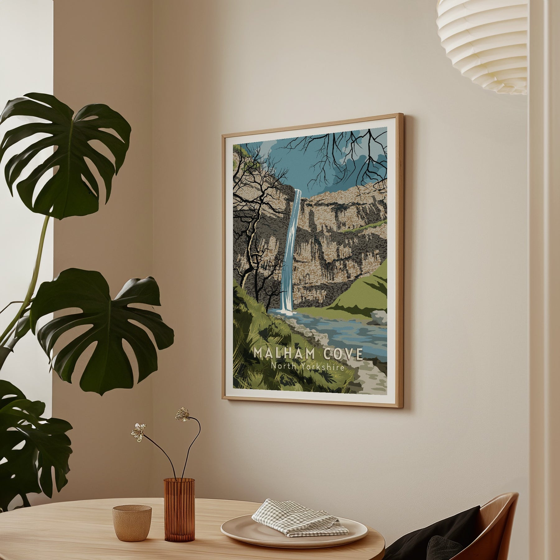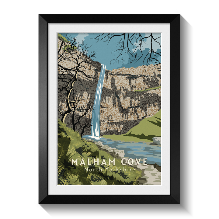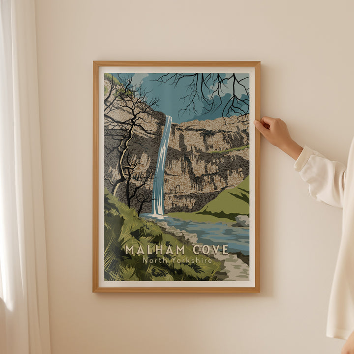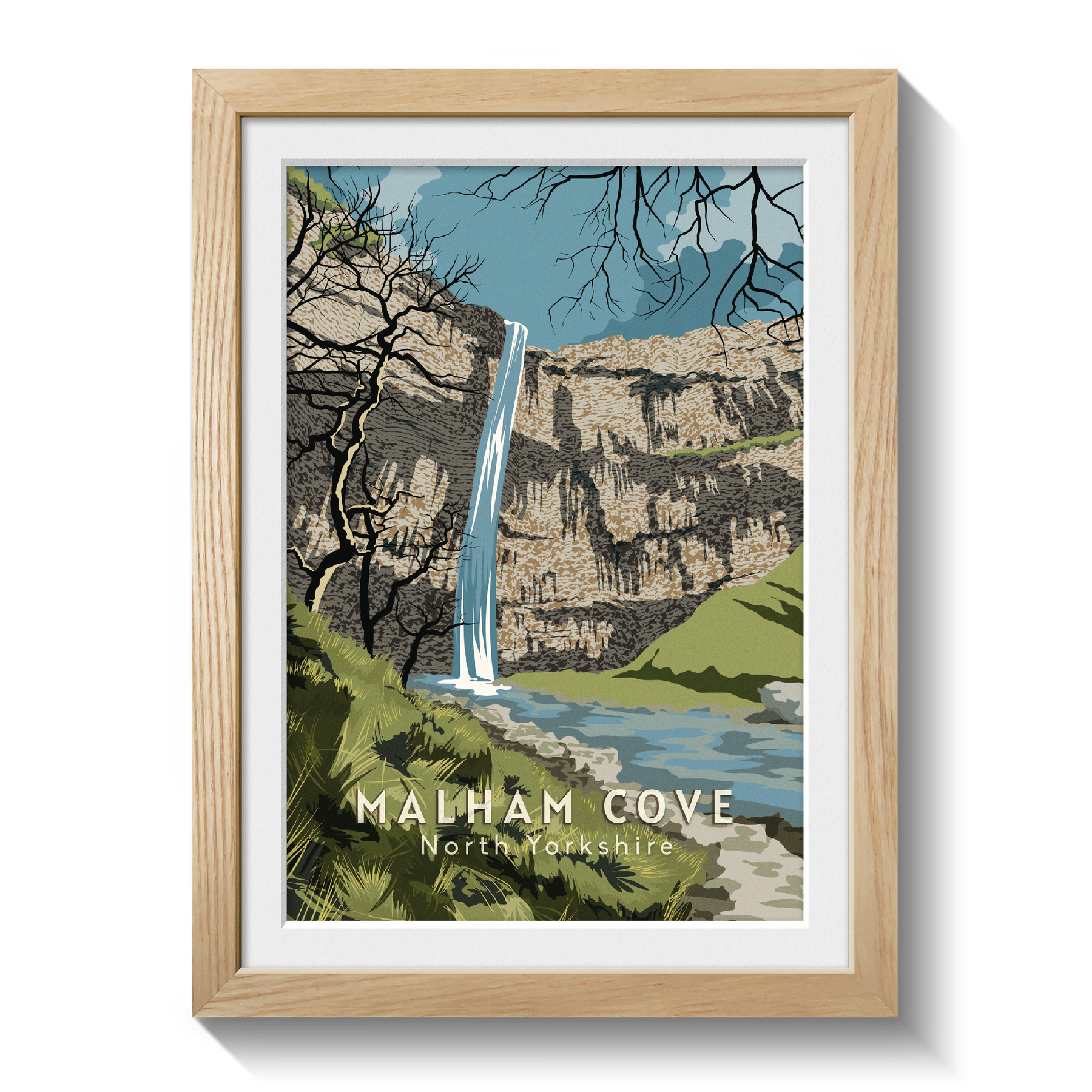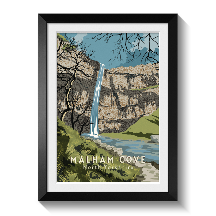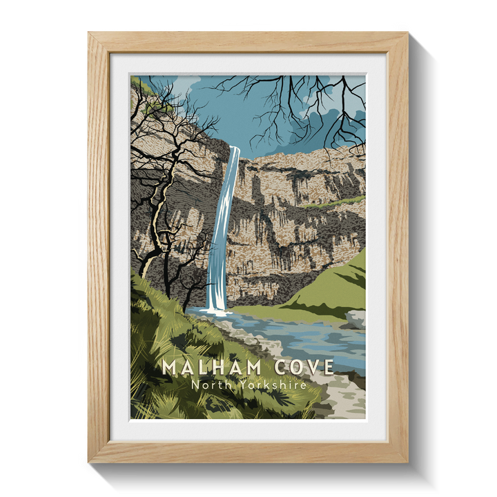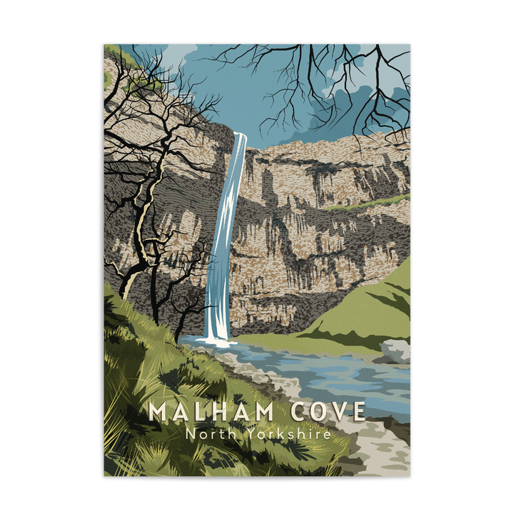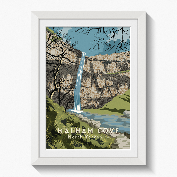 An original travel print featuring the iconic limestone rocks of Malham Cove in the Yorkshire Dales, North Yorkshire.