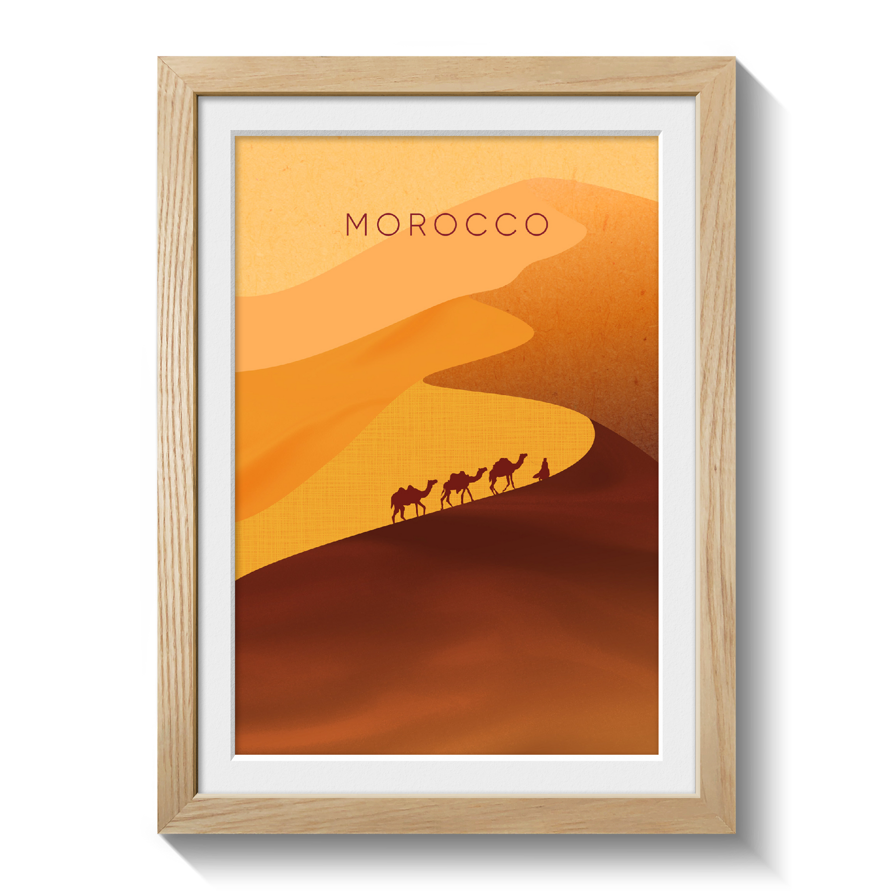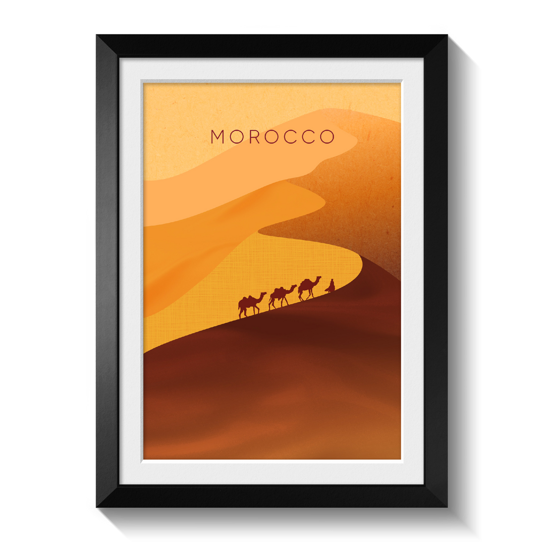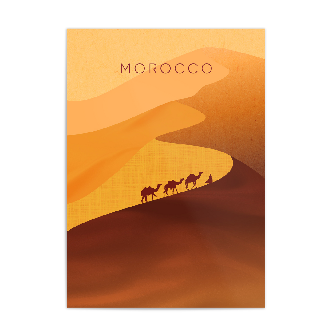 Original travel poster for Morocco, a country in North Africa. It features a typical desert scene with camels walking through the sand dunes. Morocco is known for its mixture of Berber, Arabian and European cultural influences, which makes it extremely unique.
