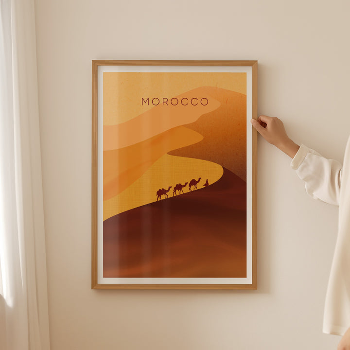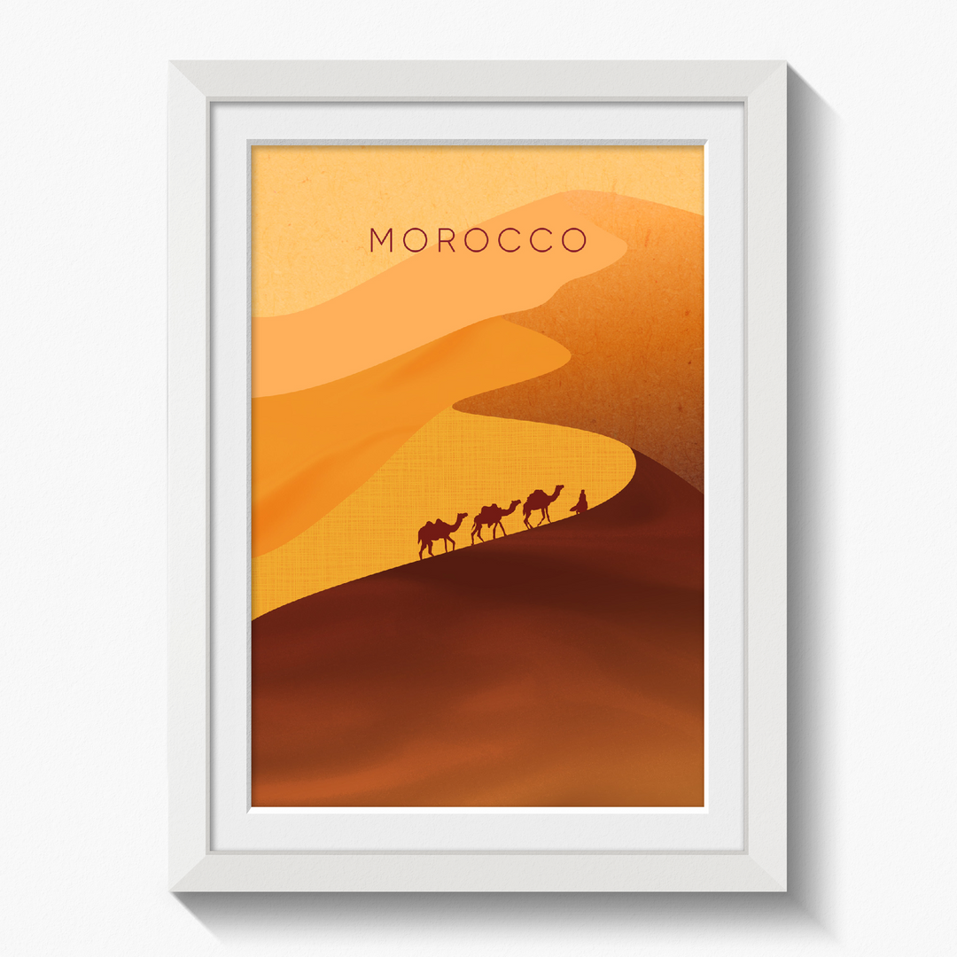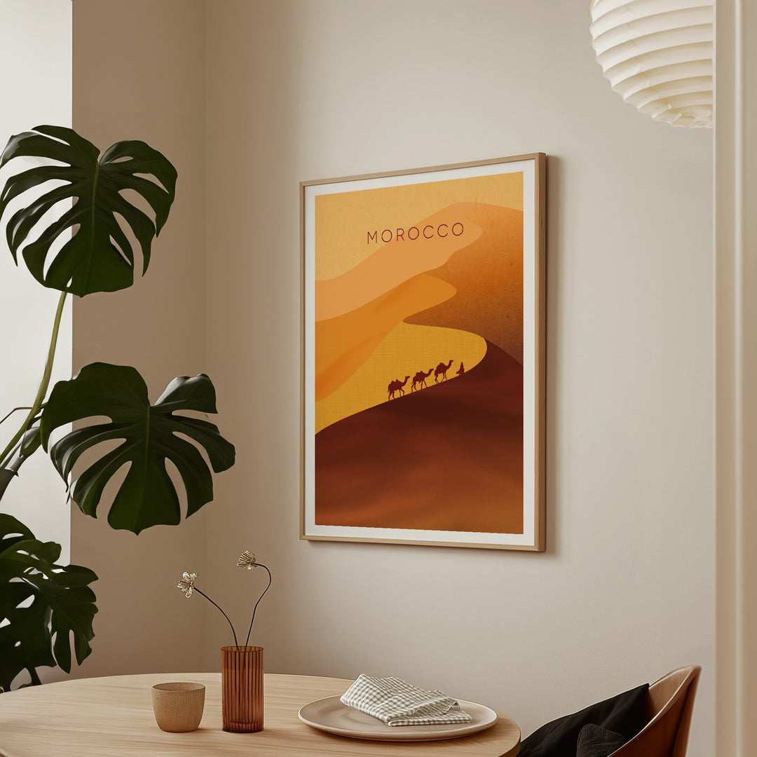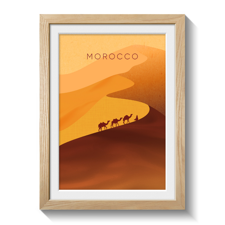 Original travel poster for Morocco, a country in North Africa. It features a typical desert scene with camels walking through the sand dunes. Morocco is known for its mixture of Berber, Arabian and European cultural influences, which makes it extremely unique.