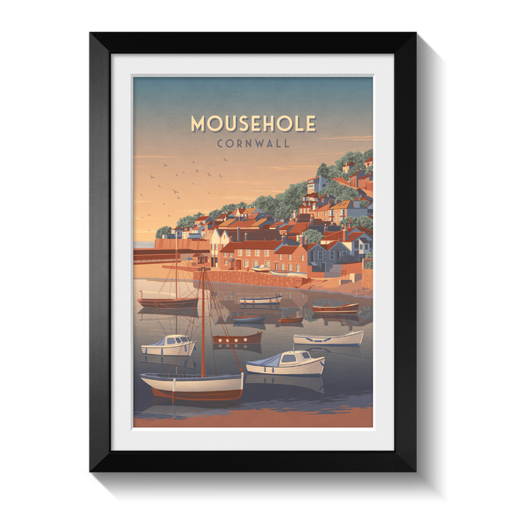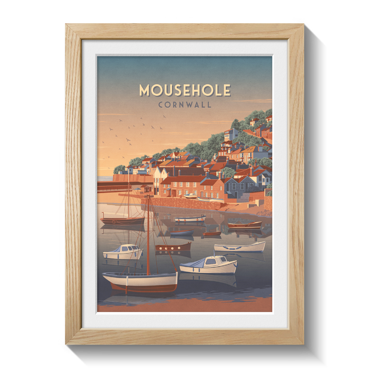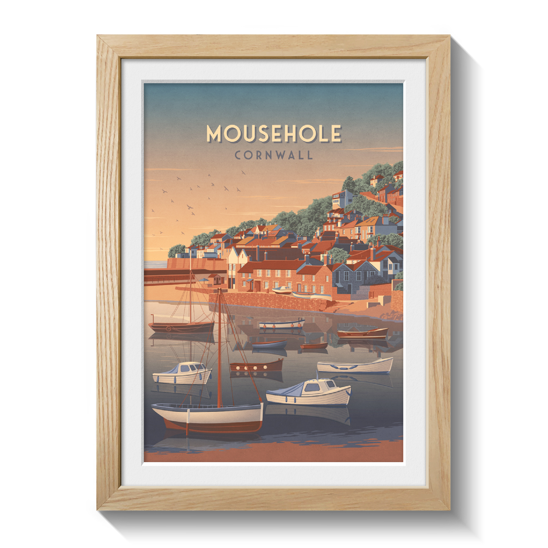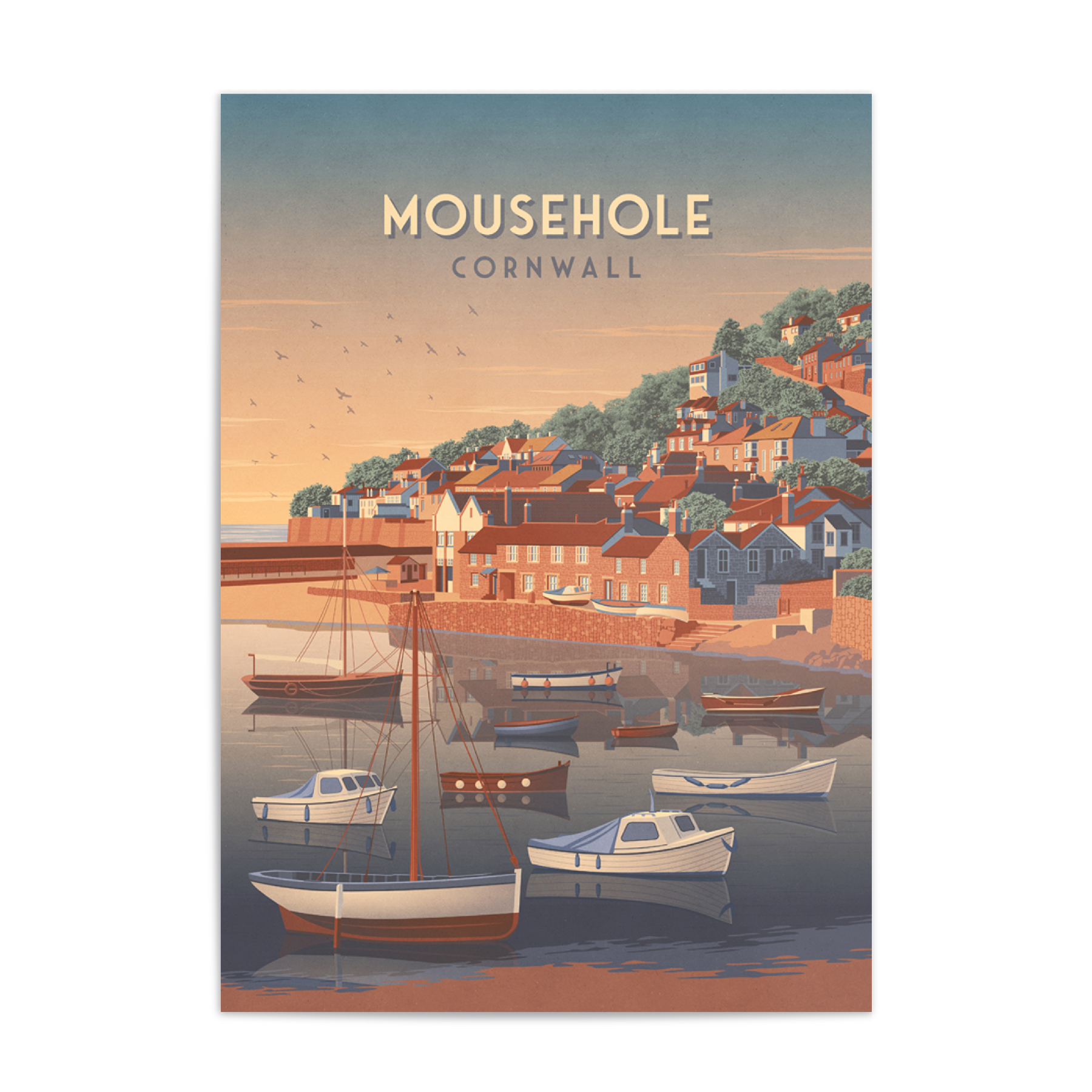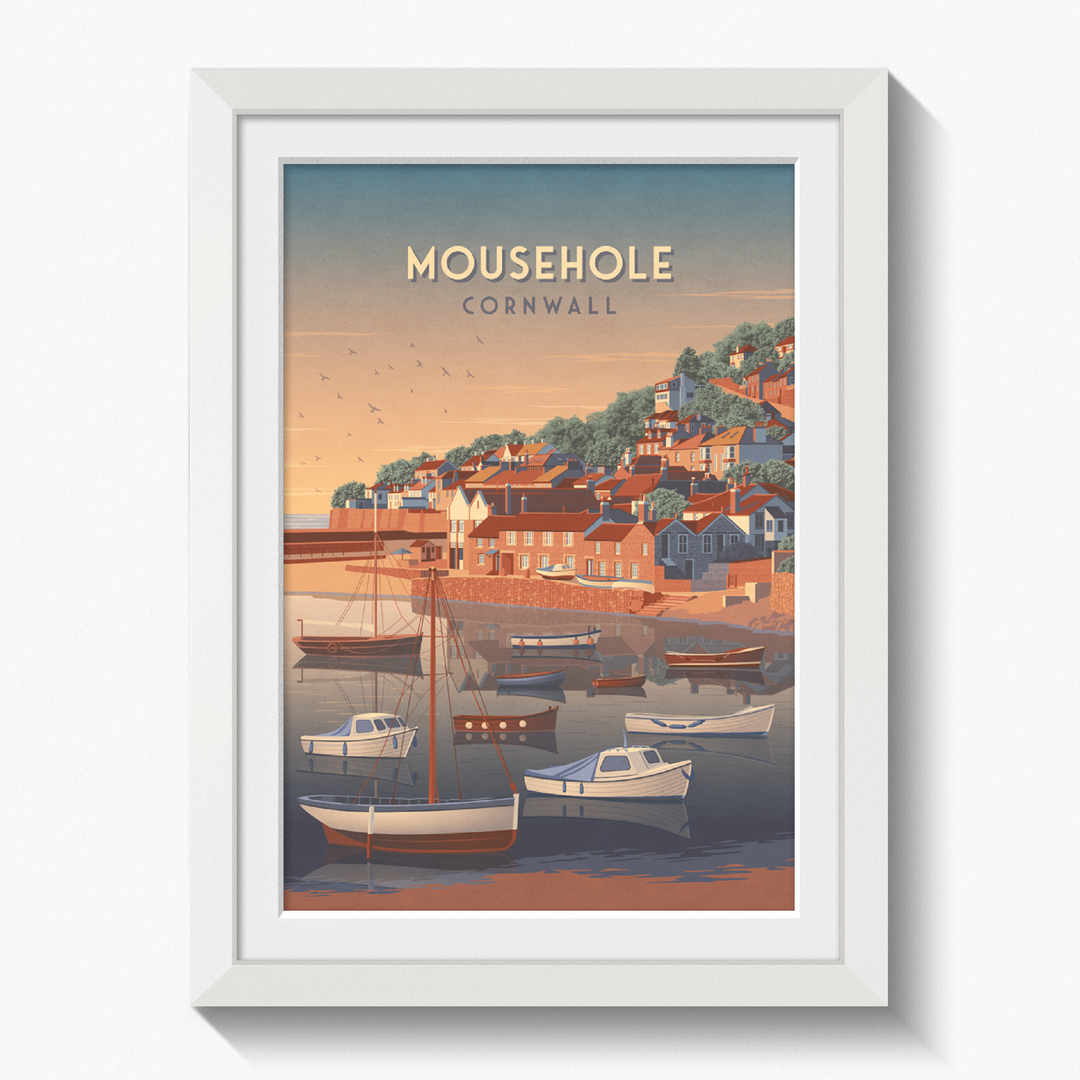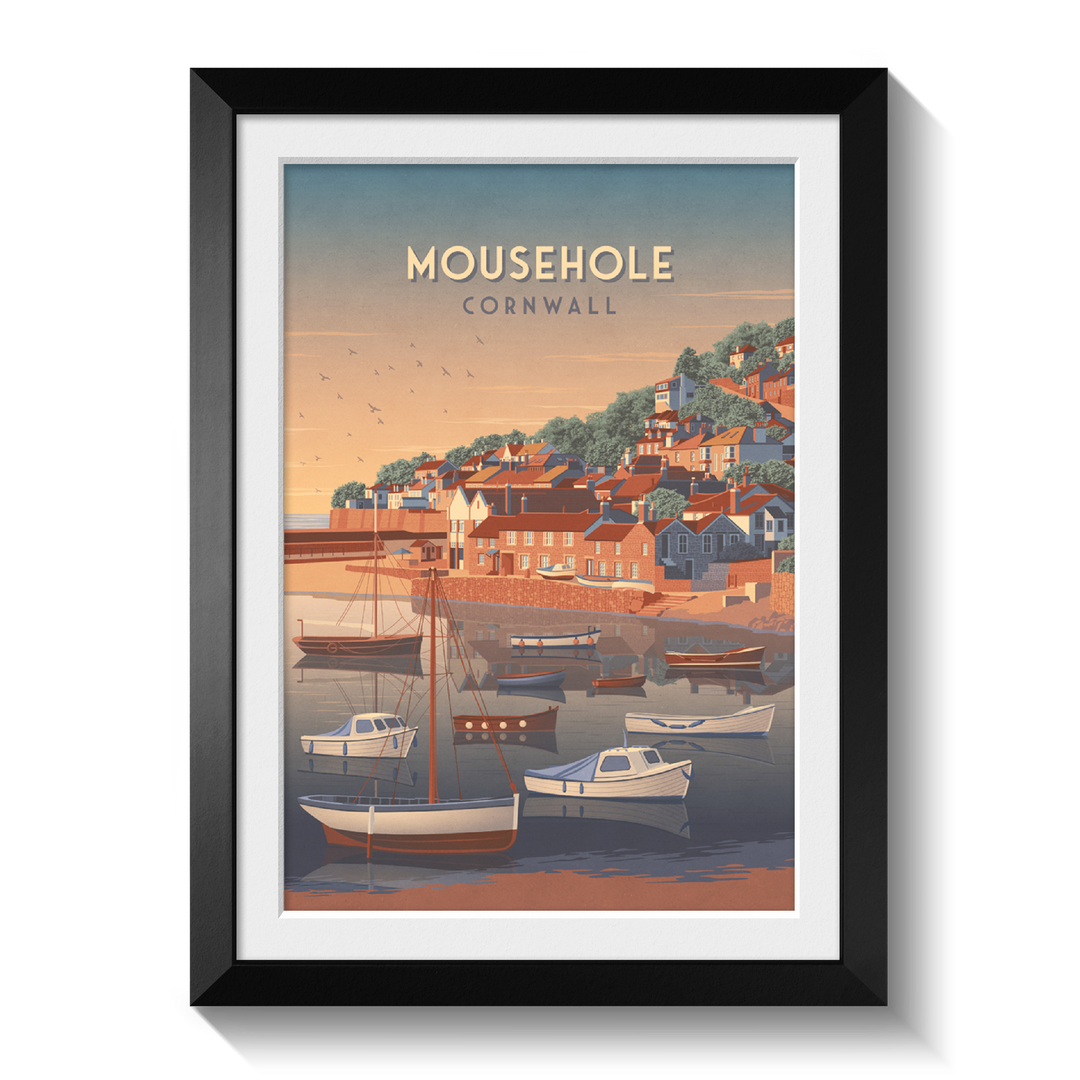 An original travel poster featuring the harbour and seafront in Mousehole, Cornwall. Mousehole is a picturesque fishing village on the south coast of Cornwall close to Penzance. It lies within the Cornwall Area of Outstanding Natural Beauty.