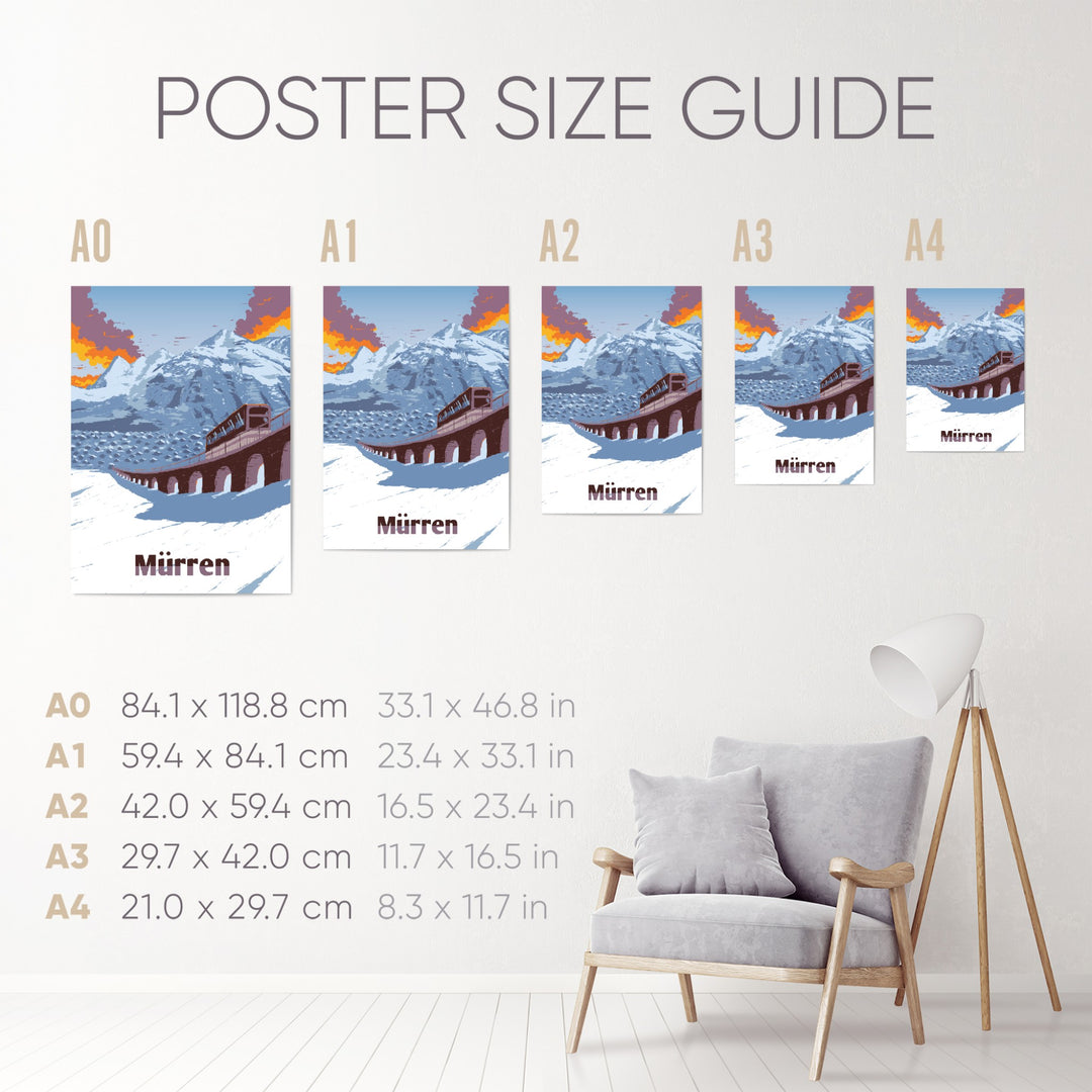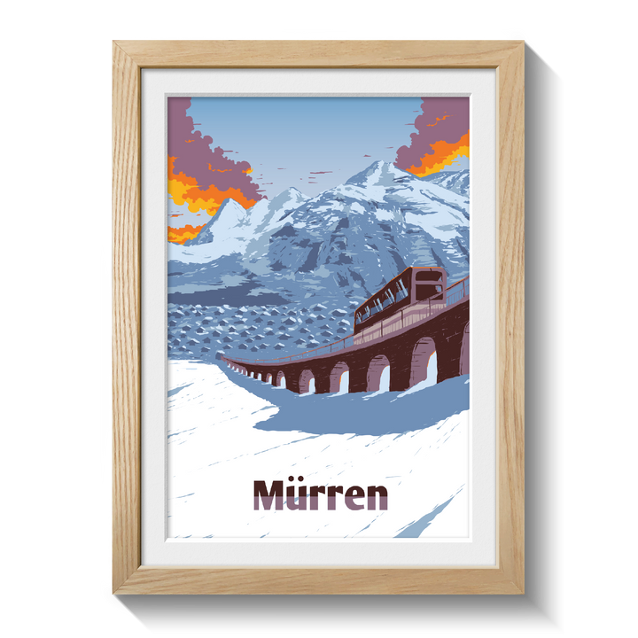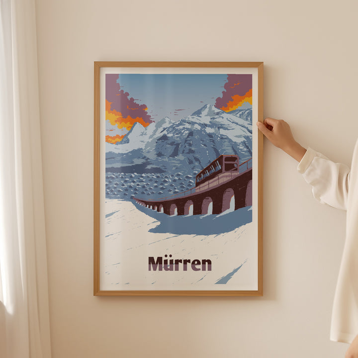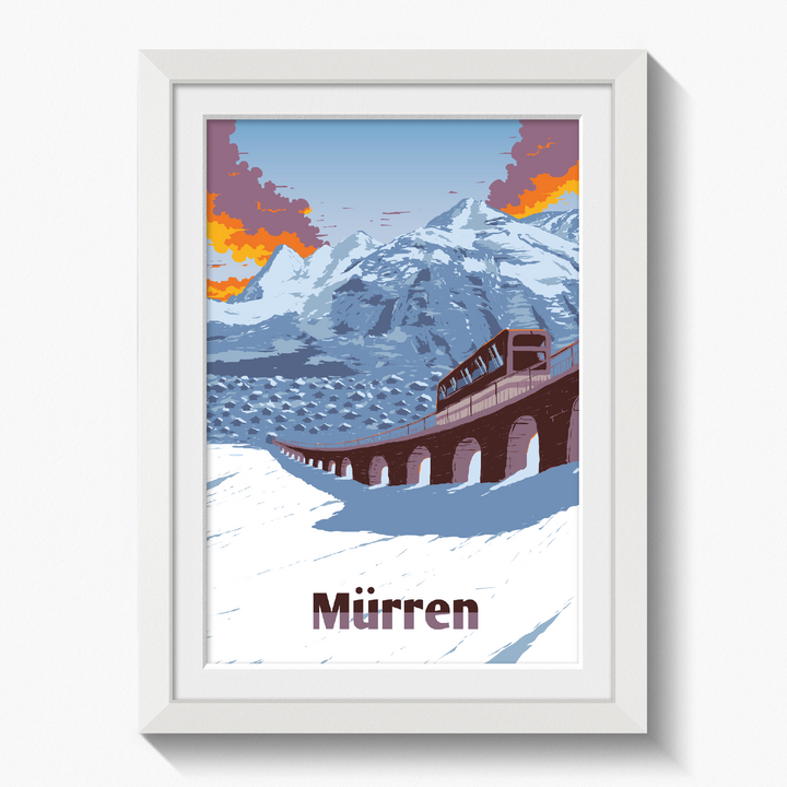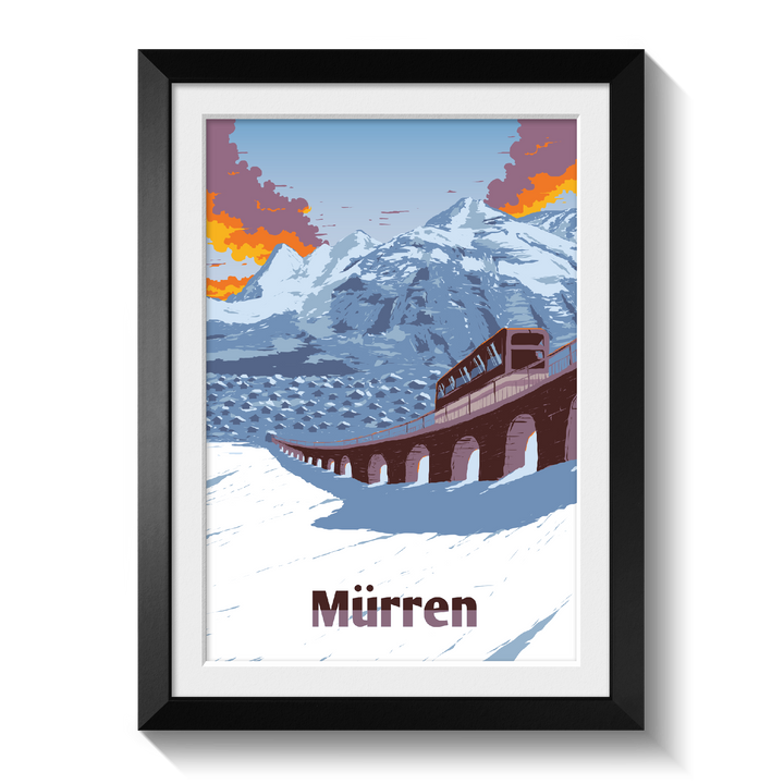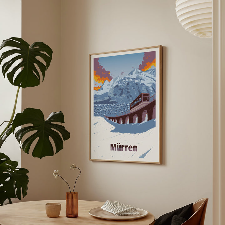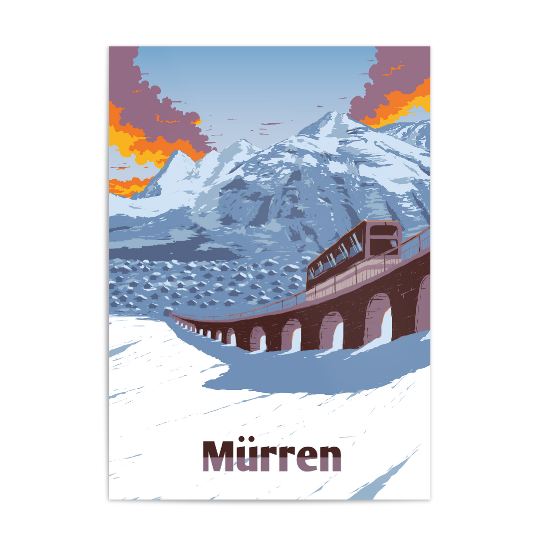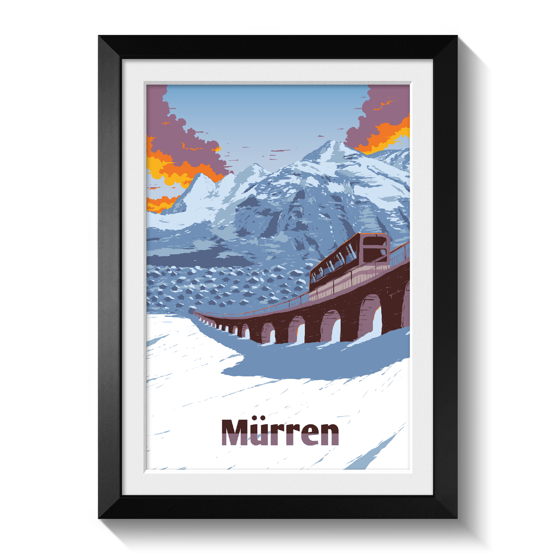 This is an original travel poster featuring the tiny Swiss Alpine village and ski resort of Murren.