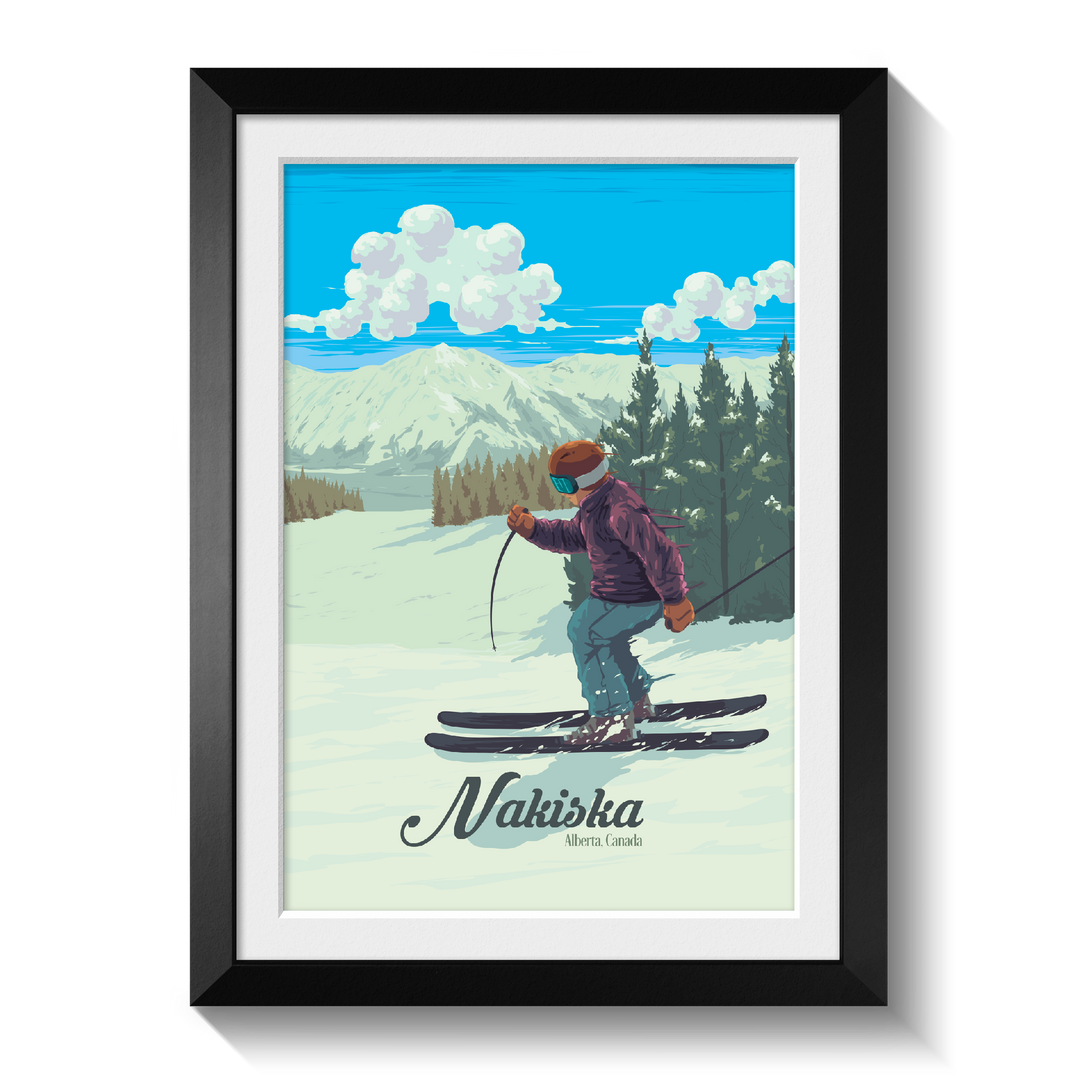 Original travel poster featuring the ski resort of Nakiska located in Alberta Canada. Nakiska is a popular resort, in part due to its close proximity to Calgary.