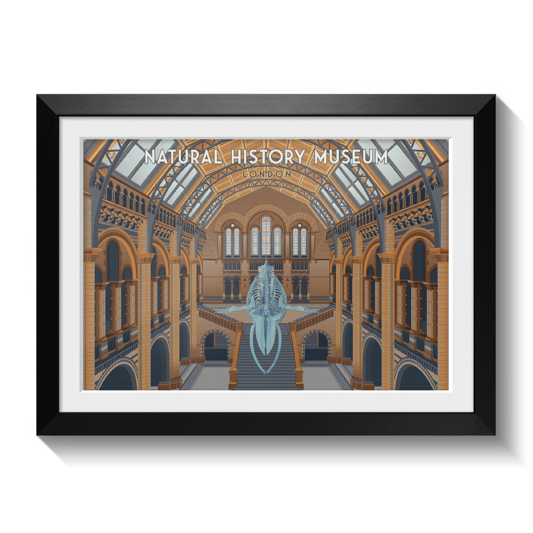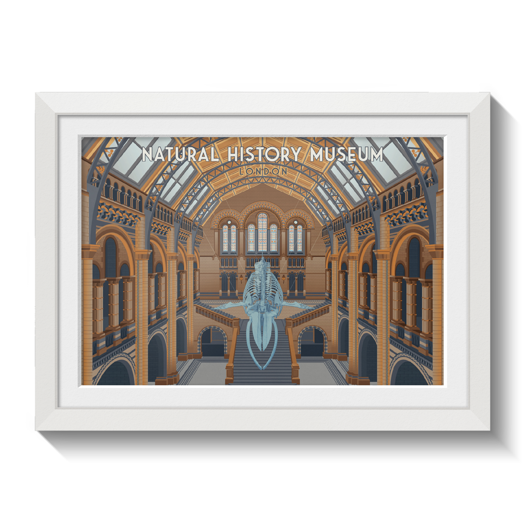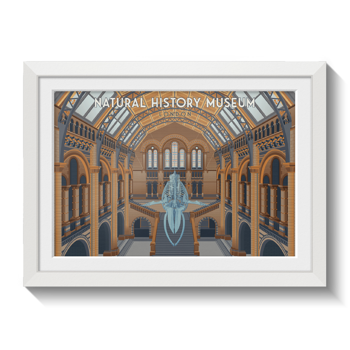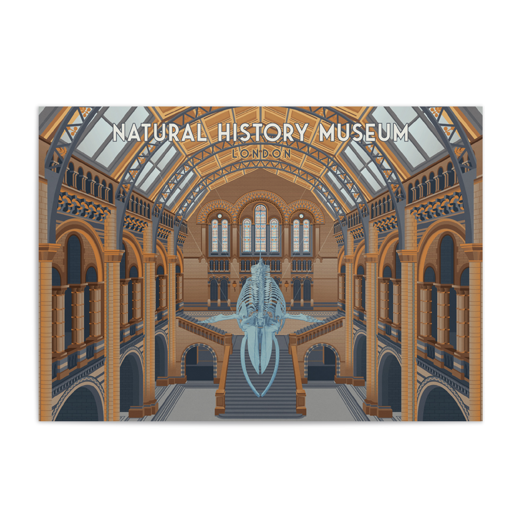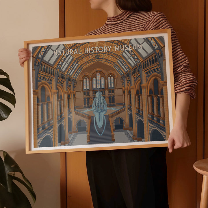 An original travel poster featuring London's Natural History Museum. This print focusses on the central Hintze Hall where the magnificent skeleton of Hope the Blue Whale is displayed.
