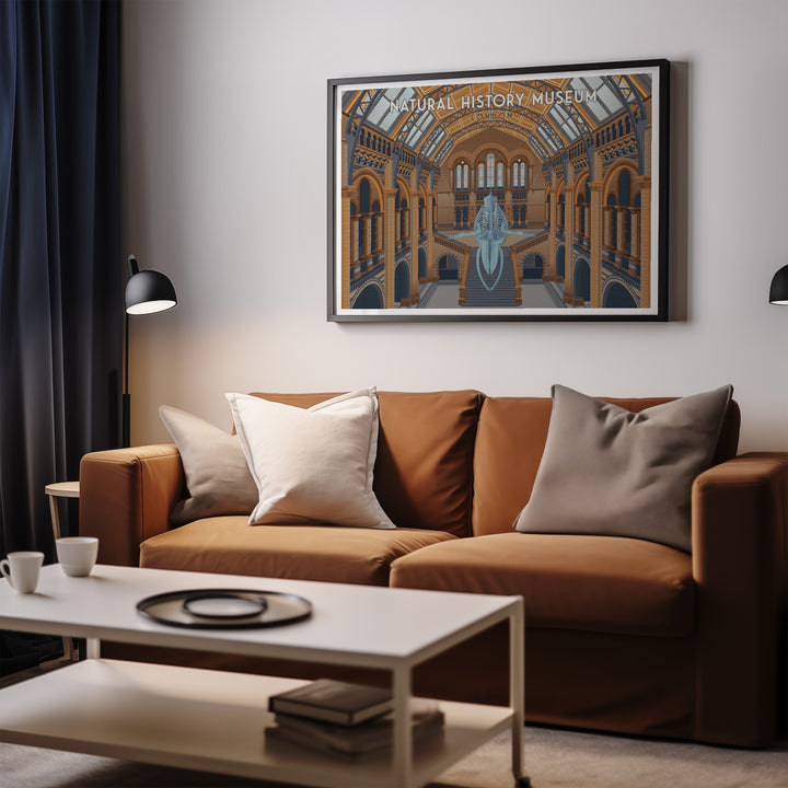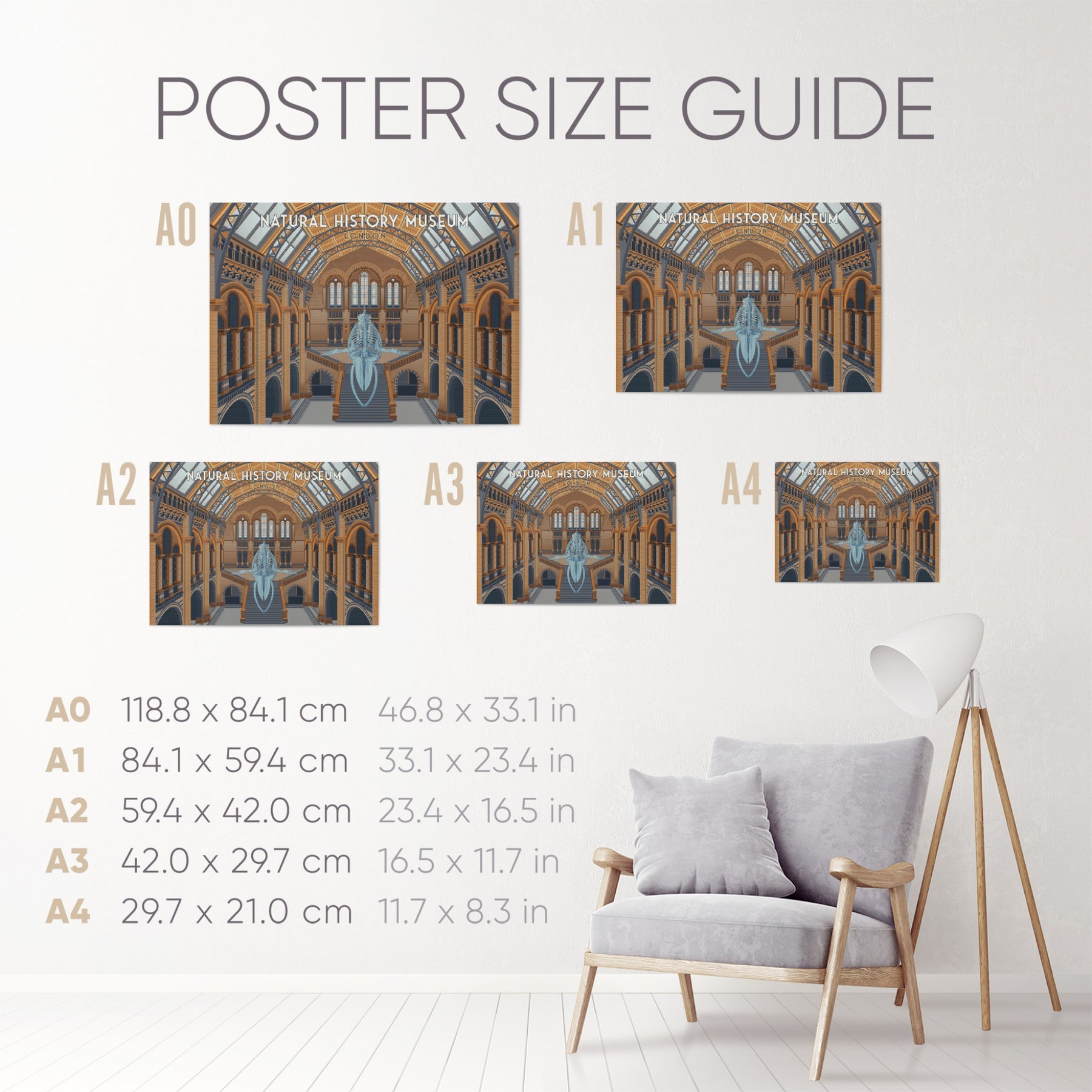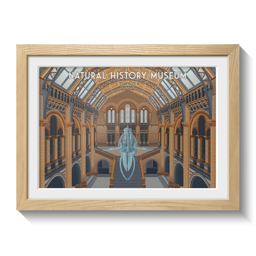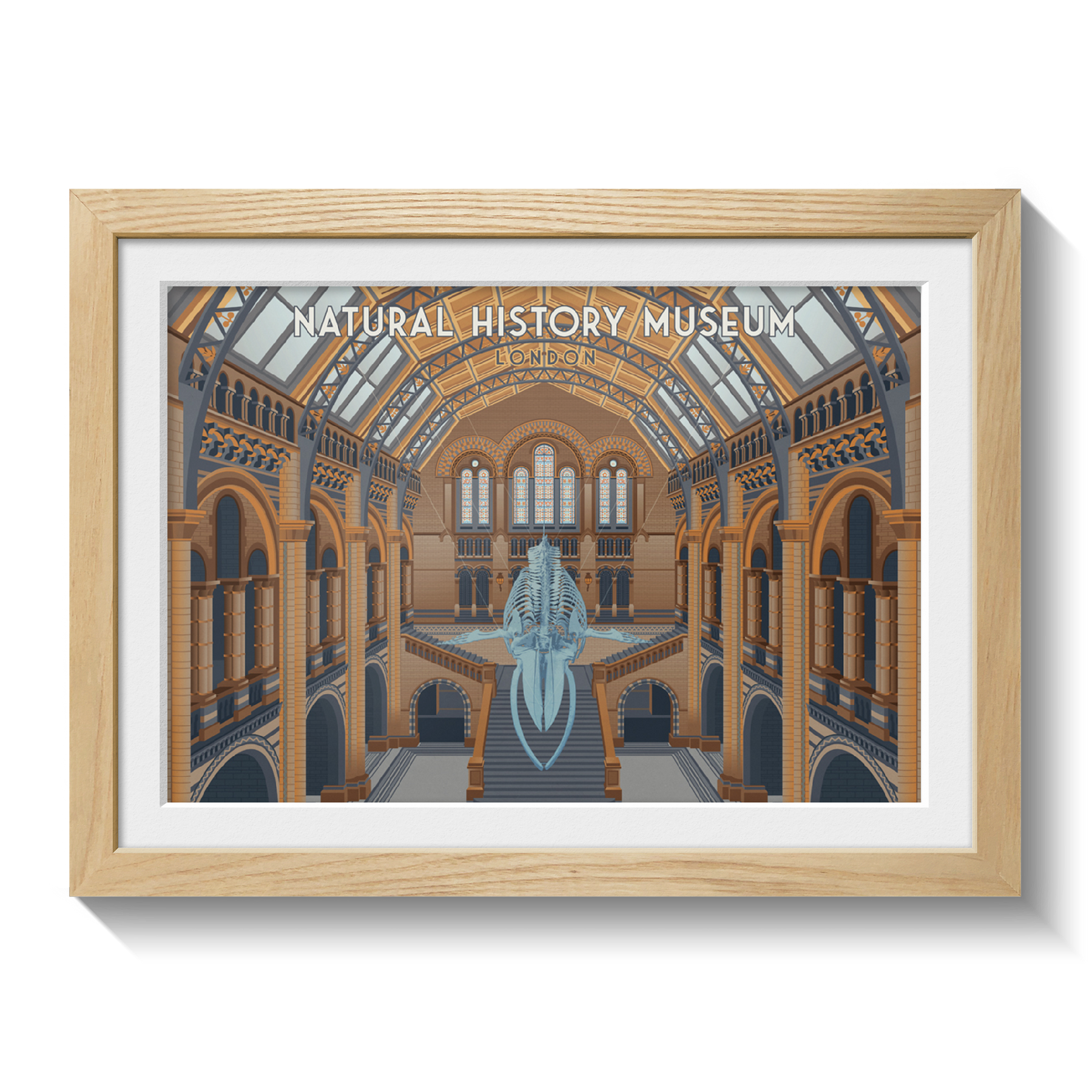 An original travel poster featuring London's Natural History Museum. This print focusses on the central Hintze Hall where the magnificent skeleton of Hope the Blue Whale is displayed.