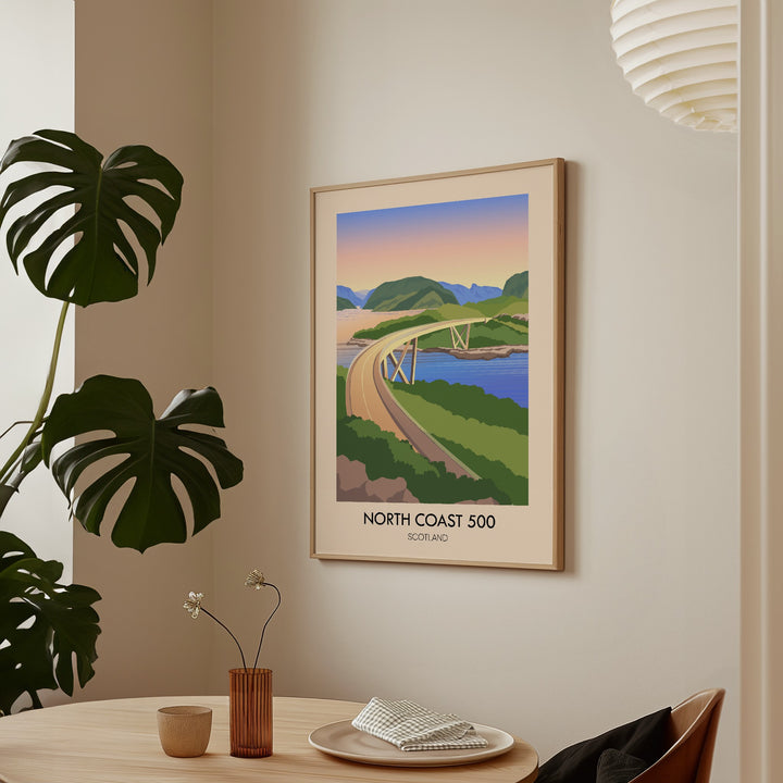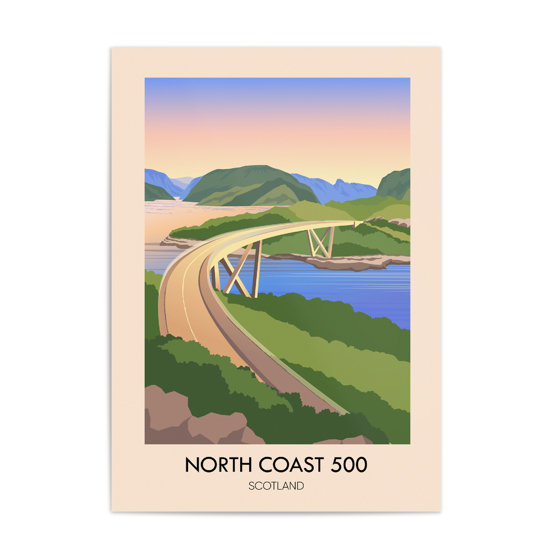 Original travel print featuring the Kylesku Bridge on the North Coast 500, Scotland. The North Coast 500 is a scenic route that takes you around some of the most breathtaking areas of the north coast of Scotland, it starts and ends in Inverness.