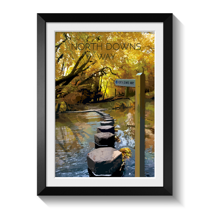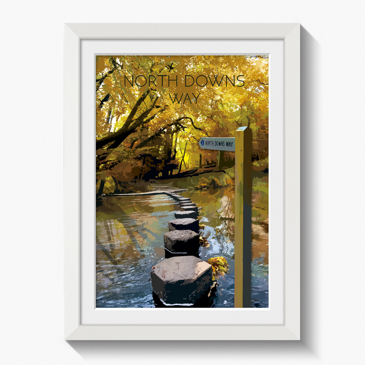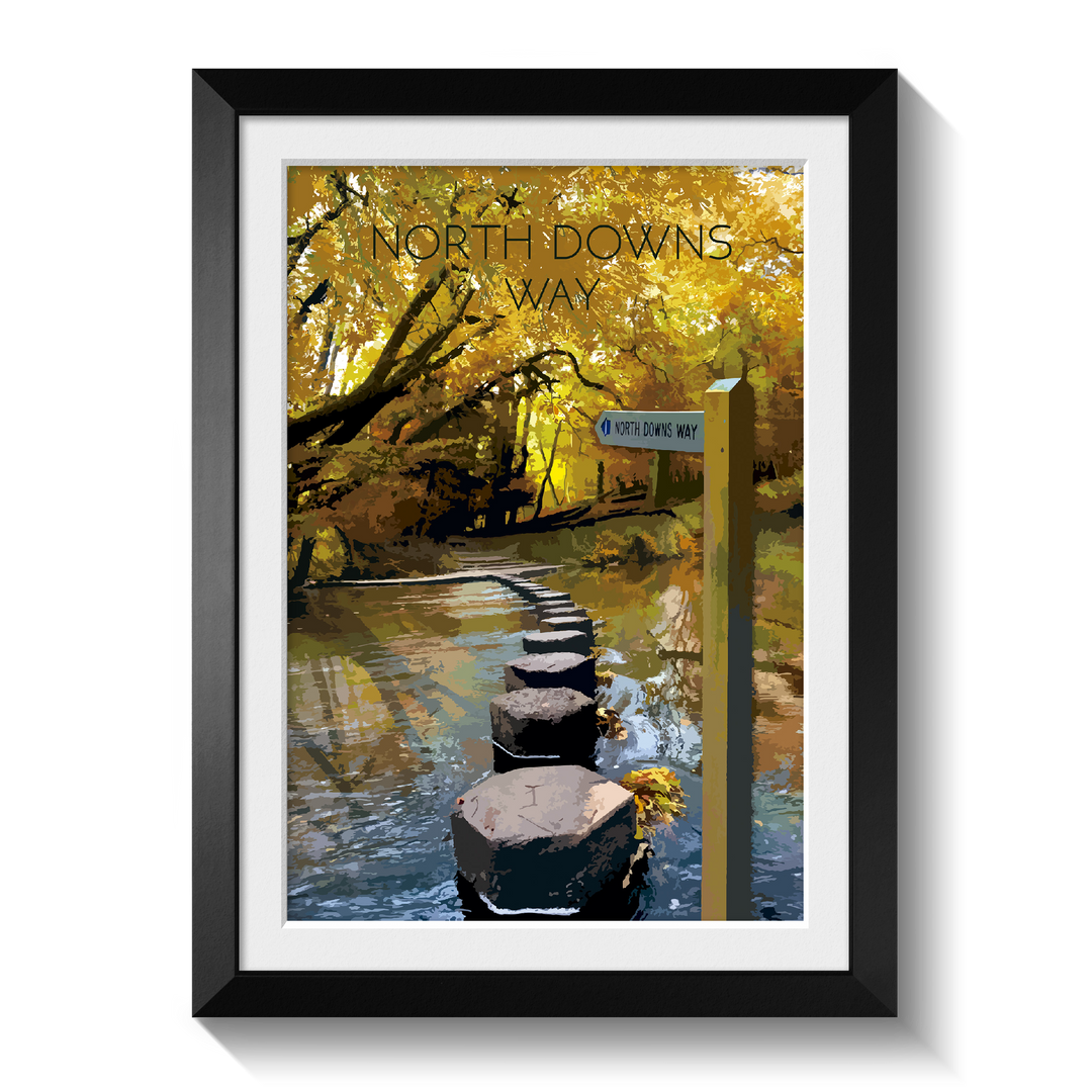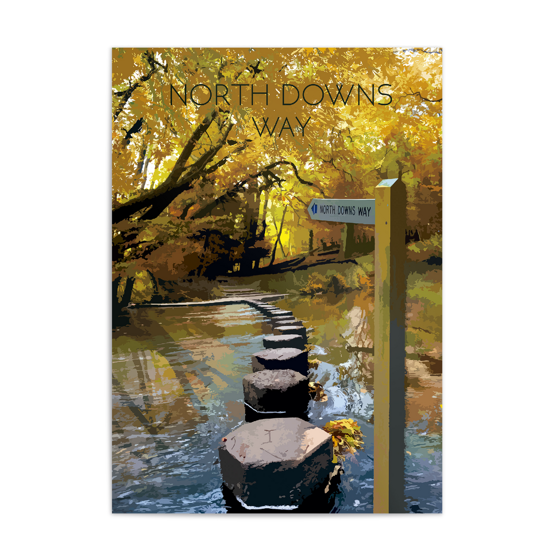 North Downs Way National Trail travel poster featuring a line of picturesque stepping stones crossing the River Mole as it approaches the famous Box Hill in Surrey; a charming Autumnal scene.