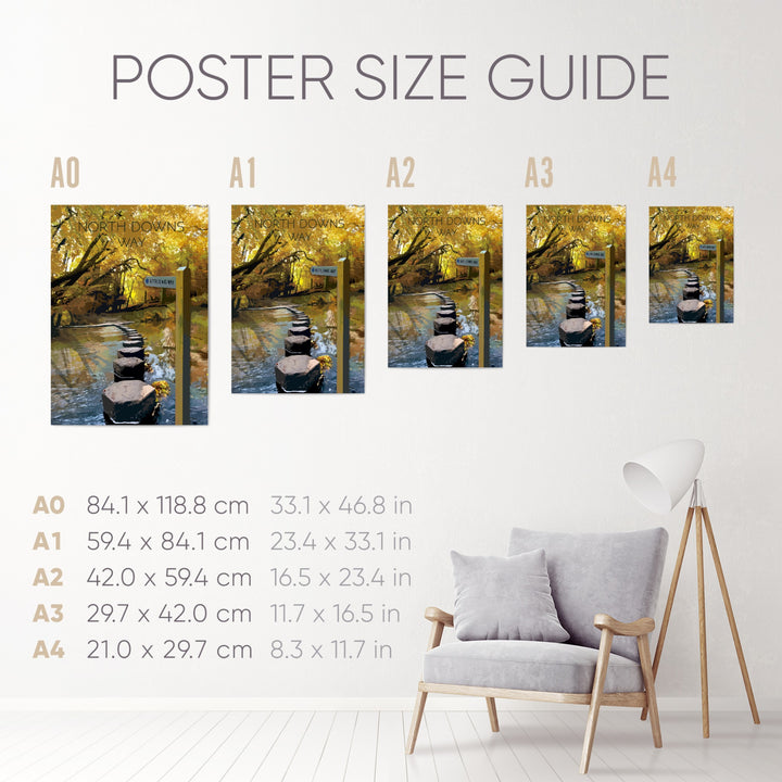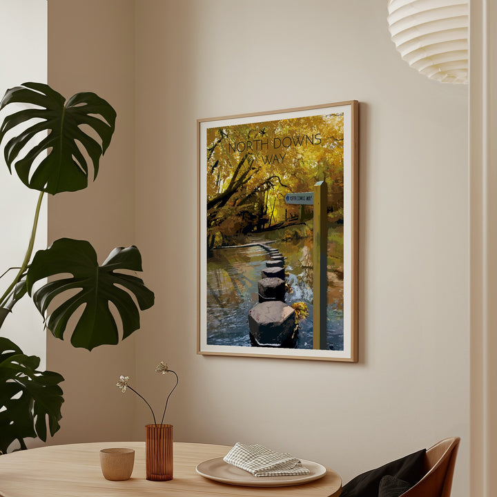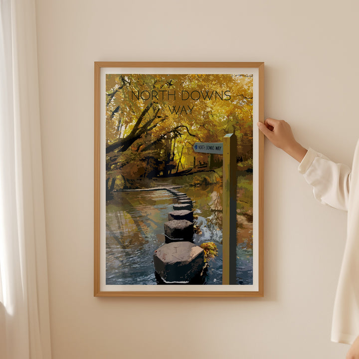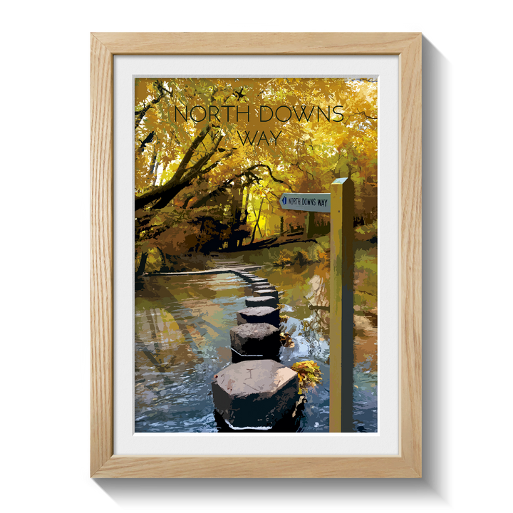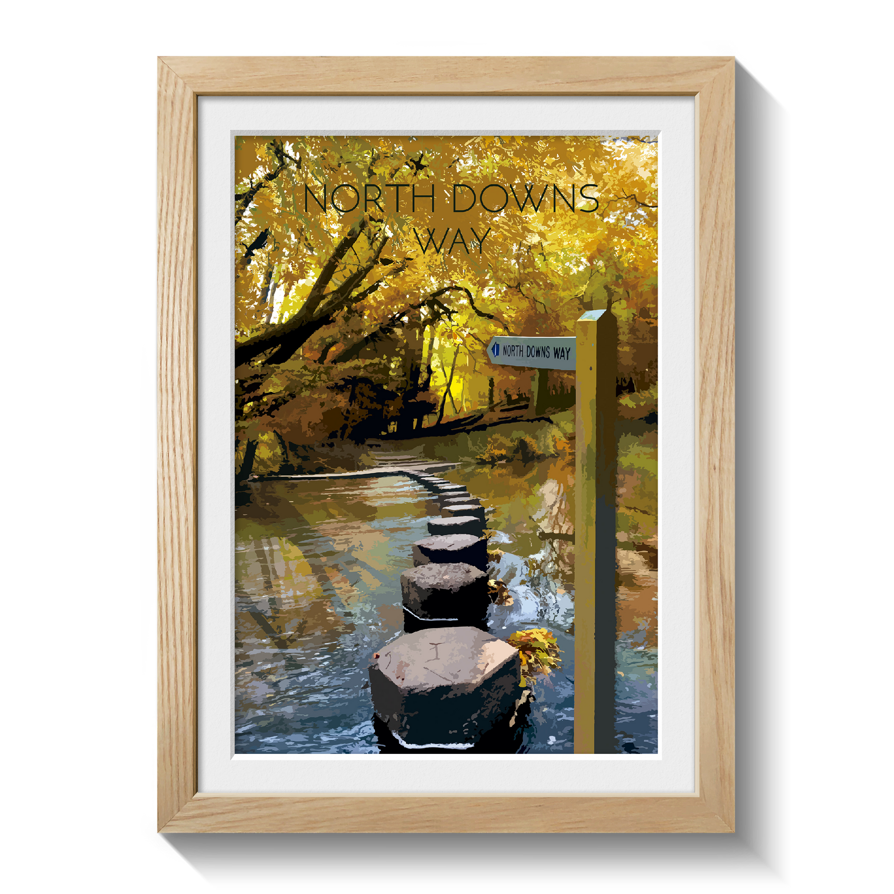 North Downs Way National Trail travel poster featuring a line of picturesque stepping stones crossing the River Mole as it approaches the famous Box Hill in Surrey; a charming Autumnal scene.
