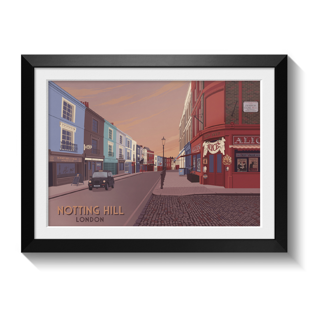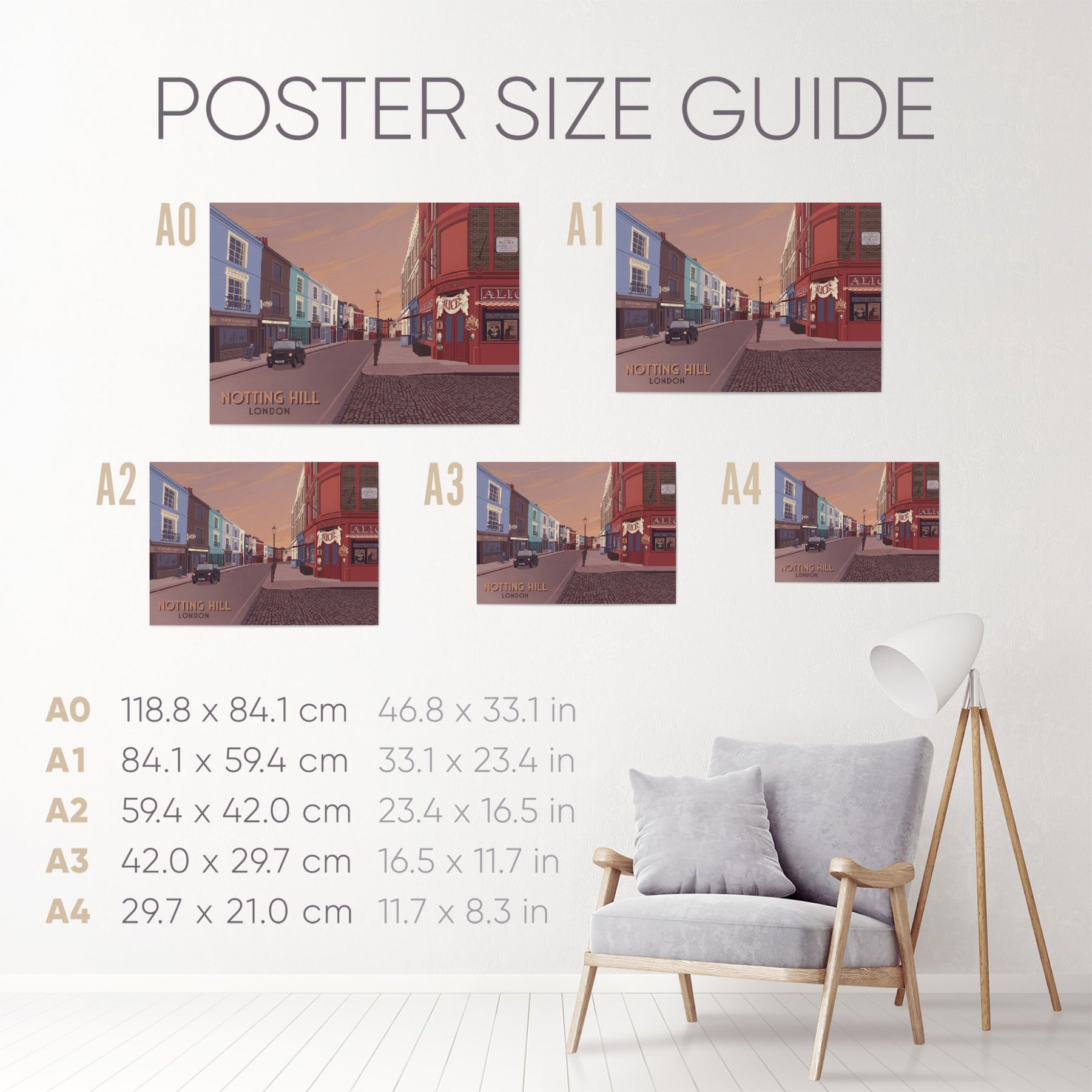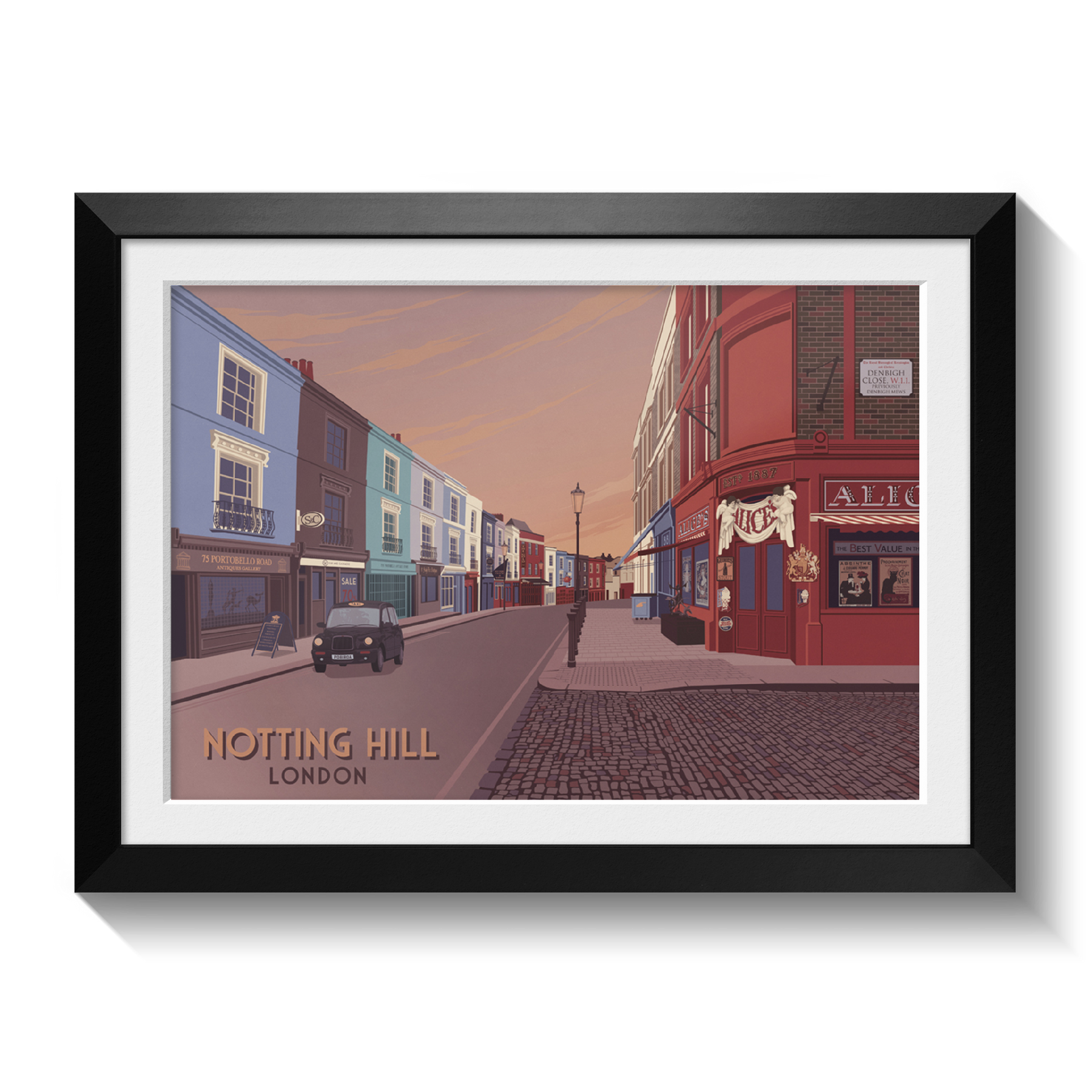 An original travel poster of Notting Hill featuring the view down Portobello Road, home of the famous Portobello Road Market.