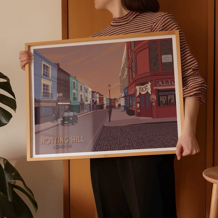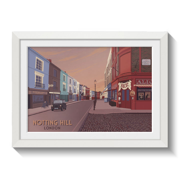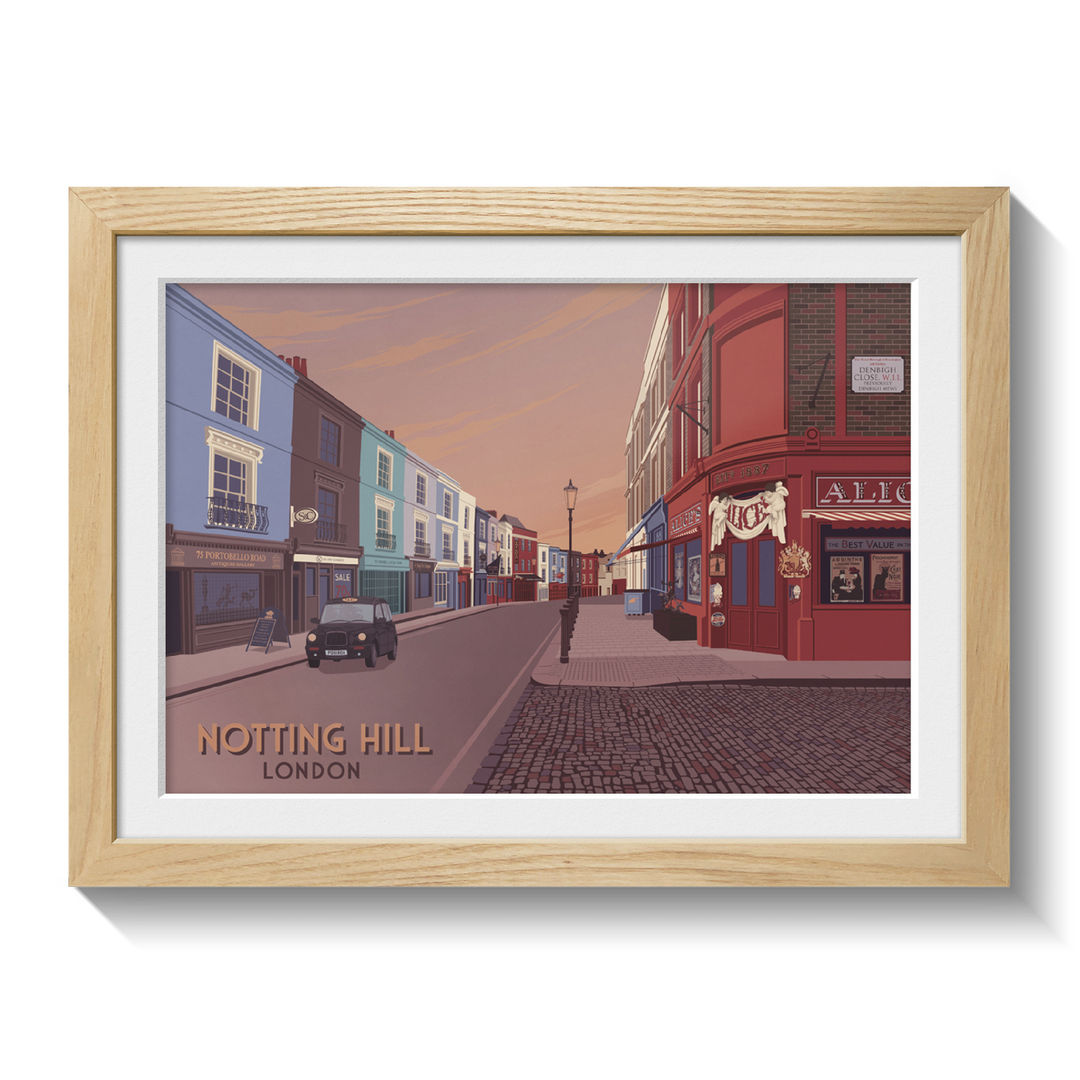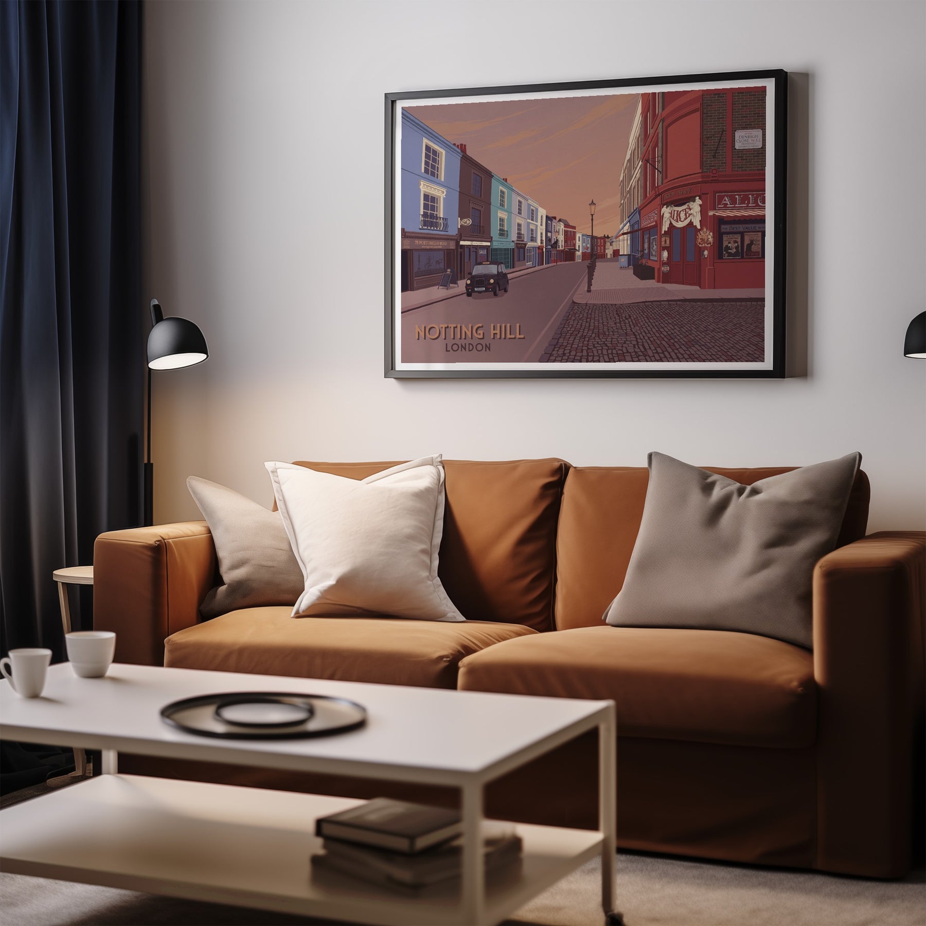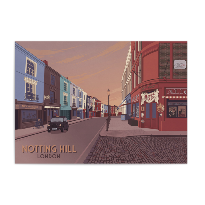 An original travel poster of Notting Hill featuring the view down Portobello Road, home of the famous Portobello Road Market.