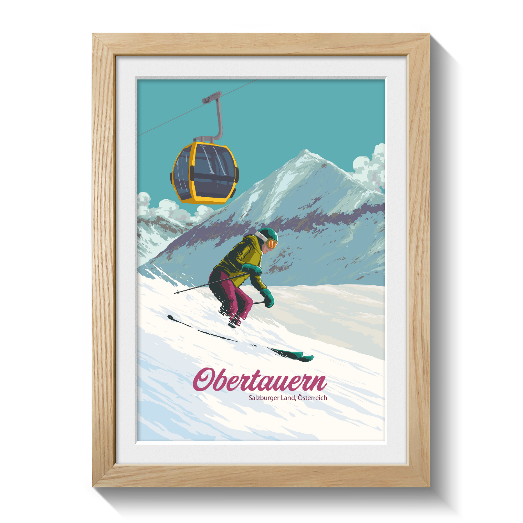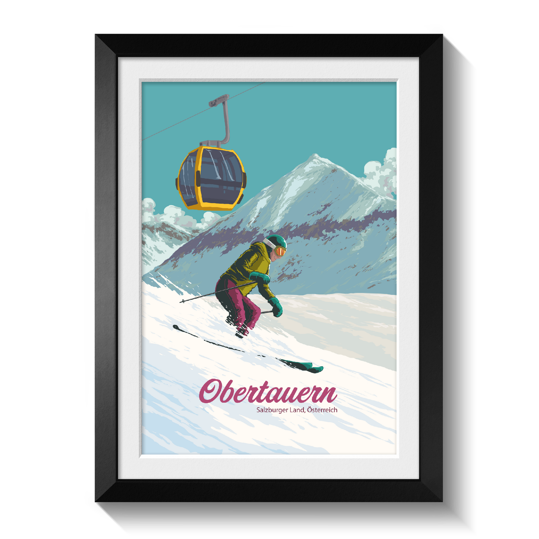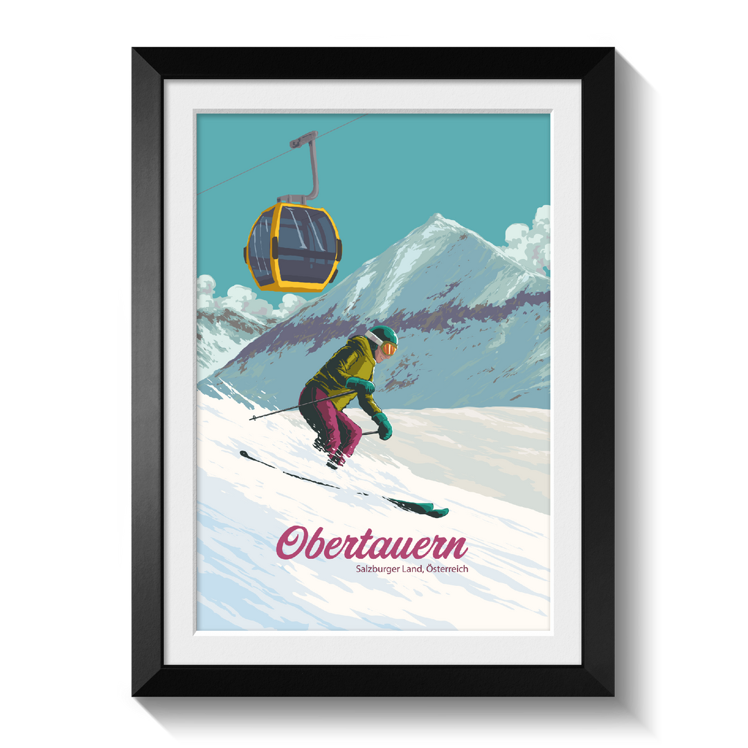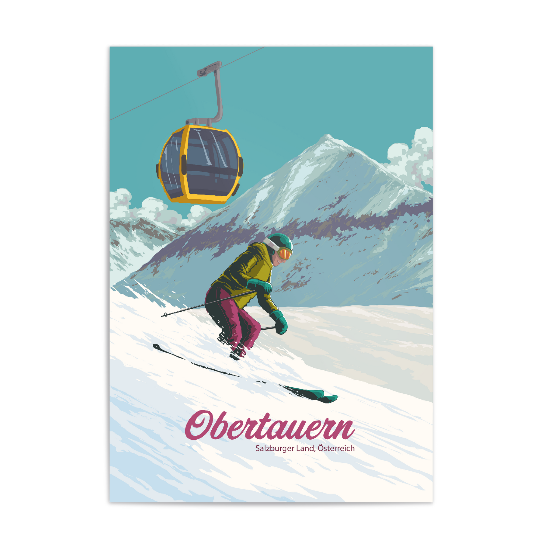 This is an original travel poster featuring the popular Austrian ski resort of Obertauern. Obertauern is located in the Radstädter Tauern mountains in the state of Salzburg.