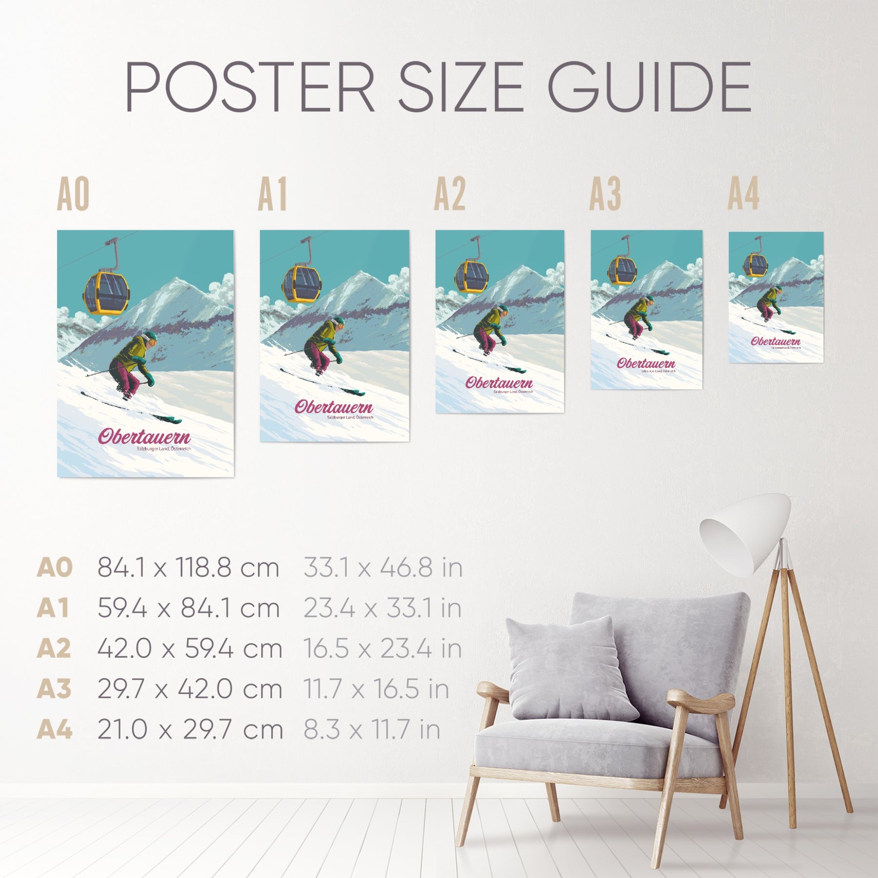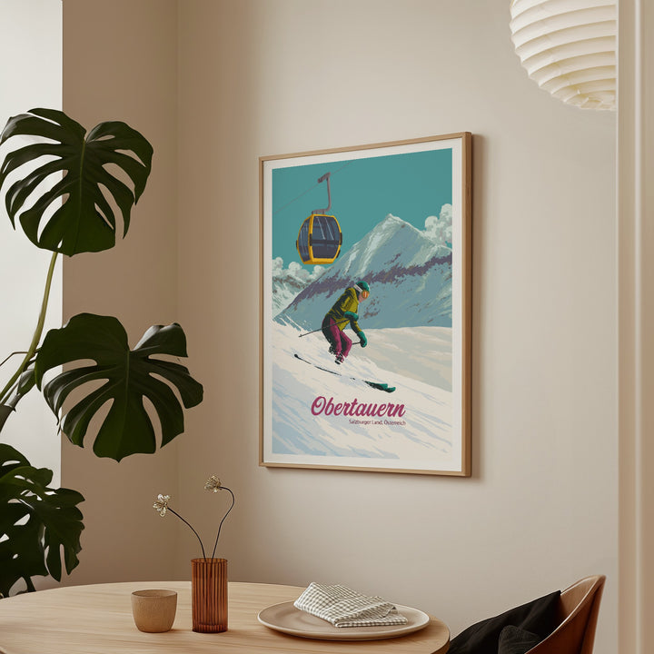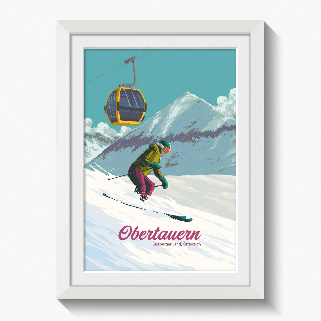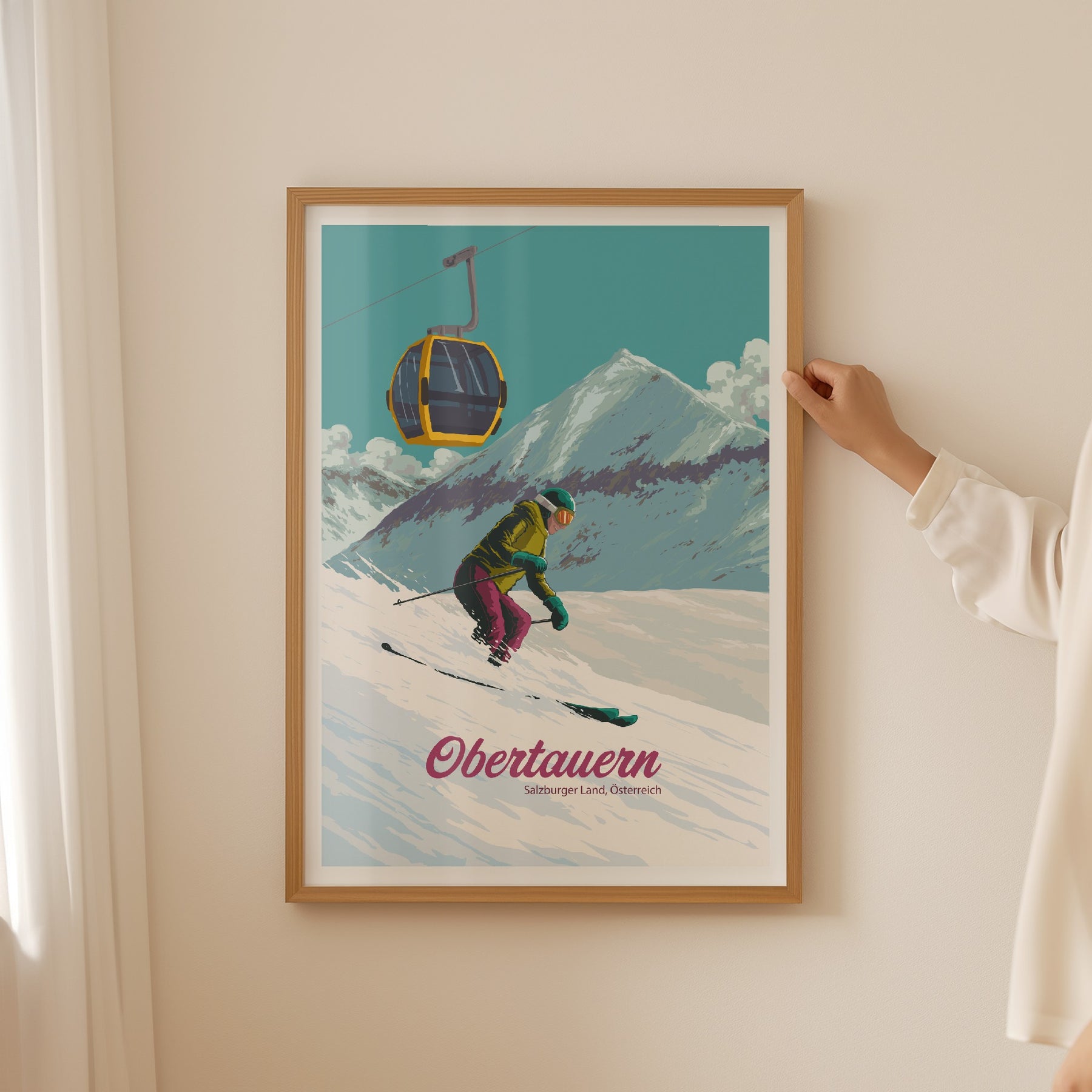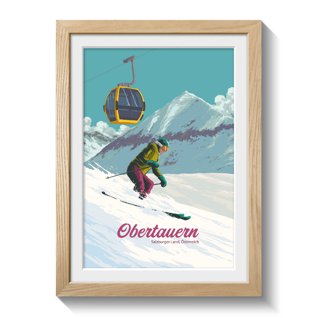 This is an original travel poster featuring the popular Austrian ski resort of Obertauern. Obertauern is located in the Radstädter Tauern mountains in the state of Salzburg.