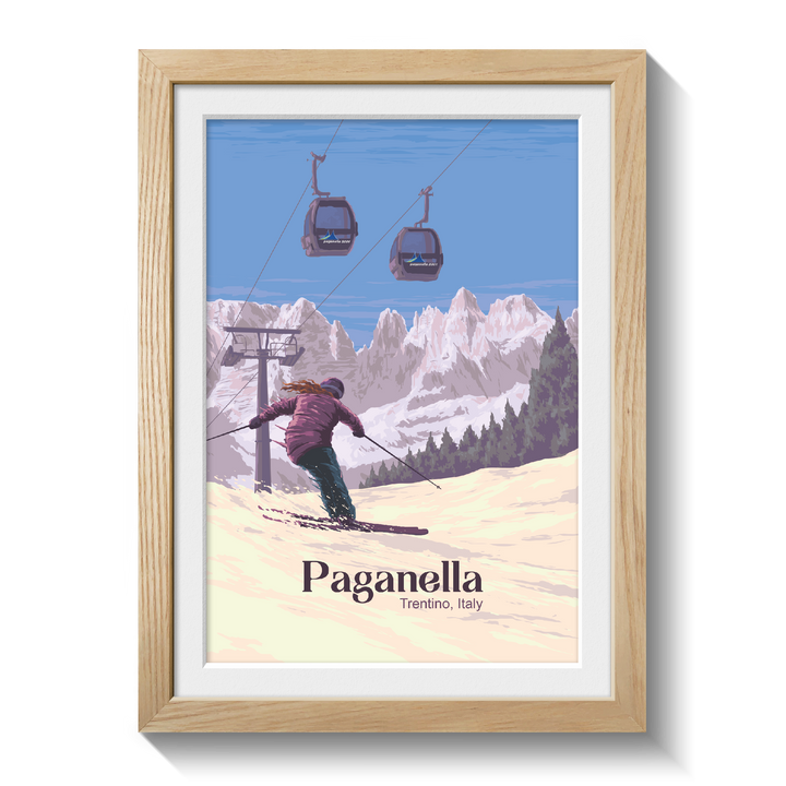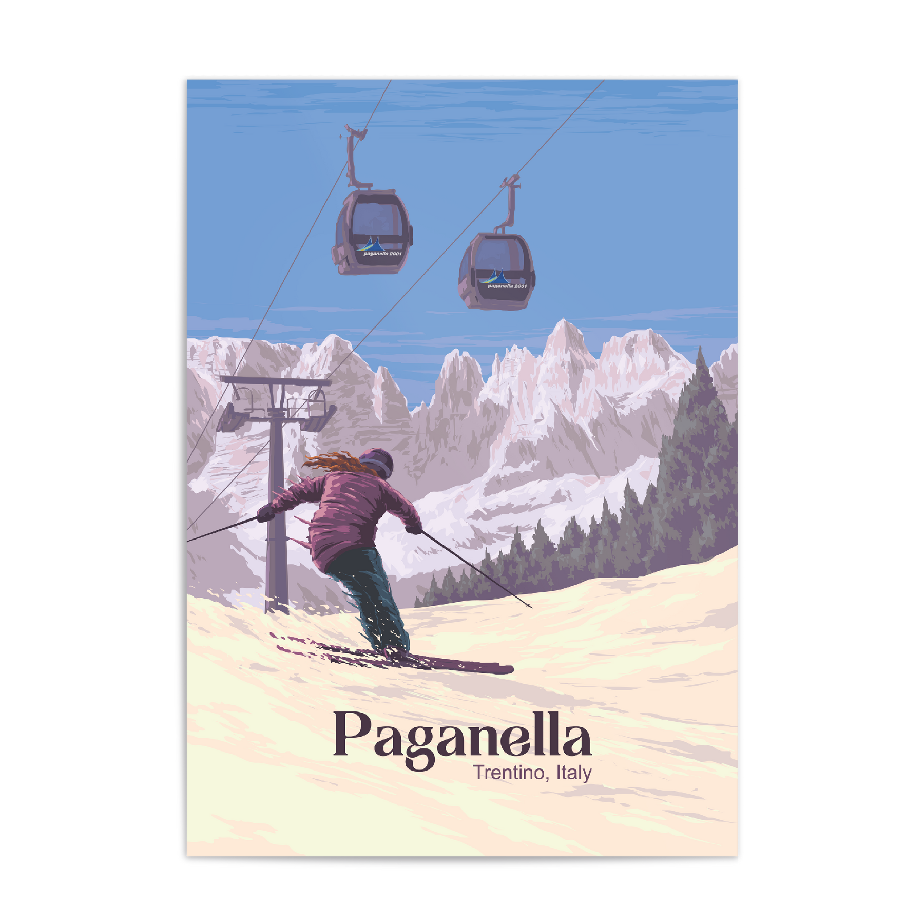An original skiing print featuring the Italian ski resort of Paganella, in the Brenta Dolomites. This family friendly resort has fantastic views of Lake Garda.