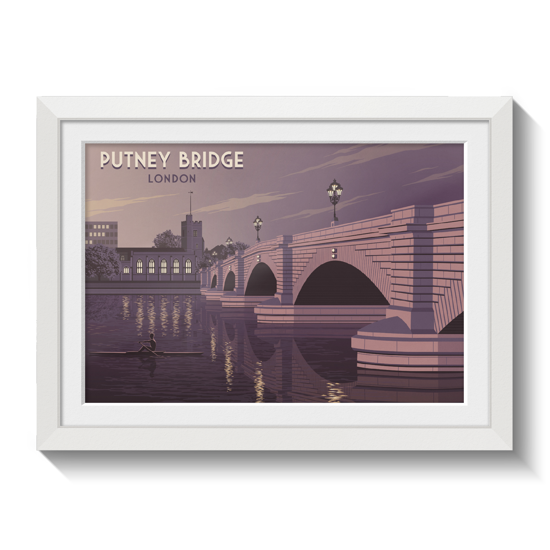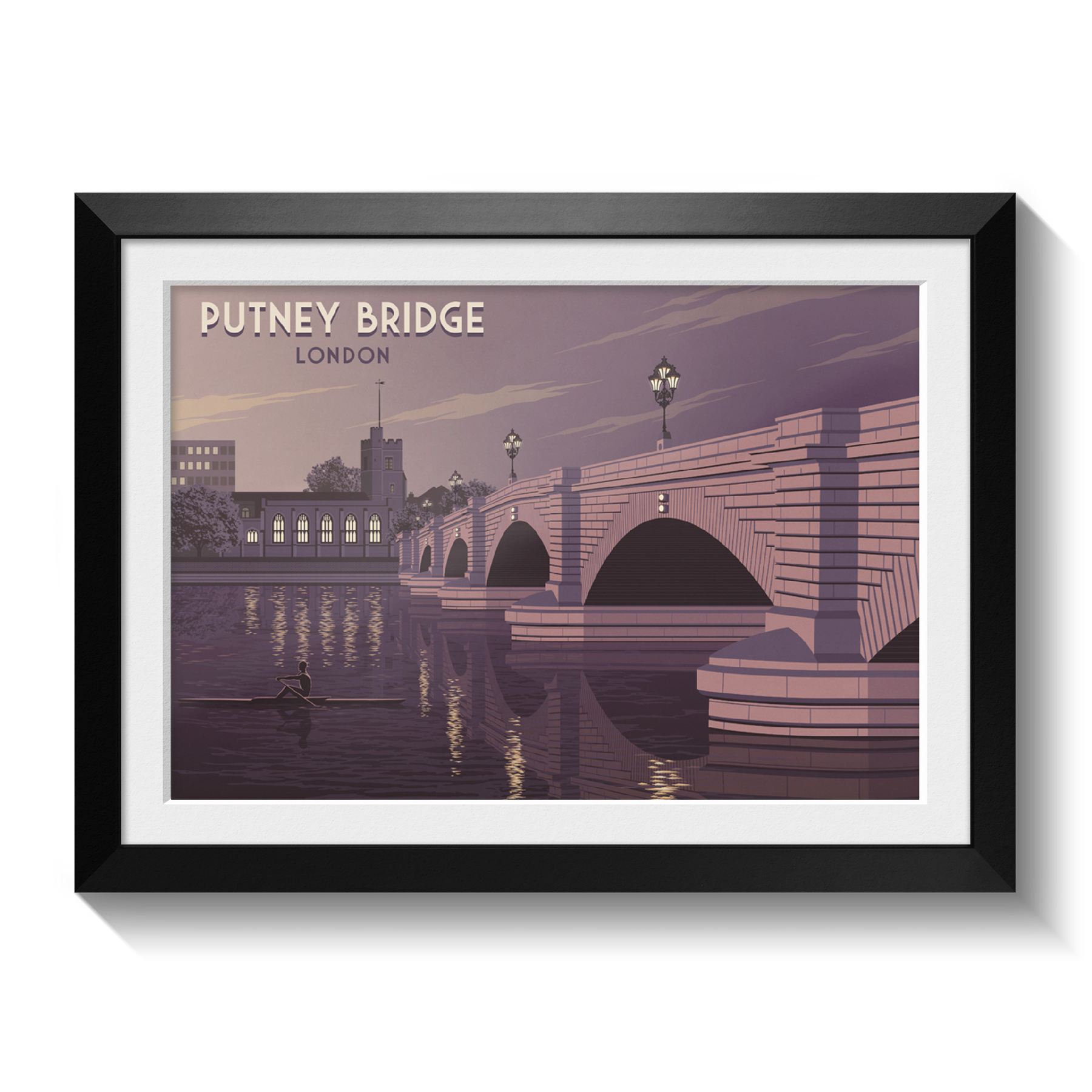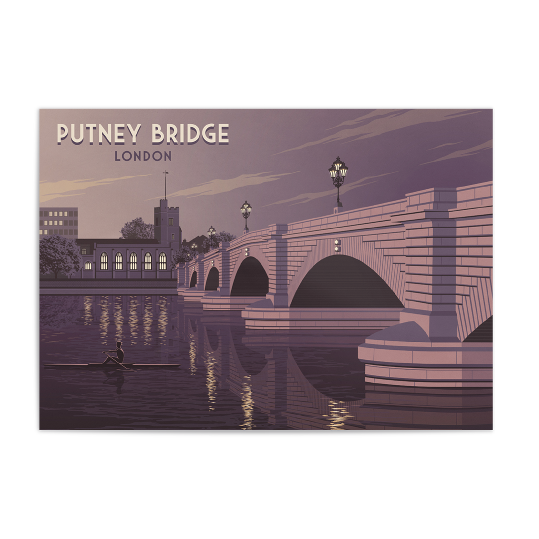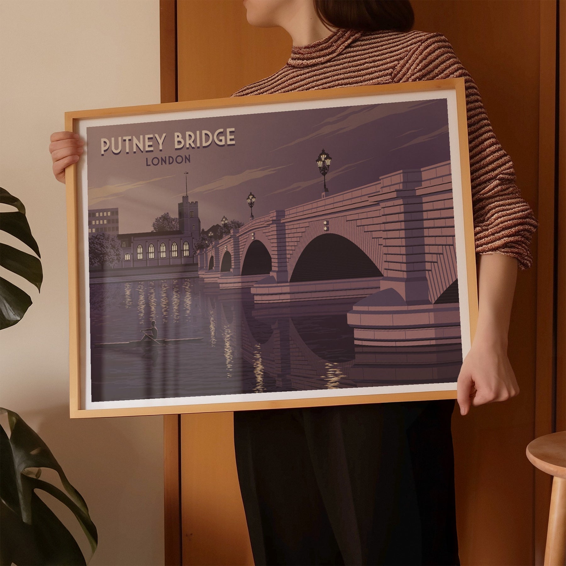 This vintage style travel poster features London's Putney Bridge that crosses the River Thames in West London, linking Putney and Fulham.