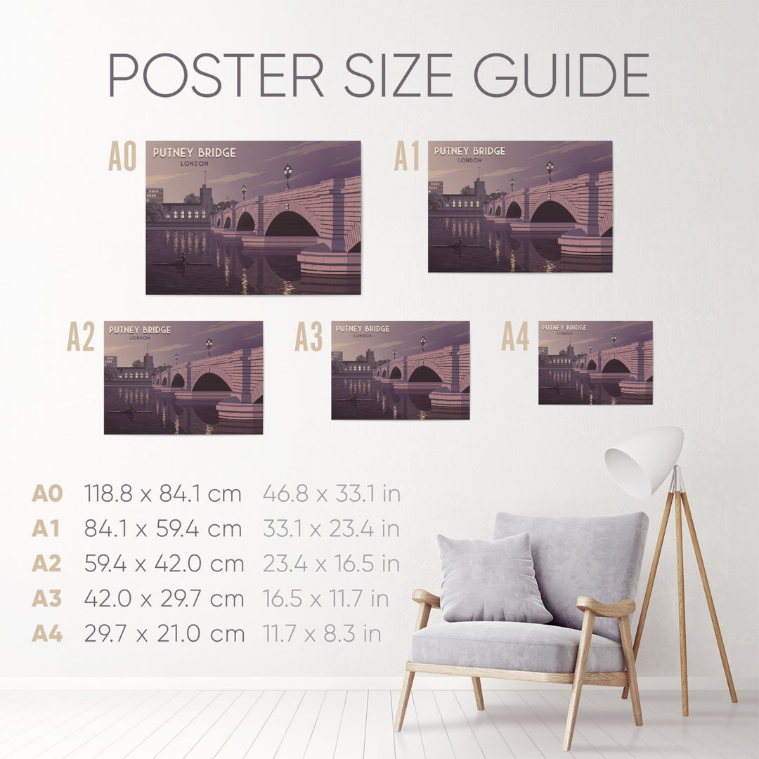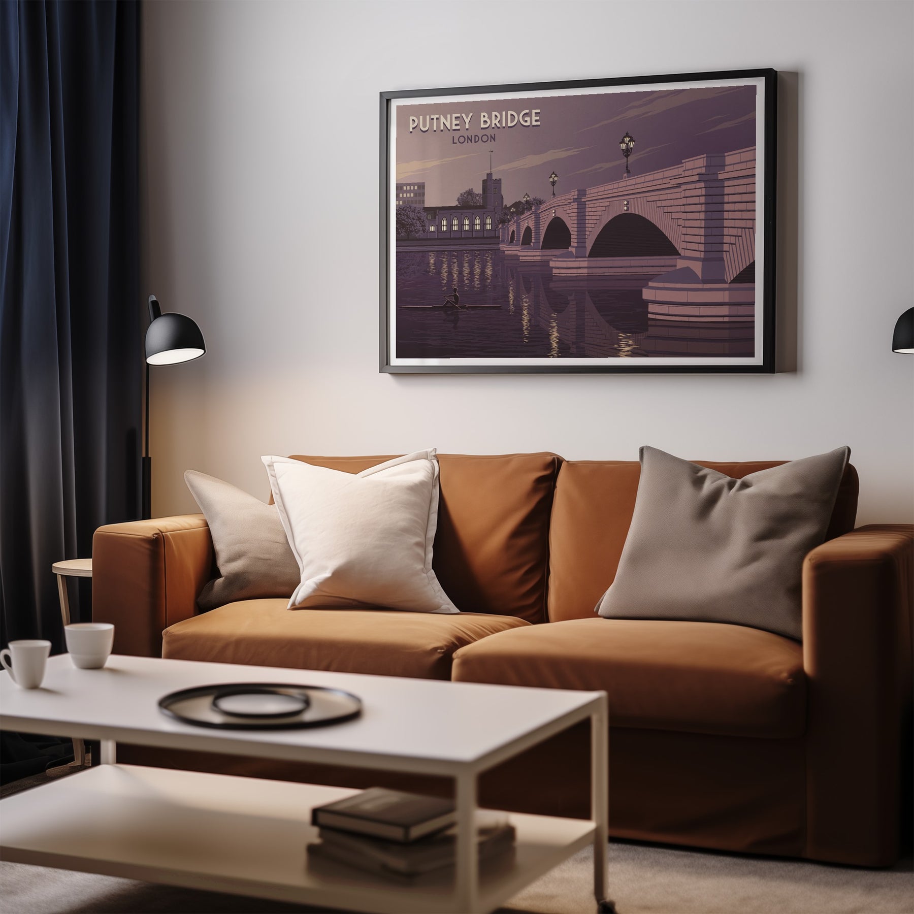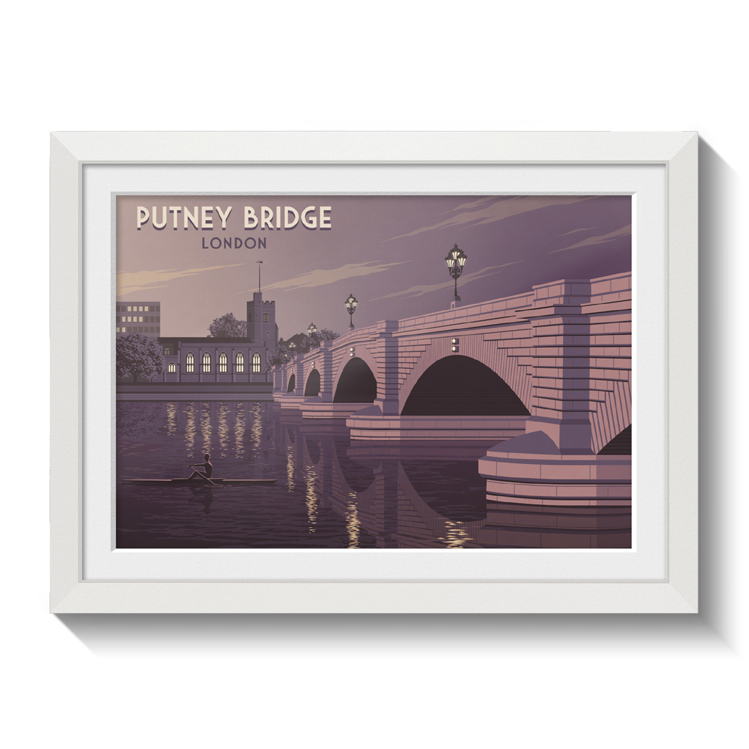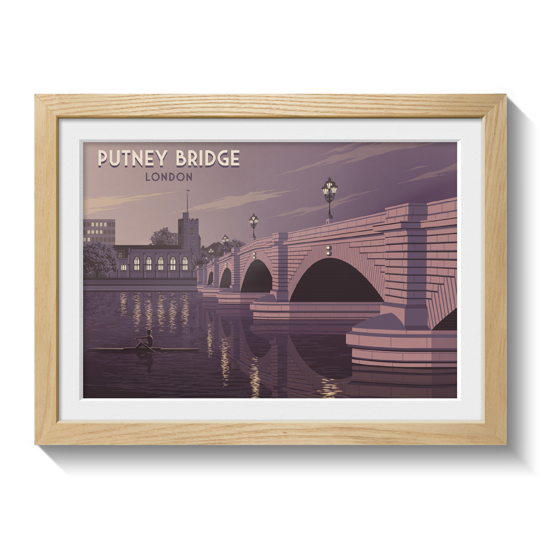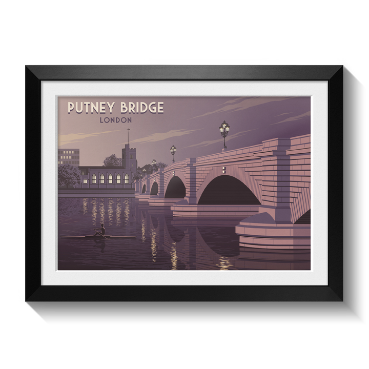 This vintage style travel poster features London's Putney Bridge that crosses the River Thames in West London, linking Putney and Fulham.