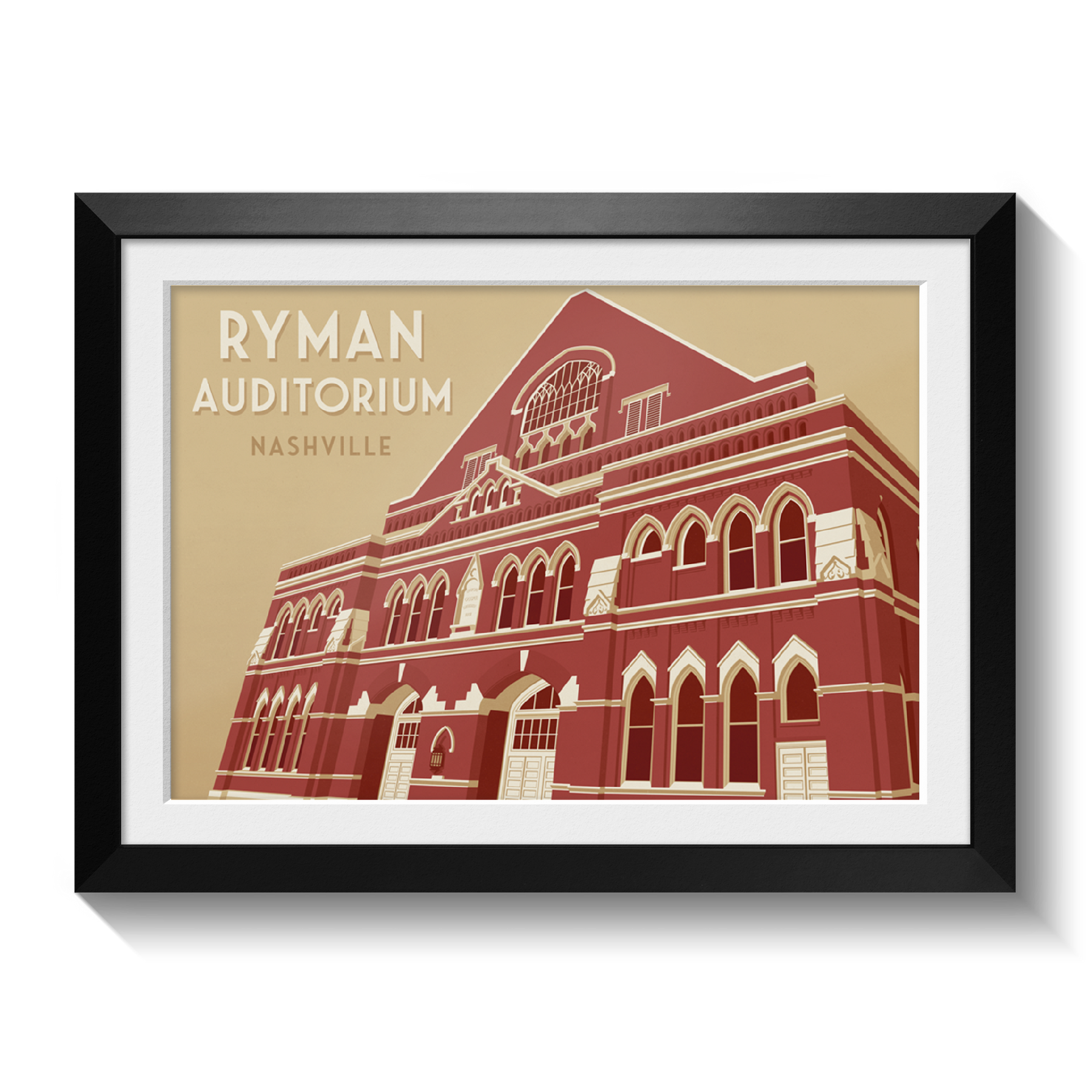 An original travel poster featuring the iconic music venue, the Ryman Auditorium, the home of Country Music in Nashville music city, Tennessee, USA.