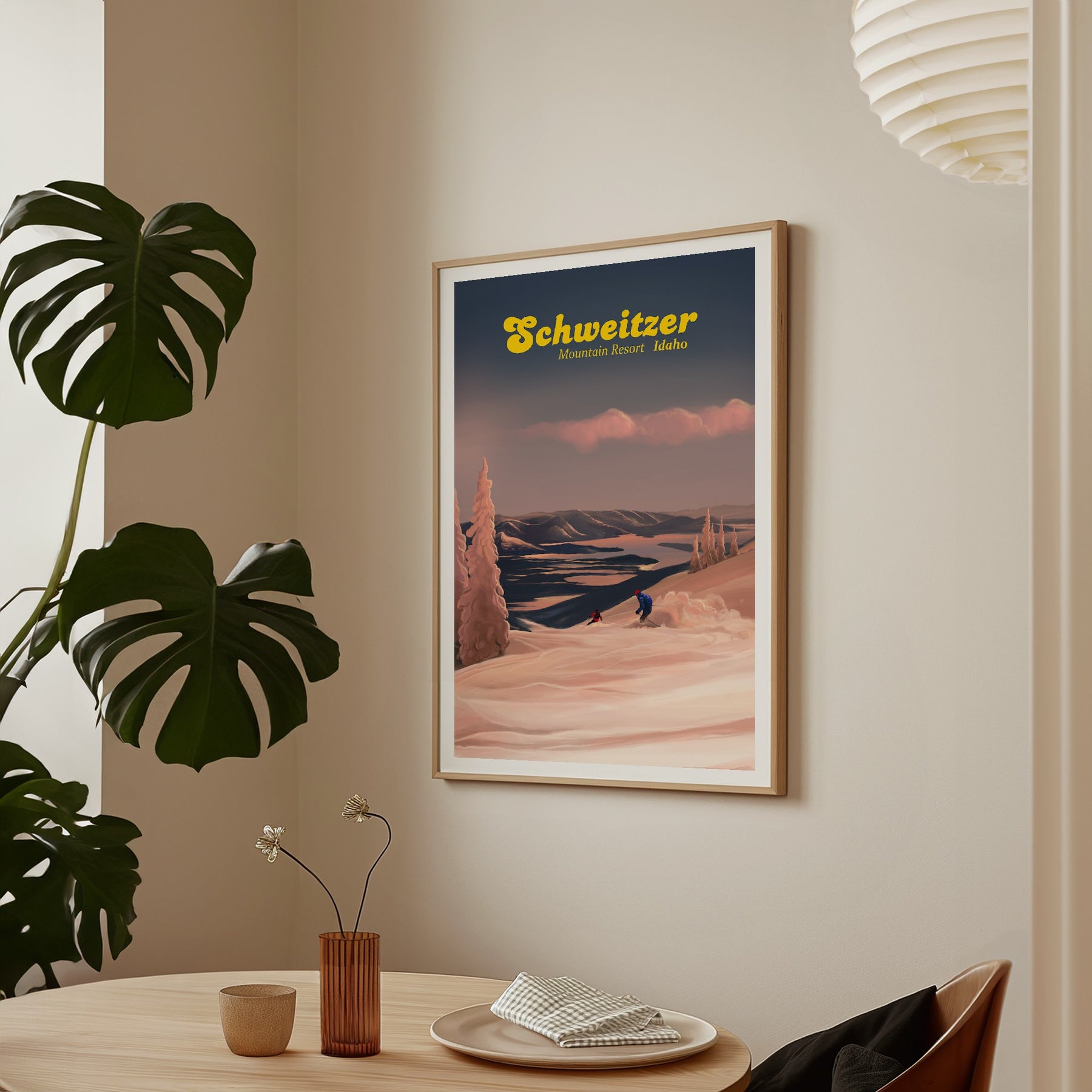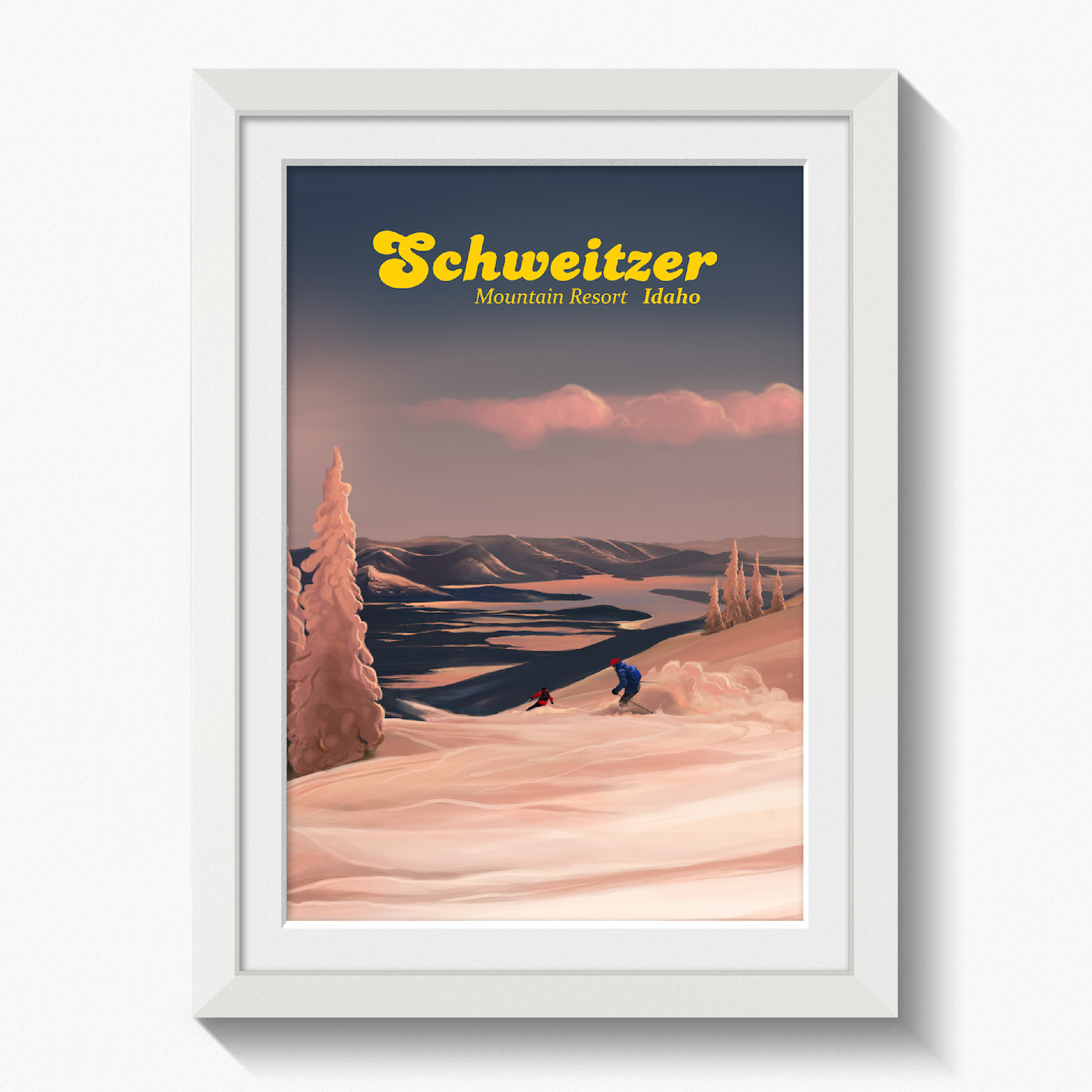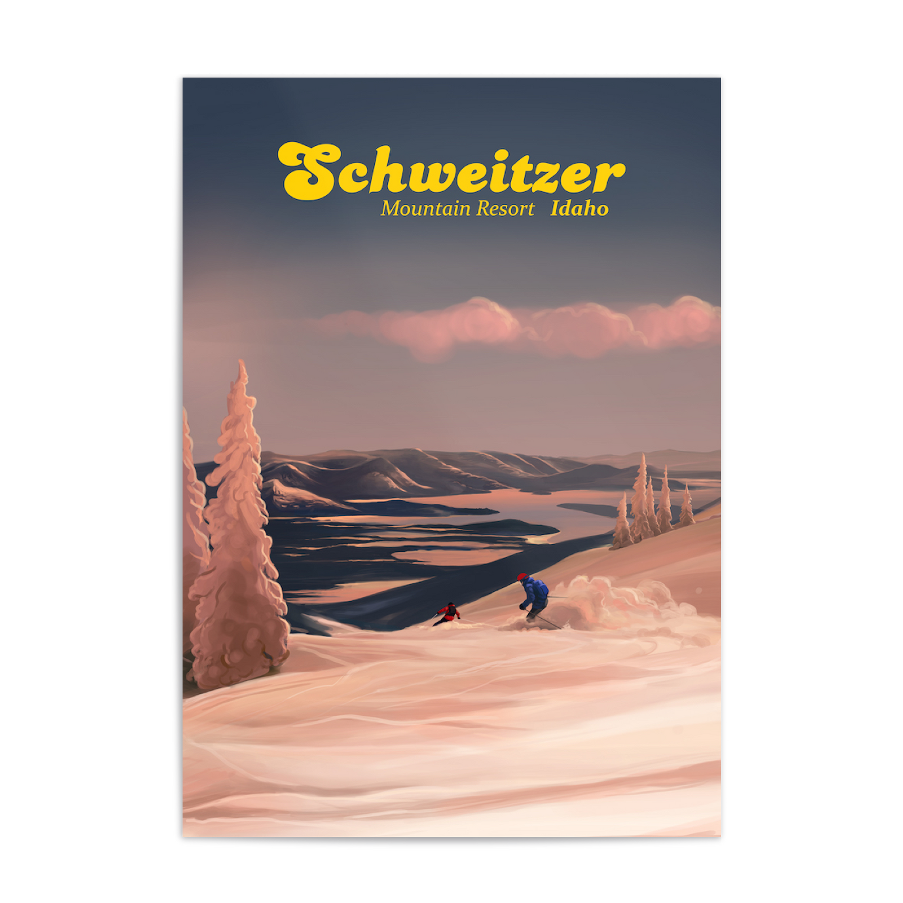 This is an original travel poster featuring popular ski resort of Schweitzer Mountain Resort, located in the northwest United States in northern Idaho, 11 miles northwest of Sandpoint.