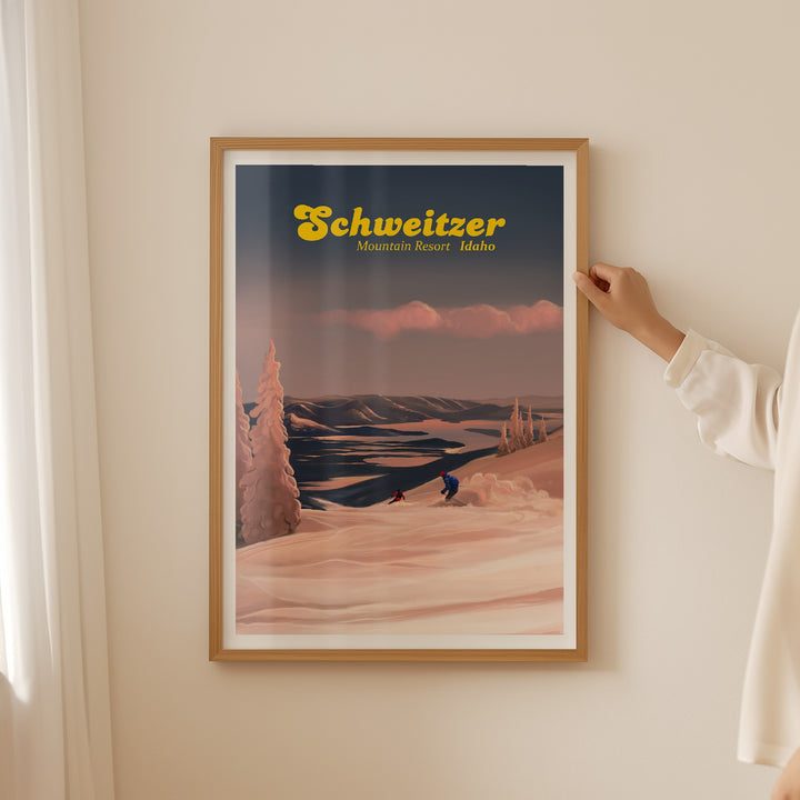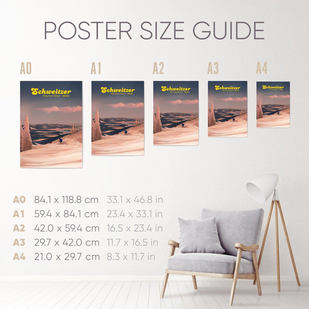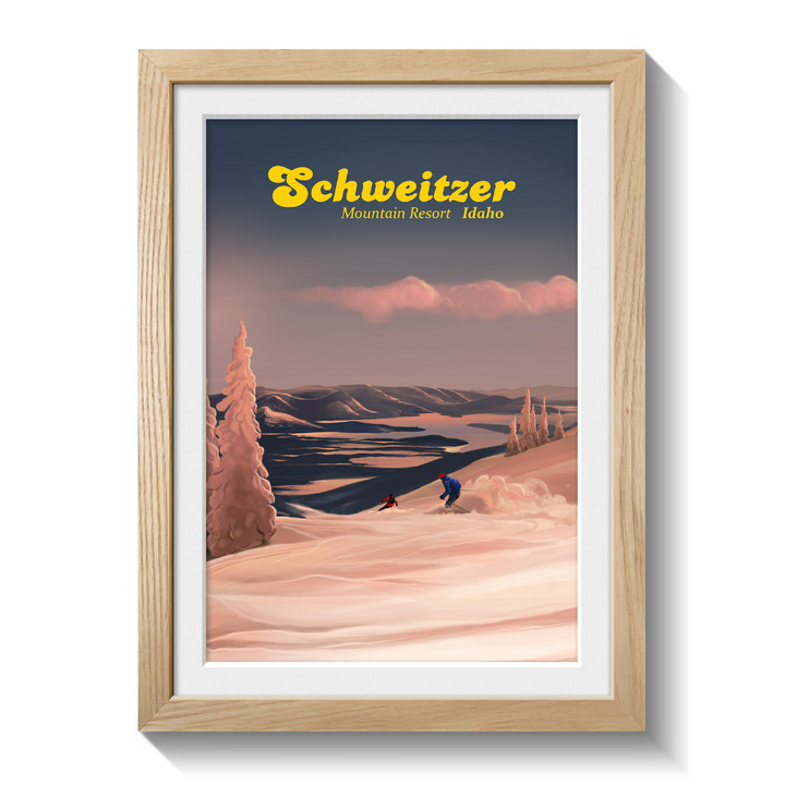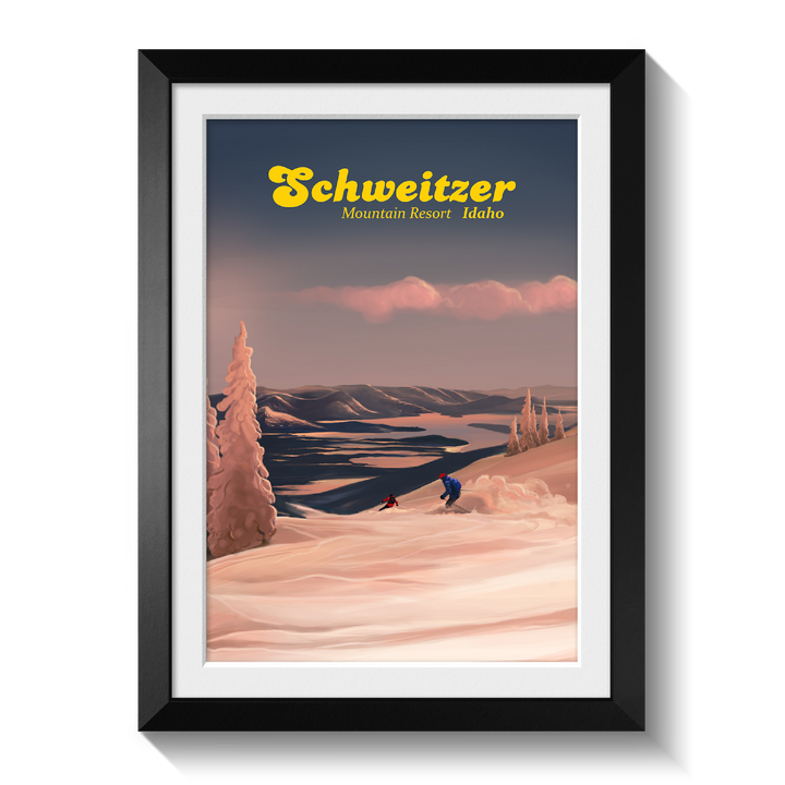 This is an original travel poster featuring popular ski resort of Schweitzer Mountain Resort, located in the northwest United States in northern Idaho, 11 miles northwest of Sandpoint.