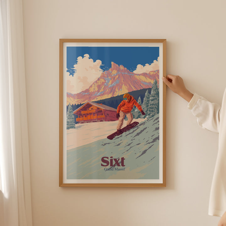 This is an original snowboard travel poster featuring the popular French ski resort of Sixt in the Grand Massif area of the French Alps.