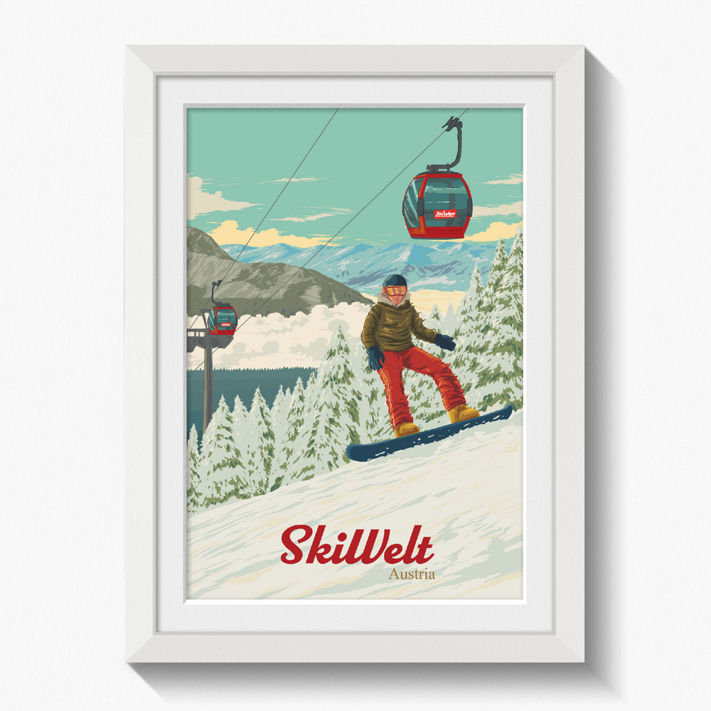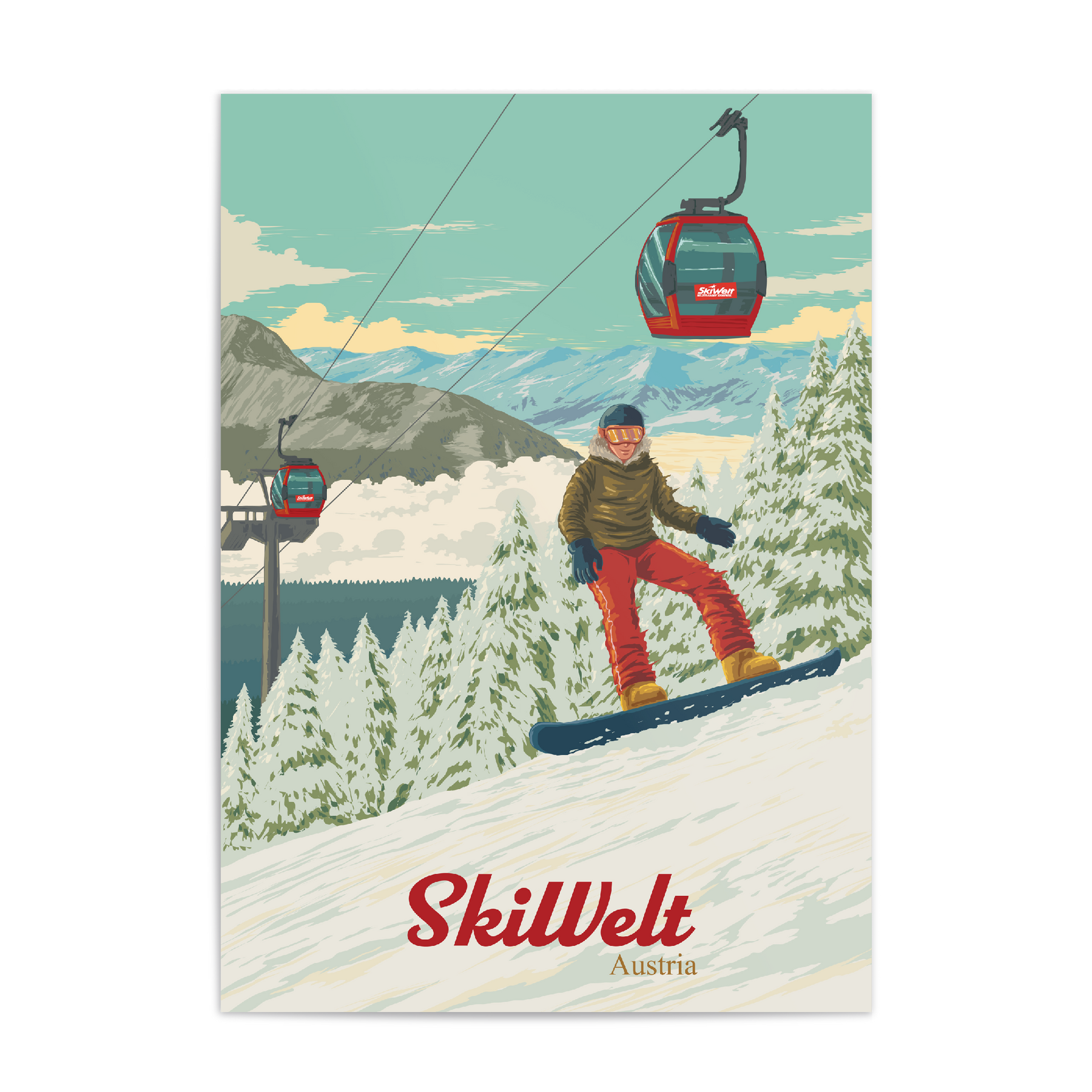 An original snowboard poster featuring Austria's largest interconnected ski area; SkiWelt.