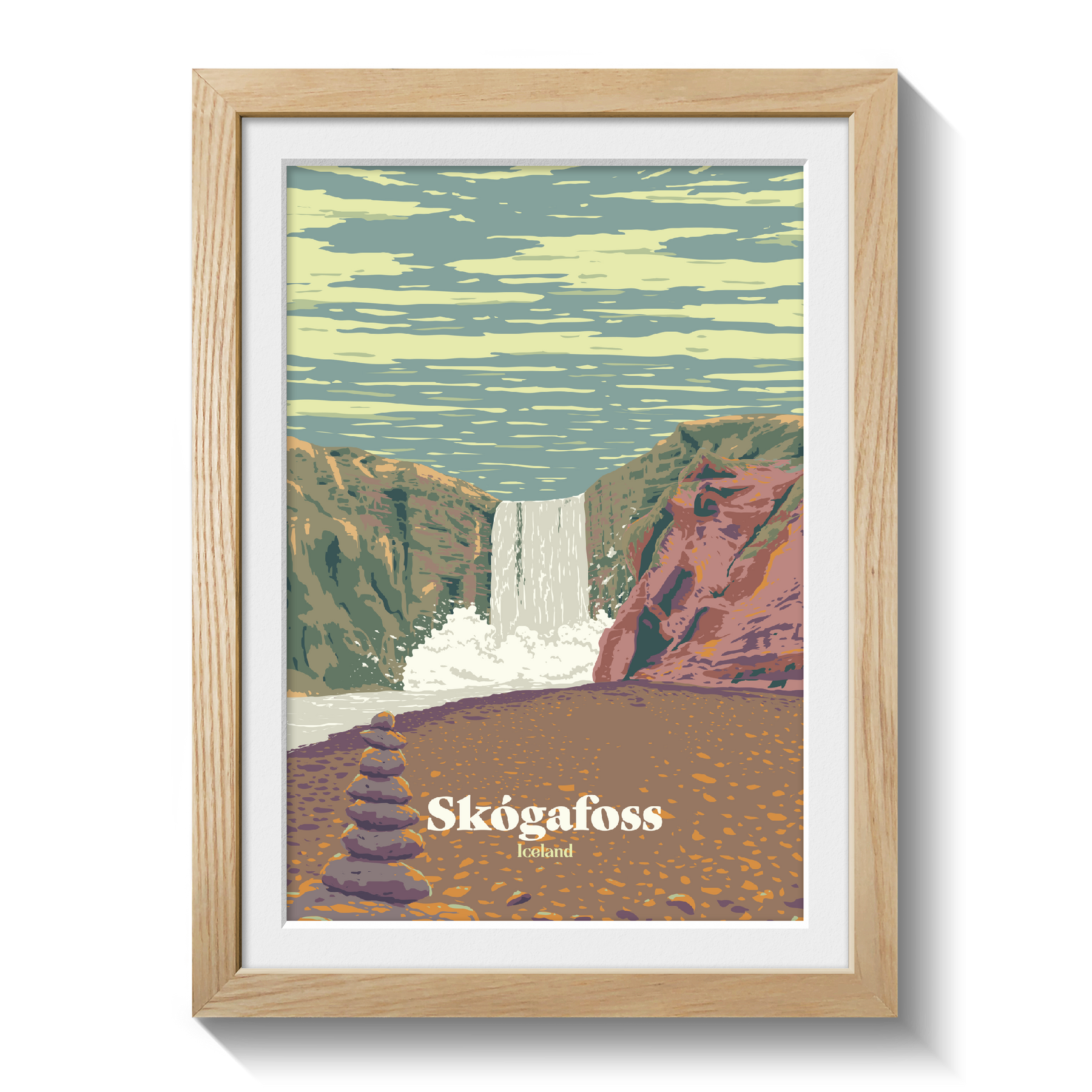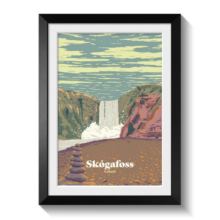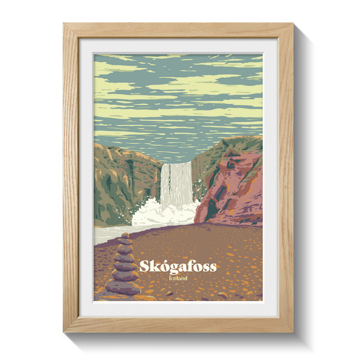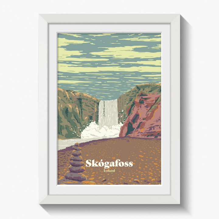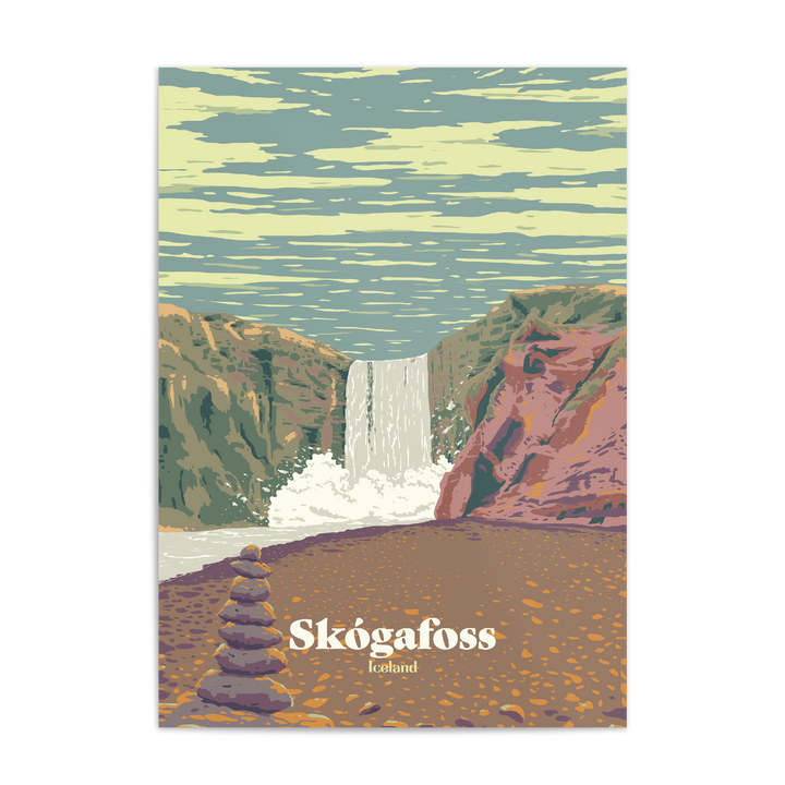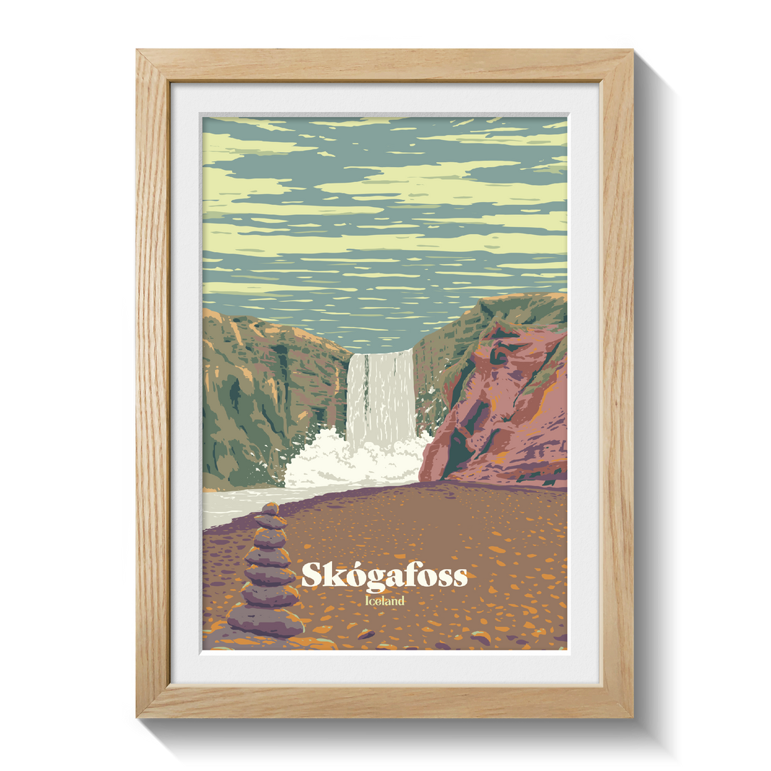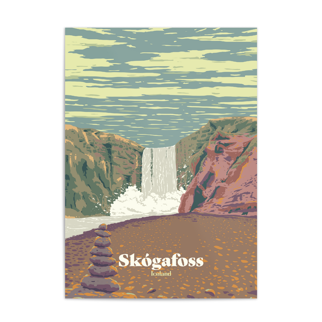 This is an original travel poster featuring Skogafoss in Iceland, one of the country's most picturesque waterfalls.