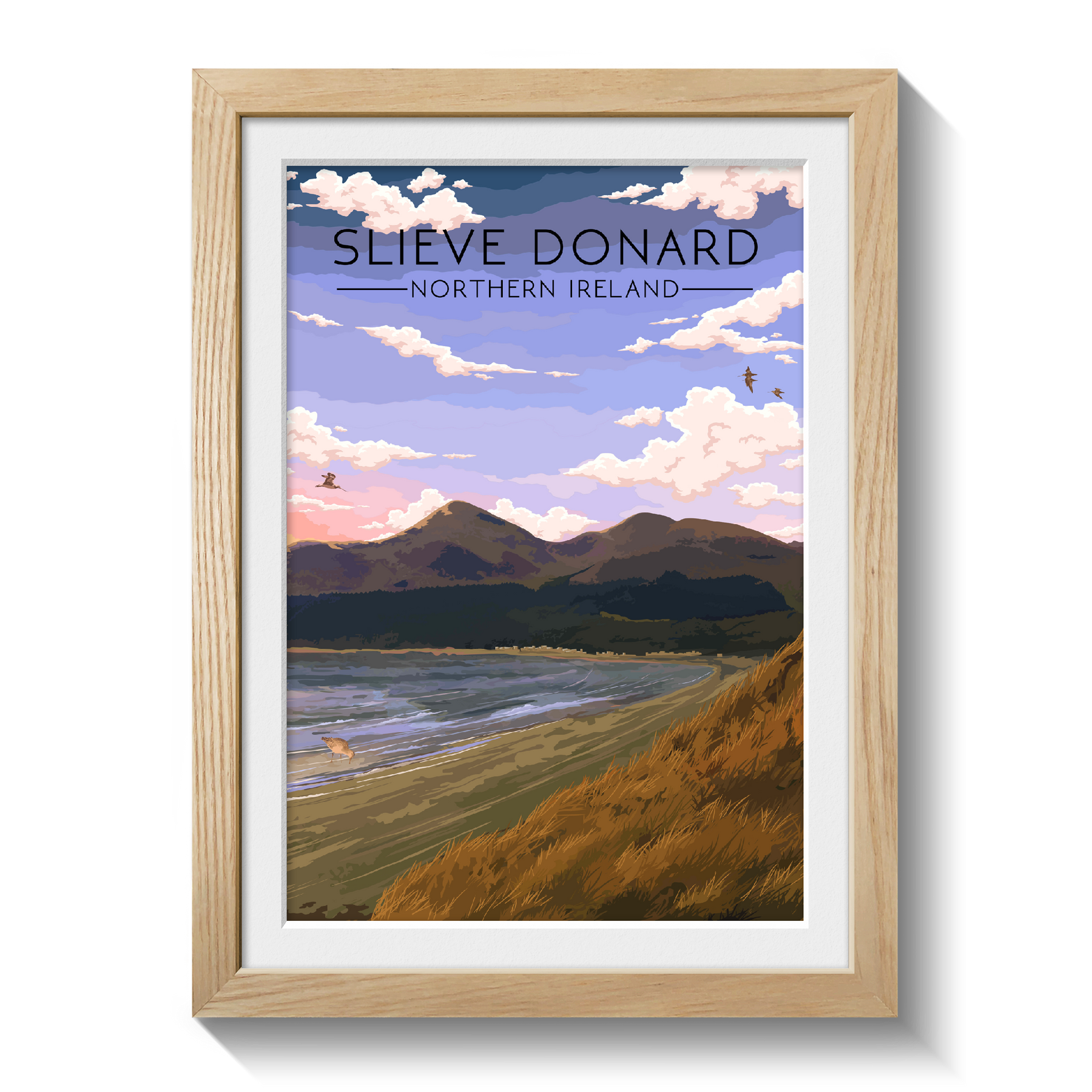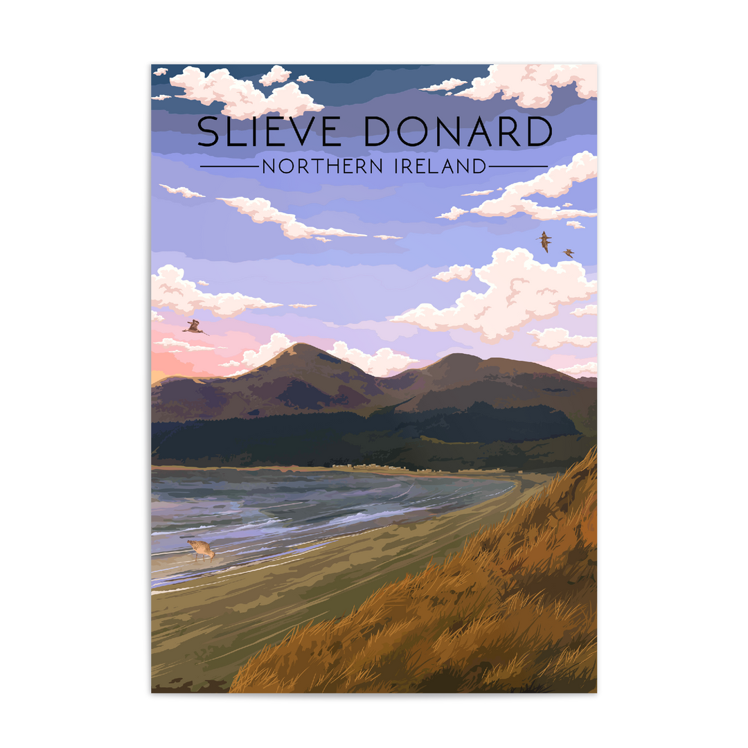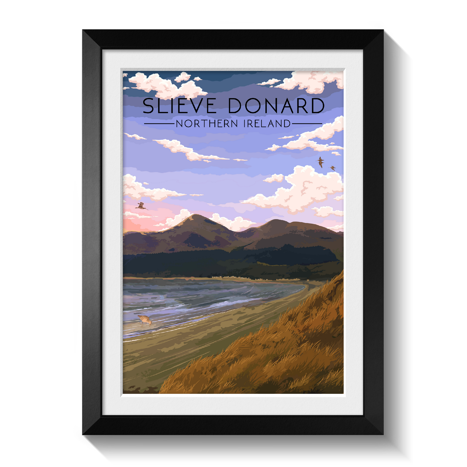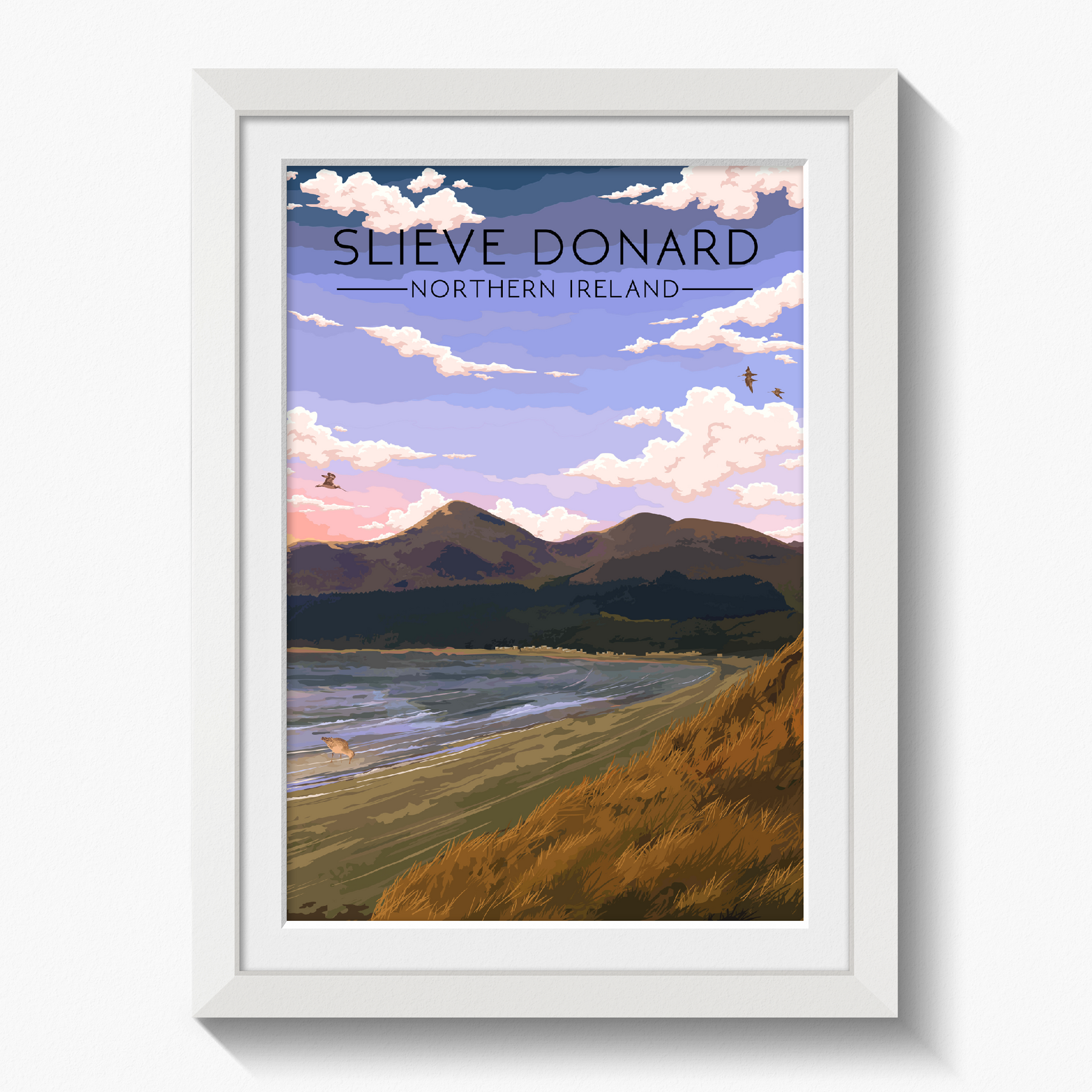 An original travel poster featuring Slieve Donard, the tallest mountain in Northern Ireland at 850 metres and part of the Mourne Mountains