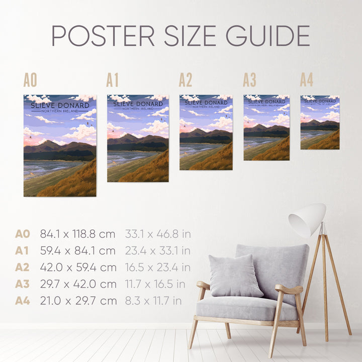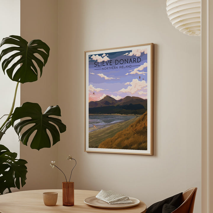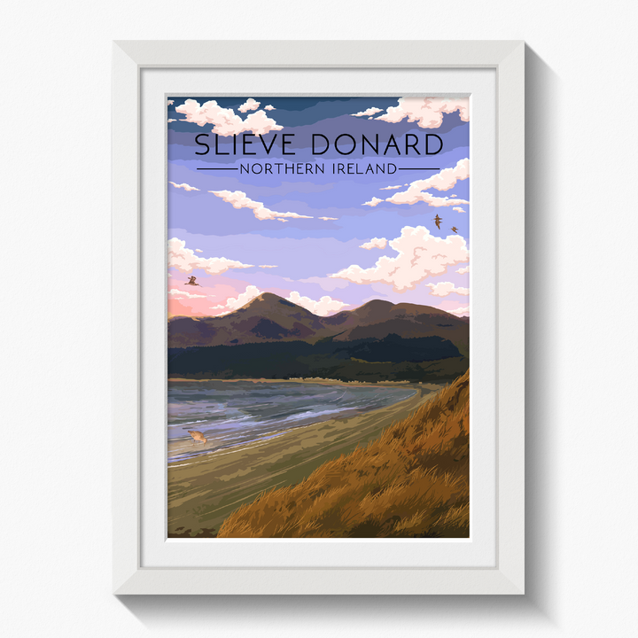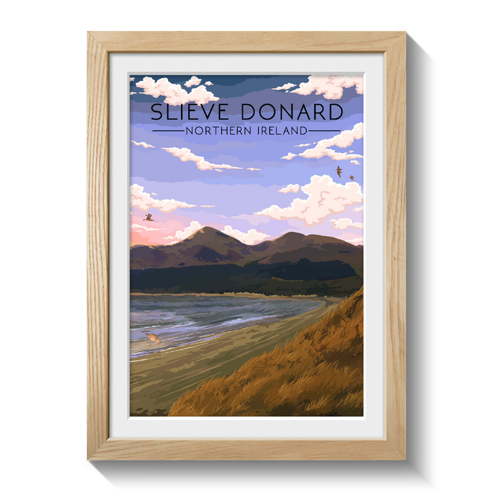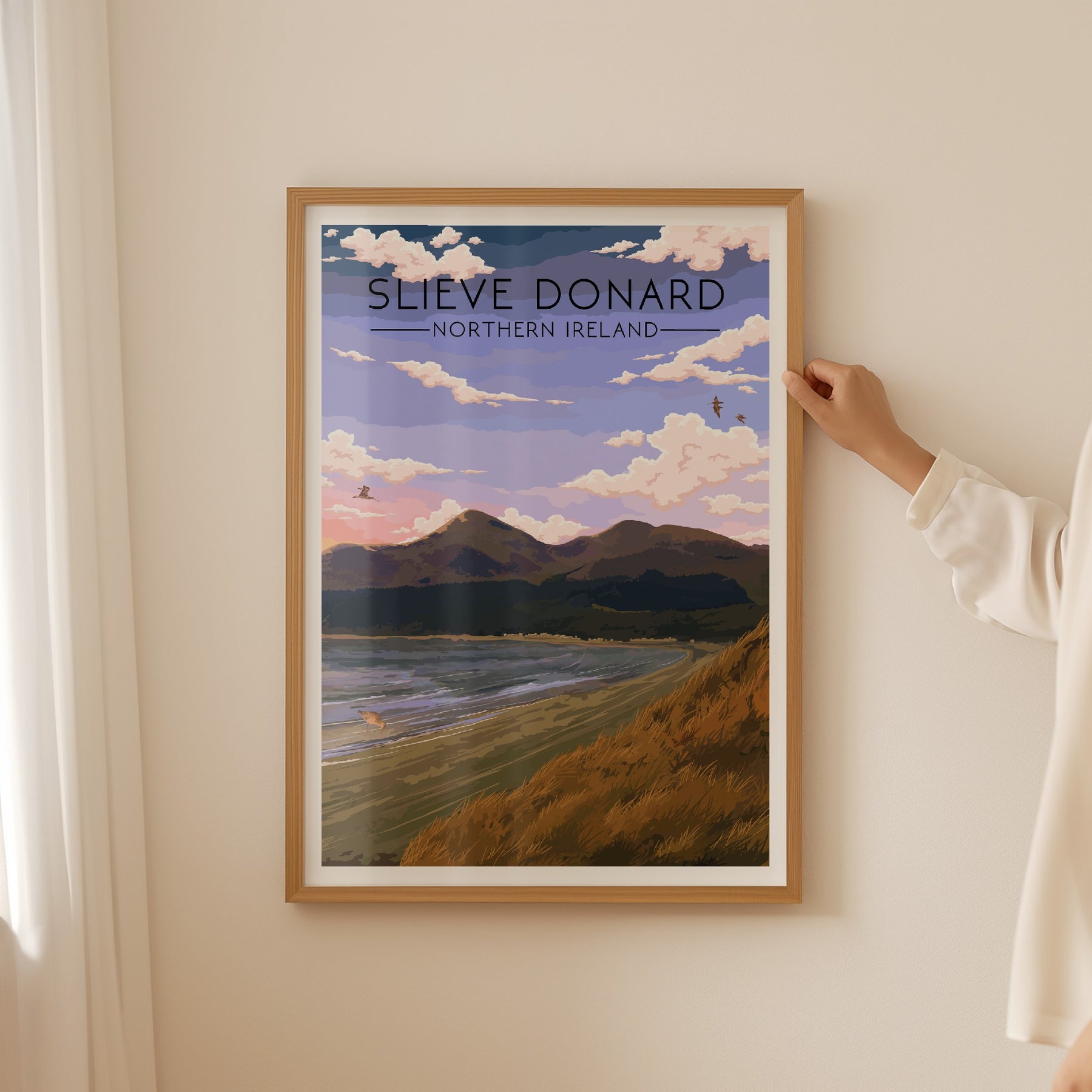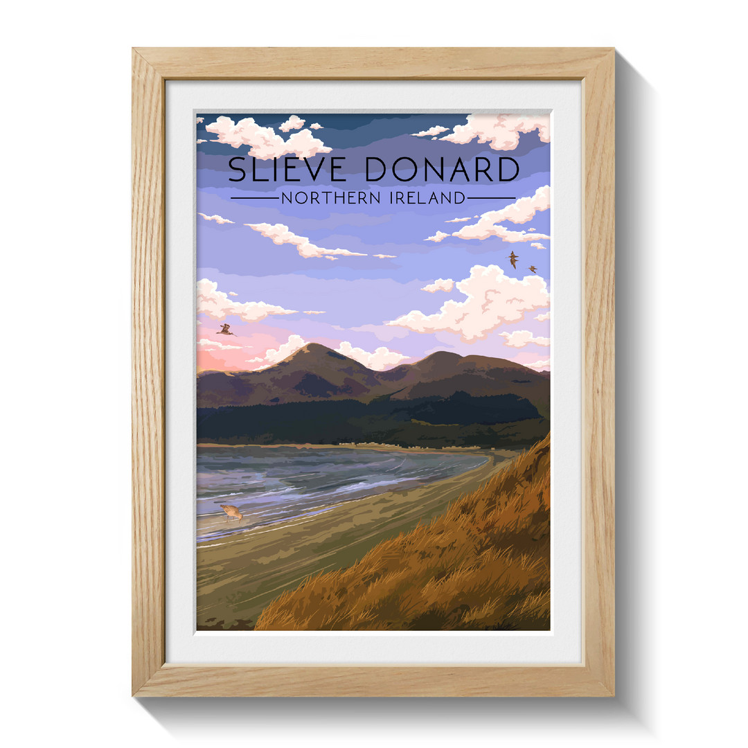 An original travel poster featuring Slieve Donard, the tallest mountain in Northern Ireland at 850 metres and part of the Mourne Mountains