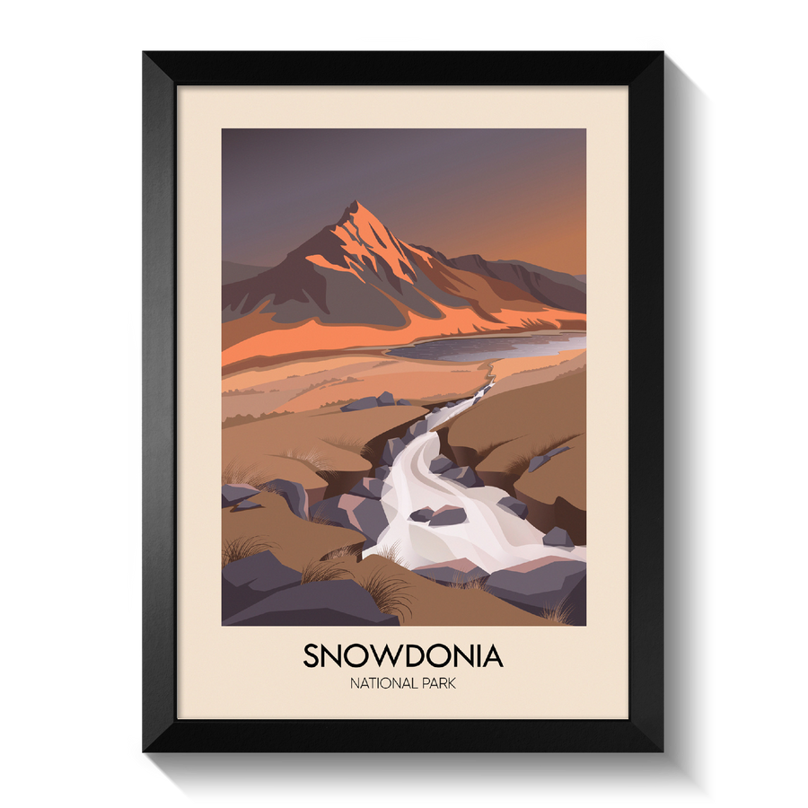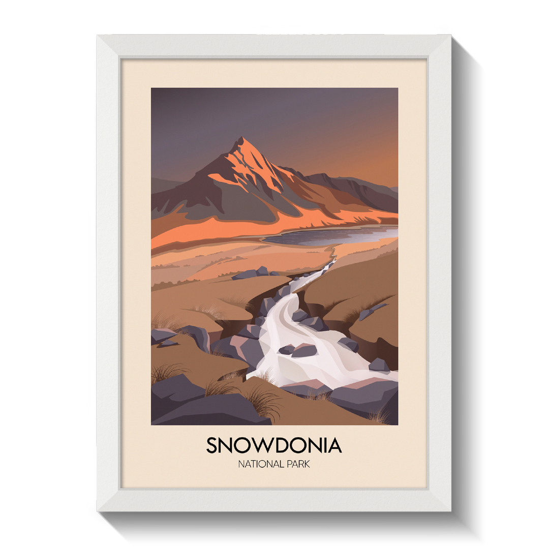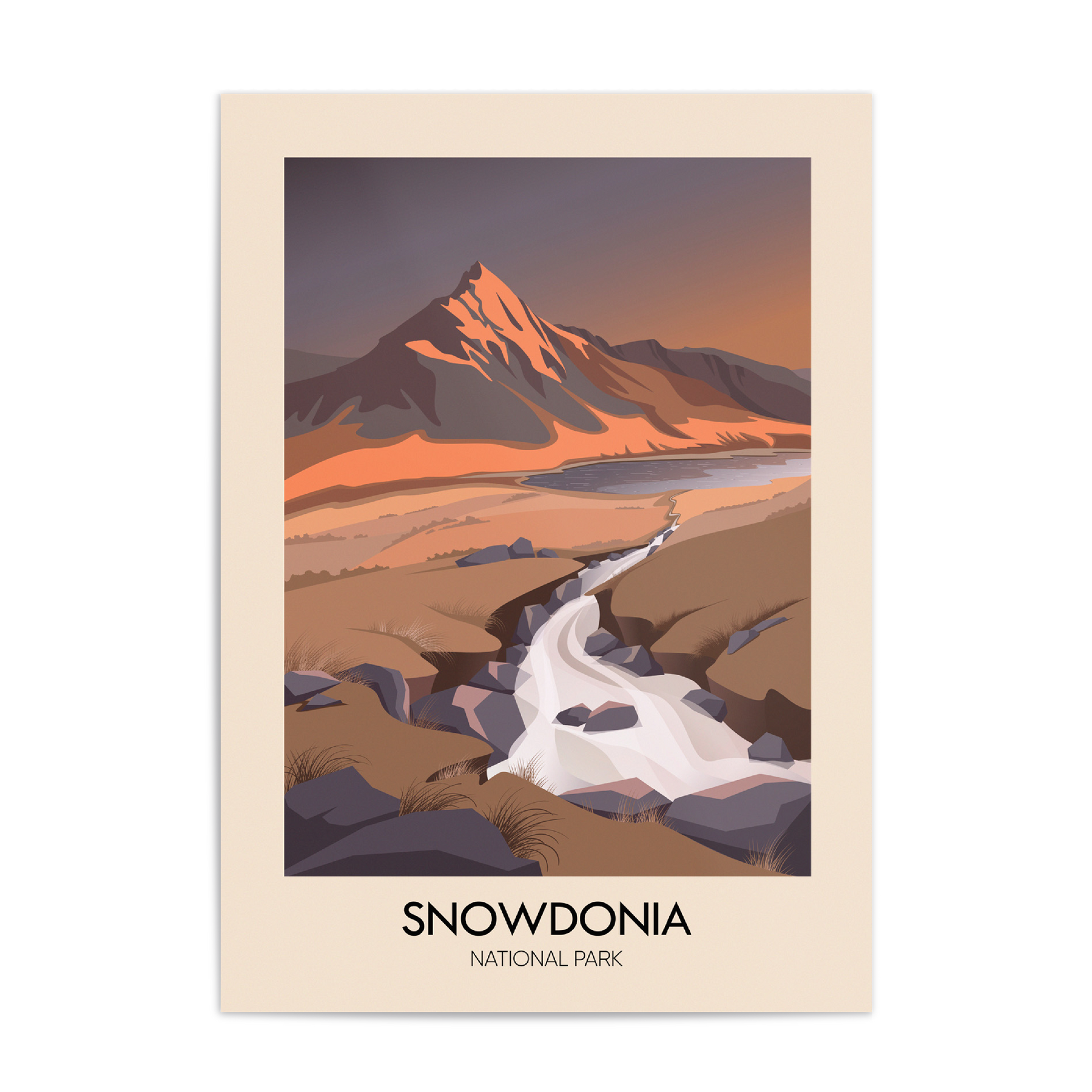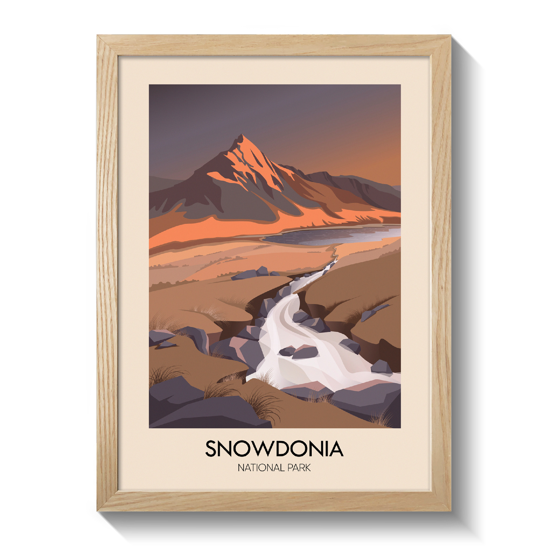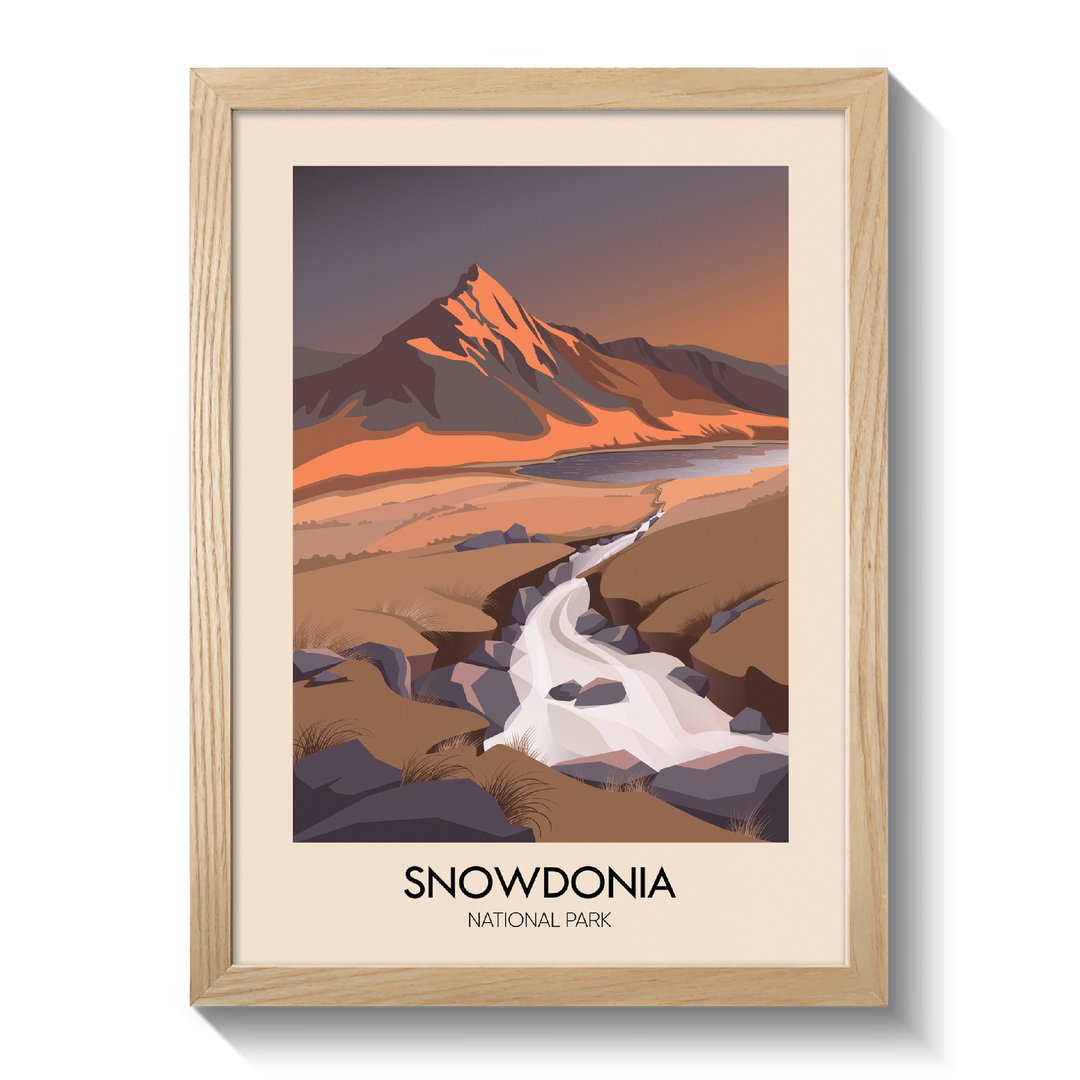 An original travel poster print featuring Tryfan mountain and Llyn Ogwen lake in Snowdonia National Park, Wales