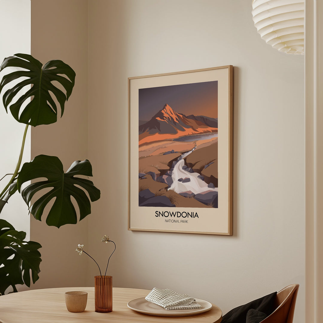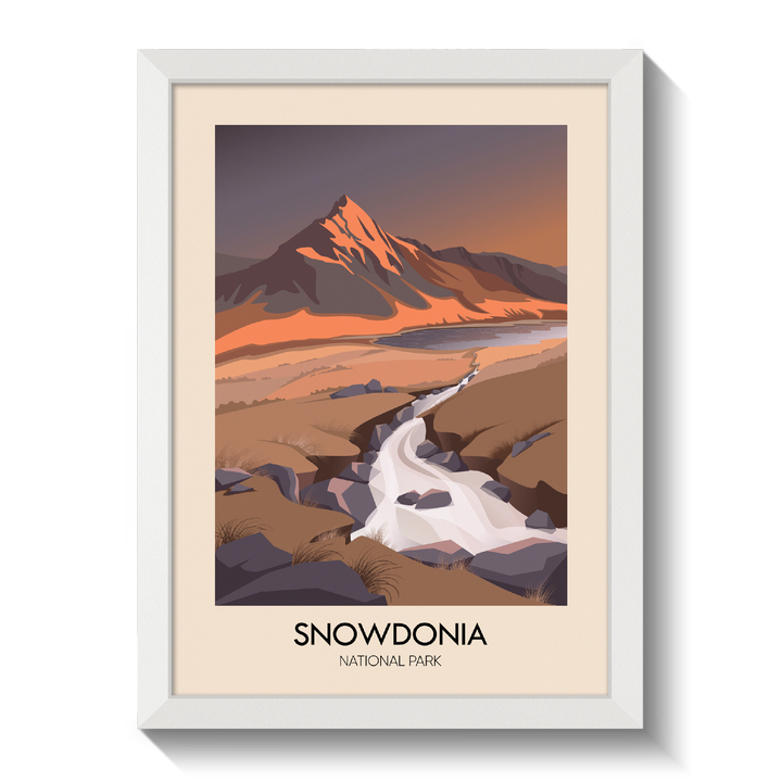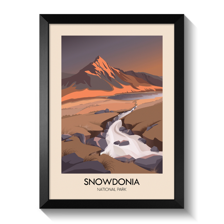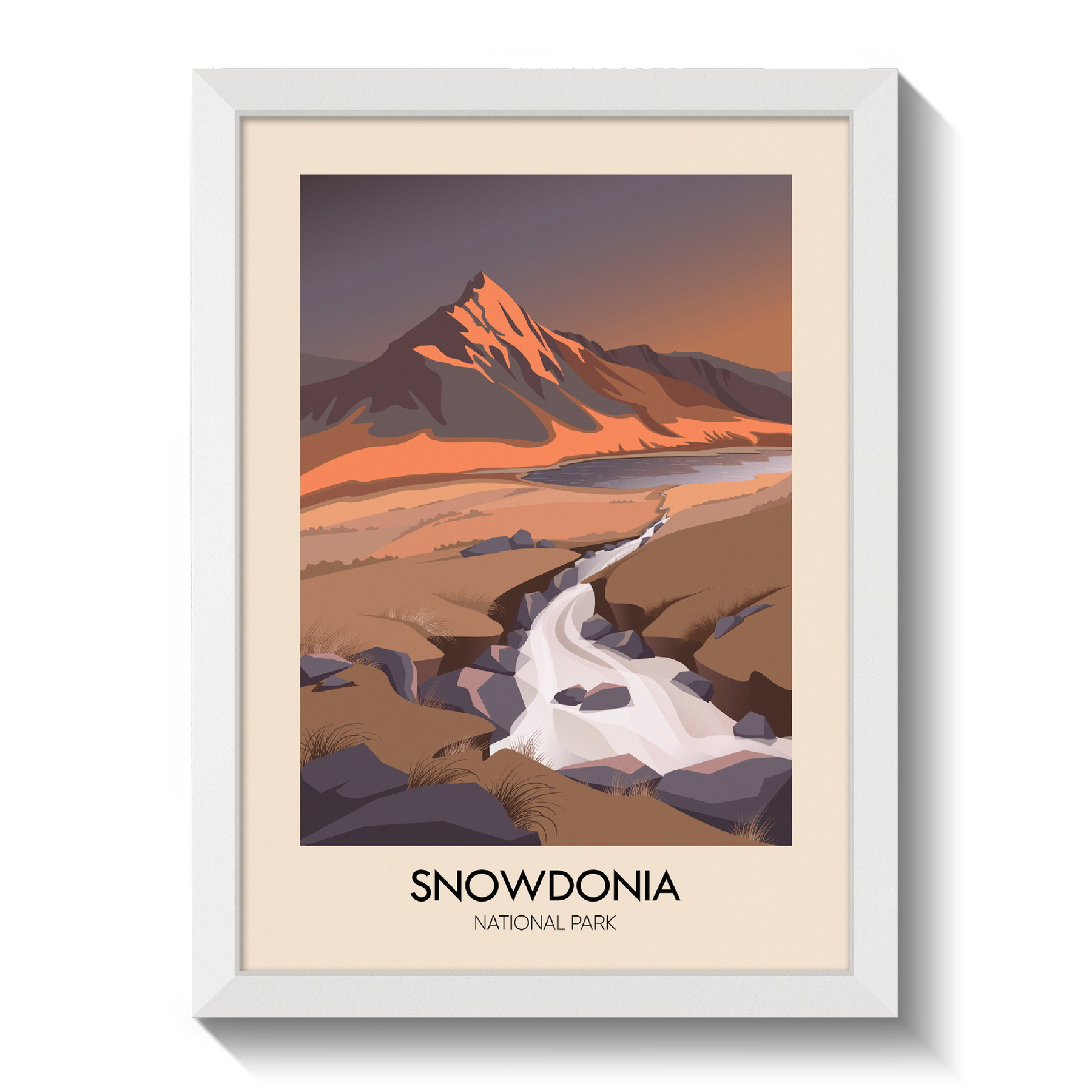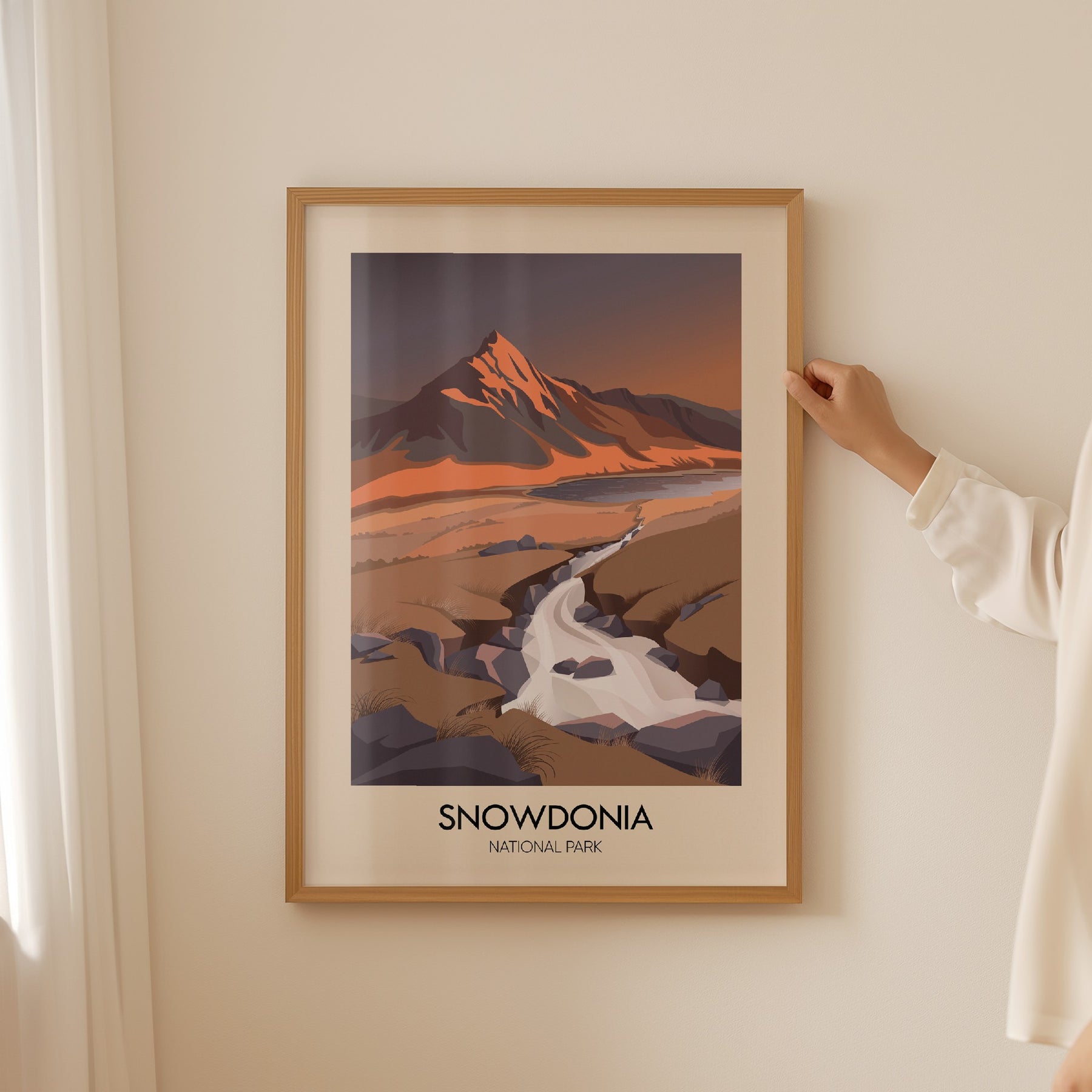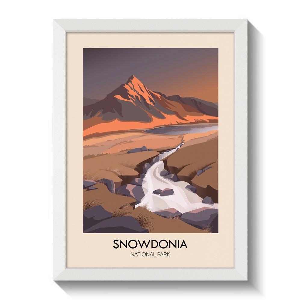 An original travel poster print featuring Tryfan mountain and Llyn Ogwen lake in Snowdonia National Park, Wales