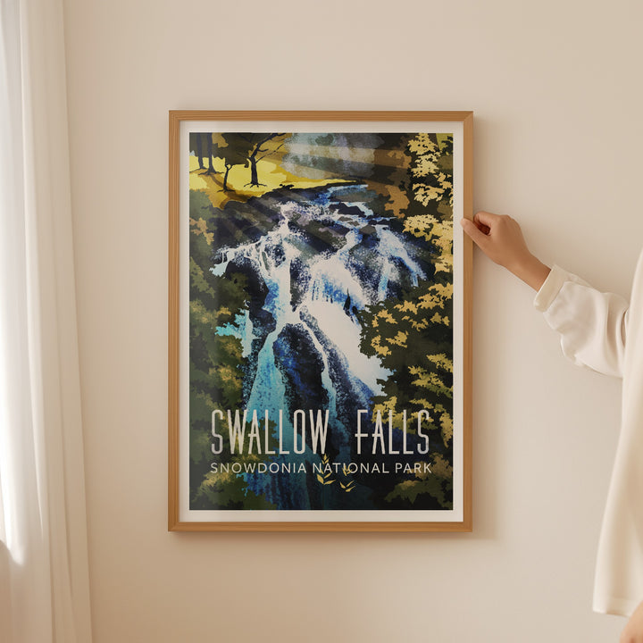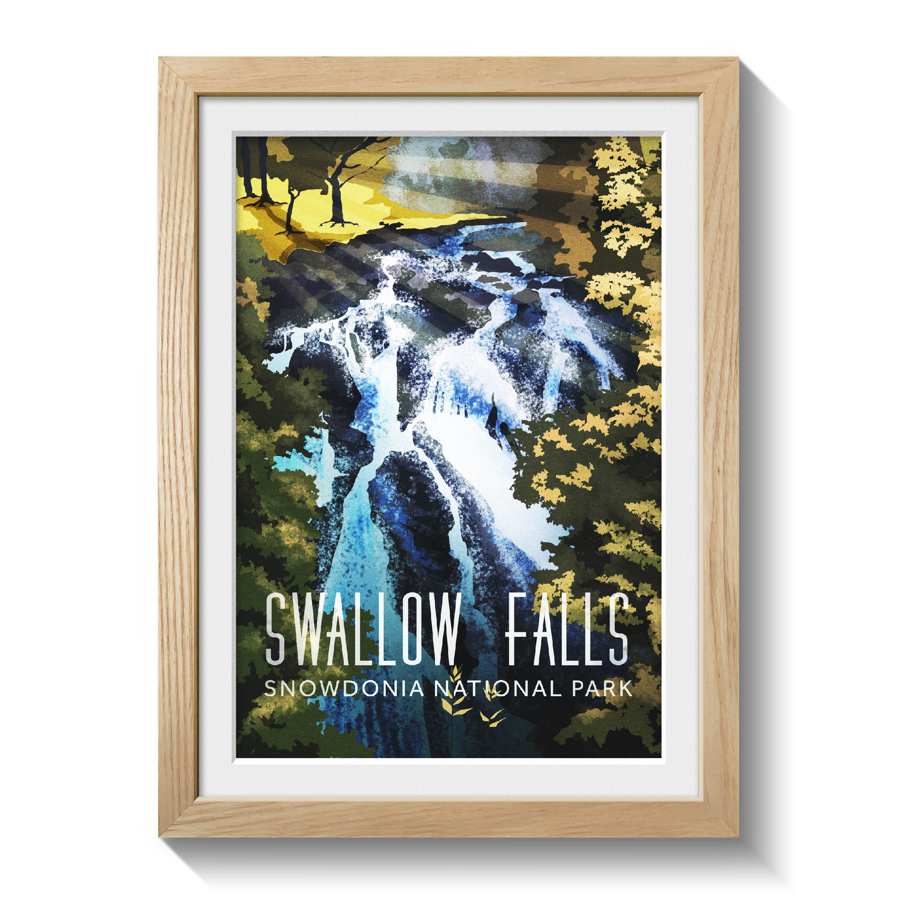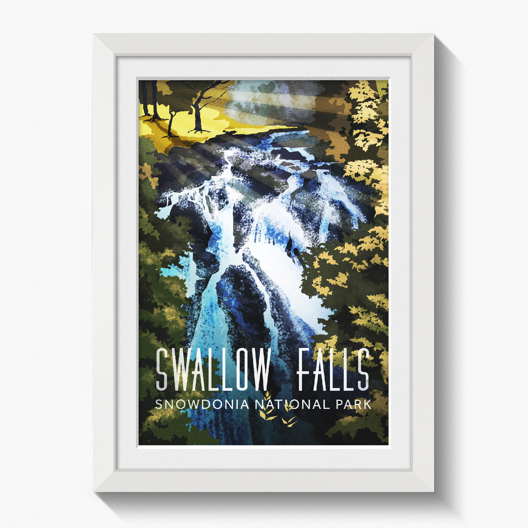 An original travel poster featuring Swallow Falls, aka Rhaeadr Ewynnol near the village of Betws-y-Coed in Snowdonia National Park, North Wales.