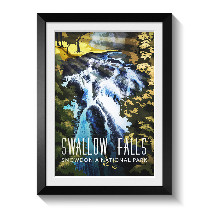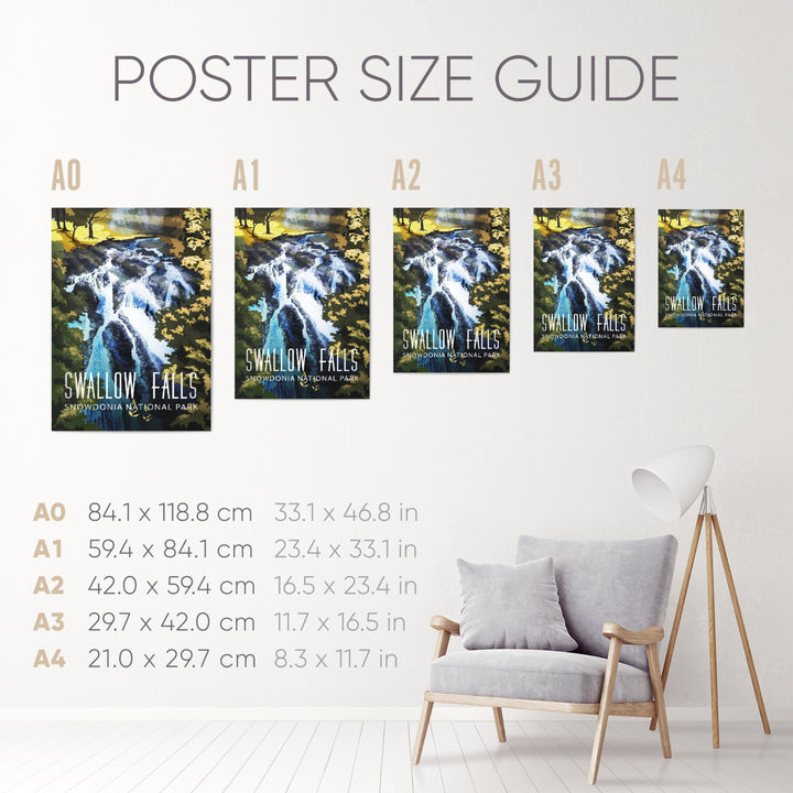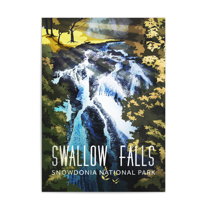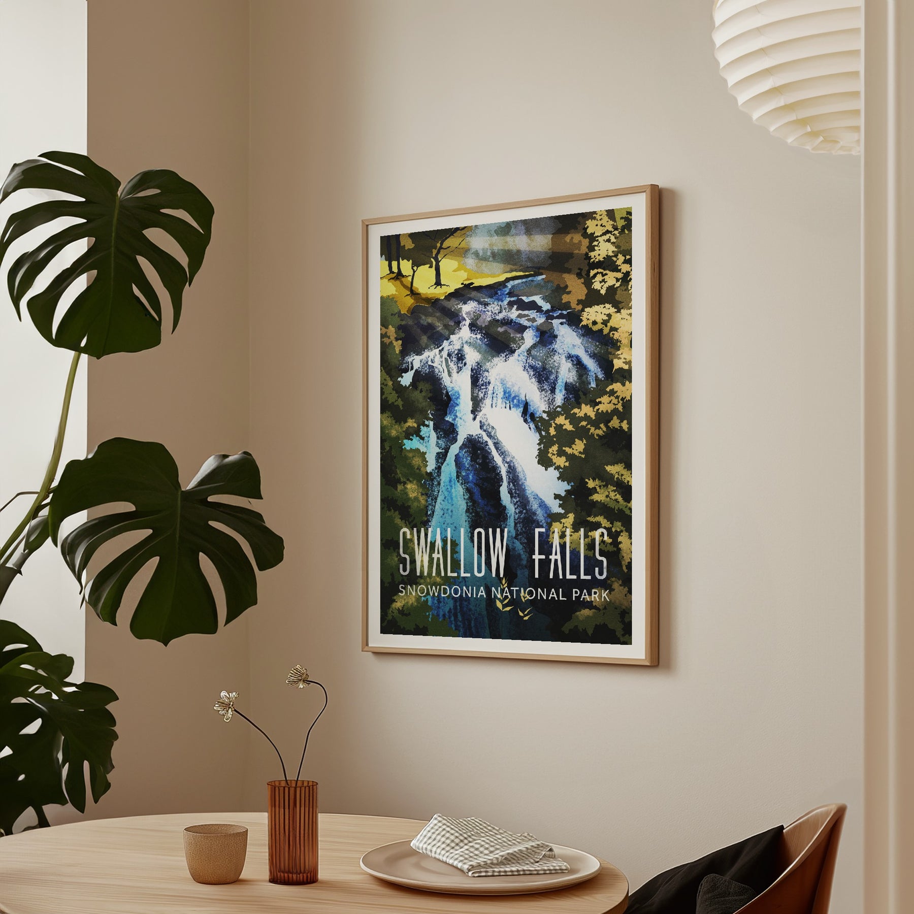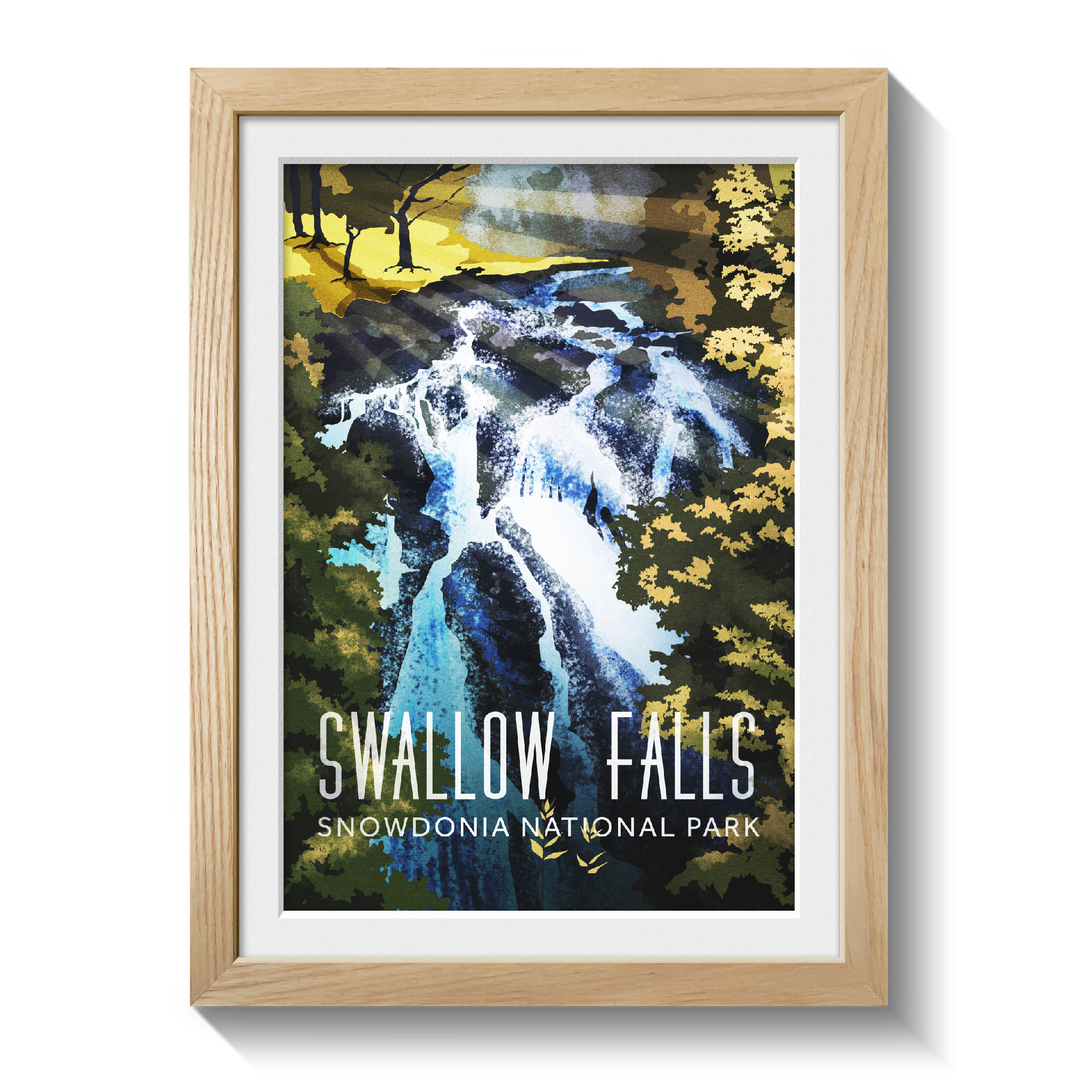 An original travel poster featuring Swallow Falls, aka Rhaeadr Ewynnol near the village of Betws-y-Coed in Snowdonia National Park, North Wales.
