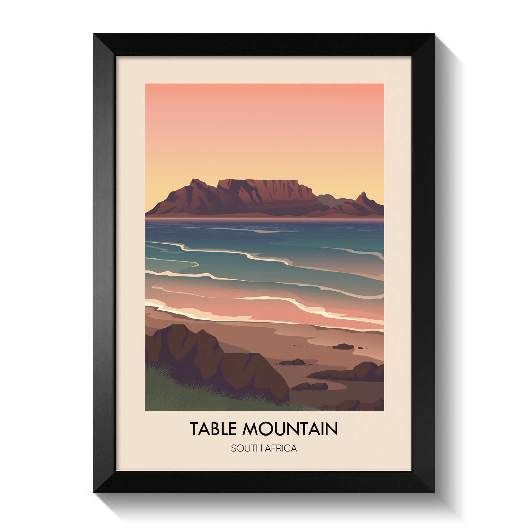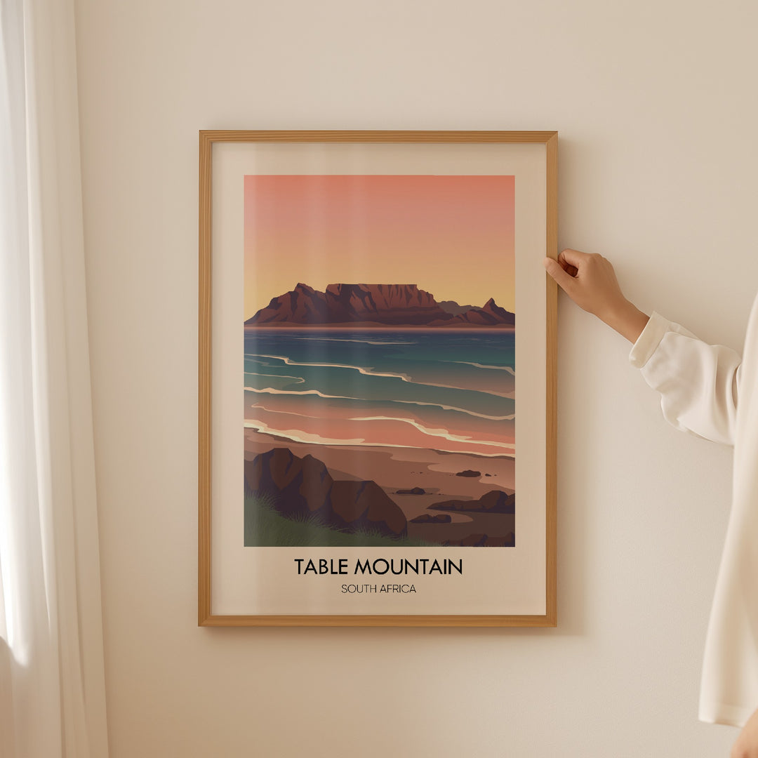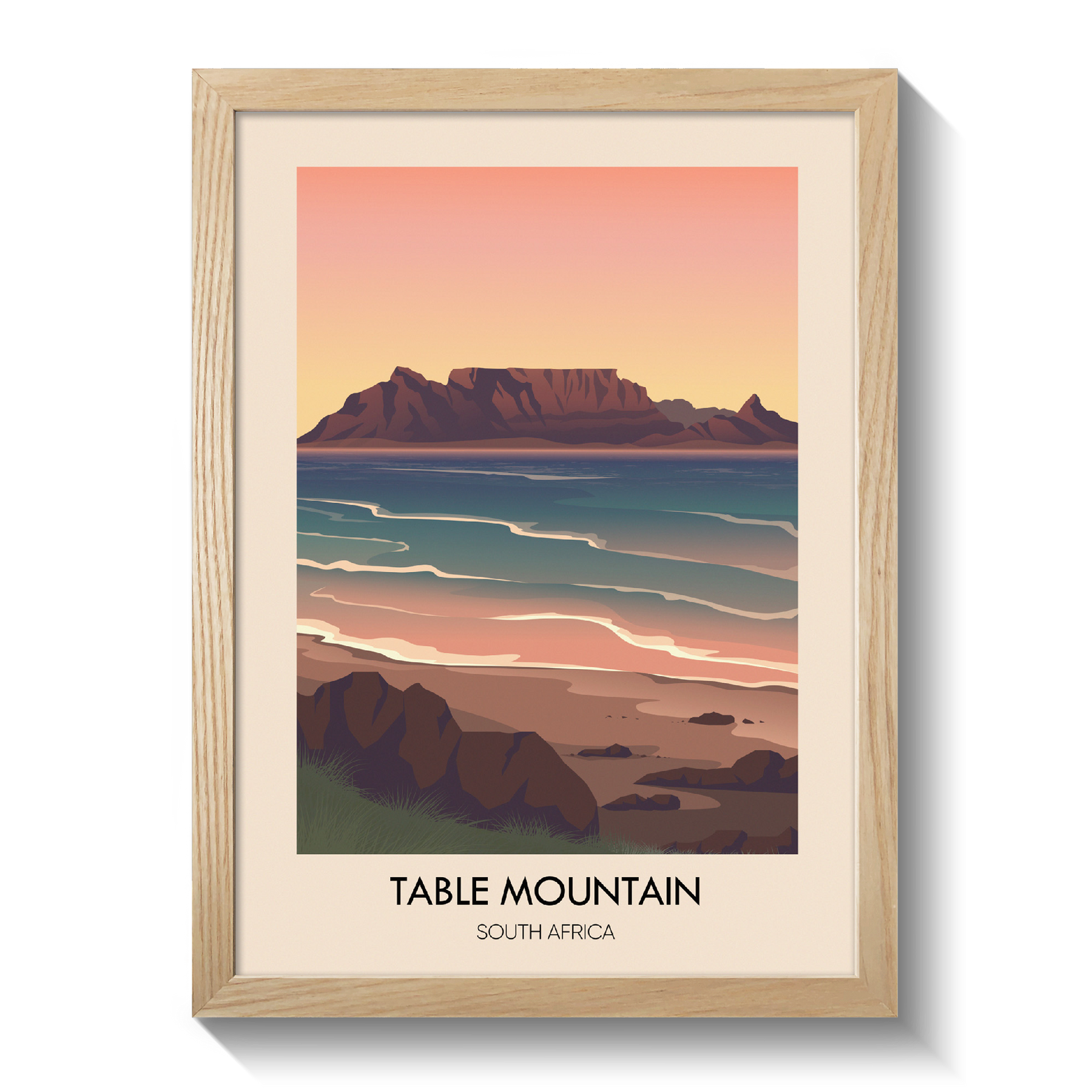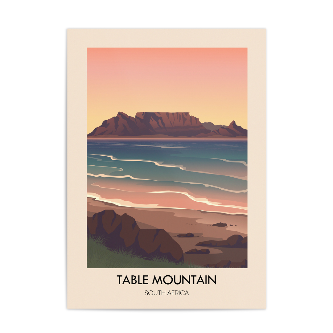 An original travel poster of the famous Table Mountain. It is a flat-topped mountain  forming a prominent landmark overlooking the city of Cape Town in South Africa.
