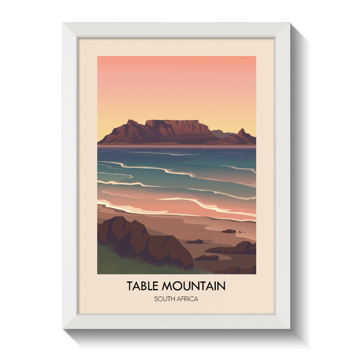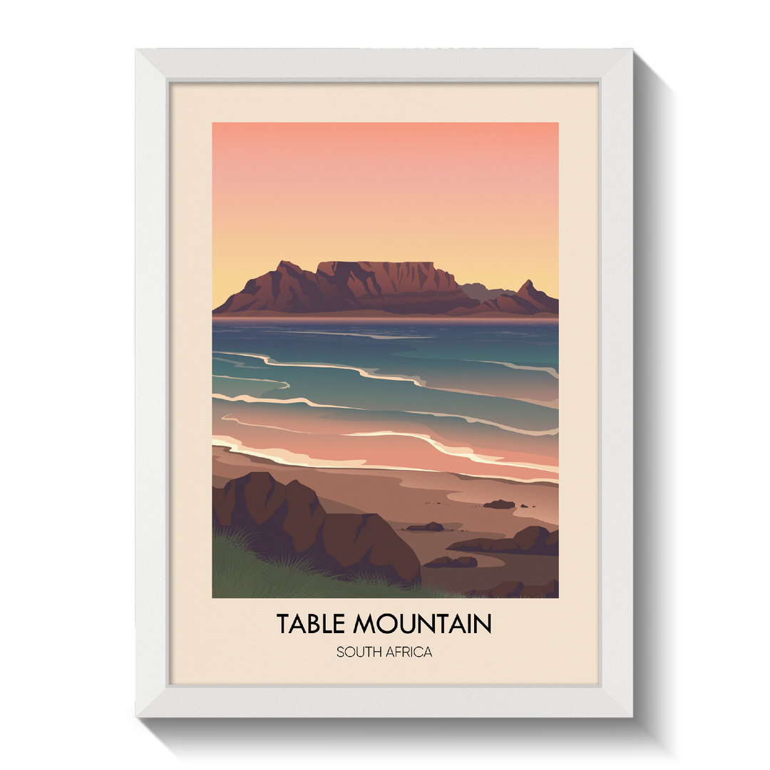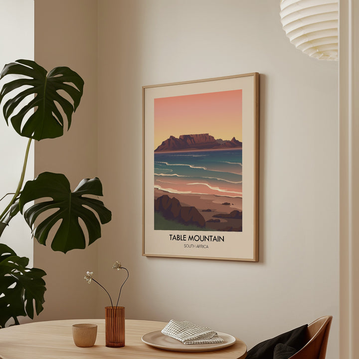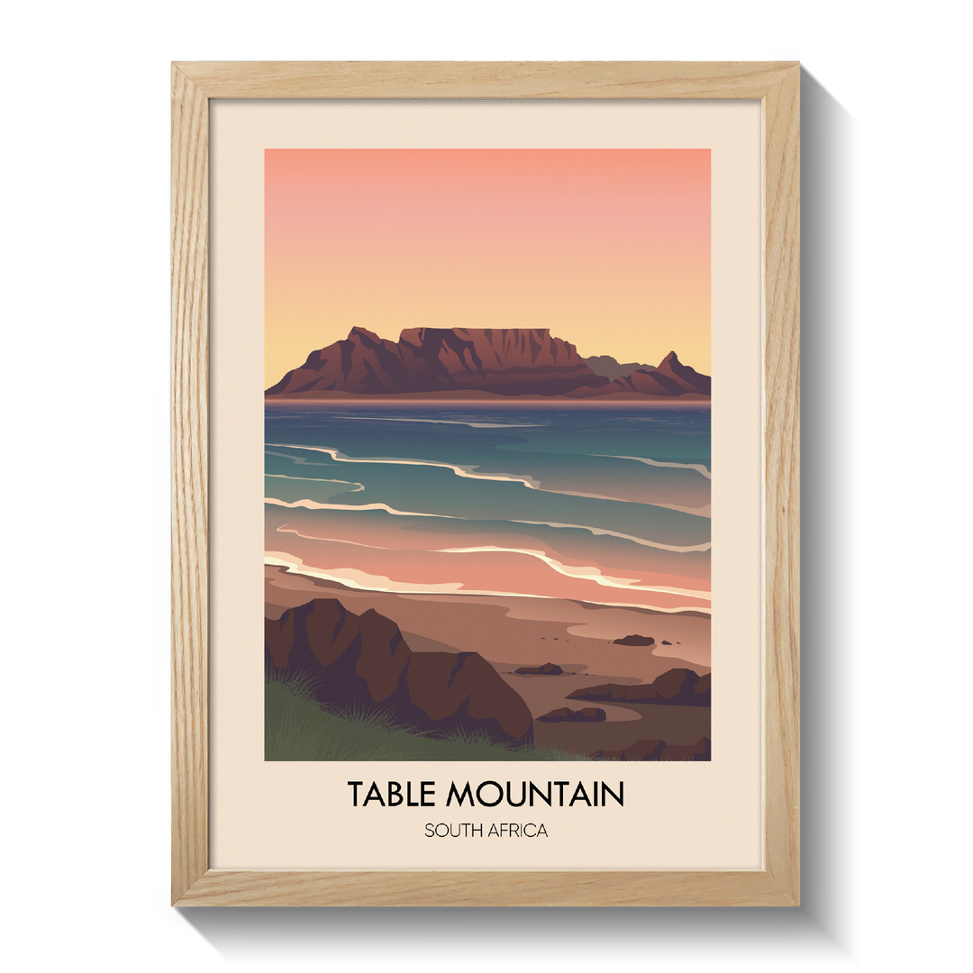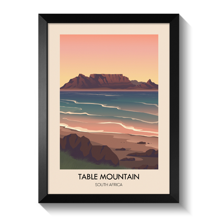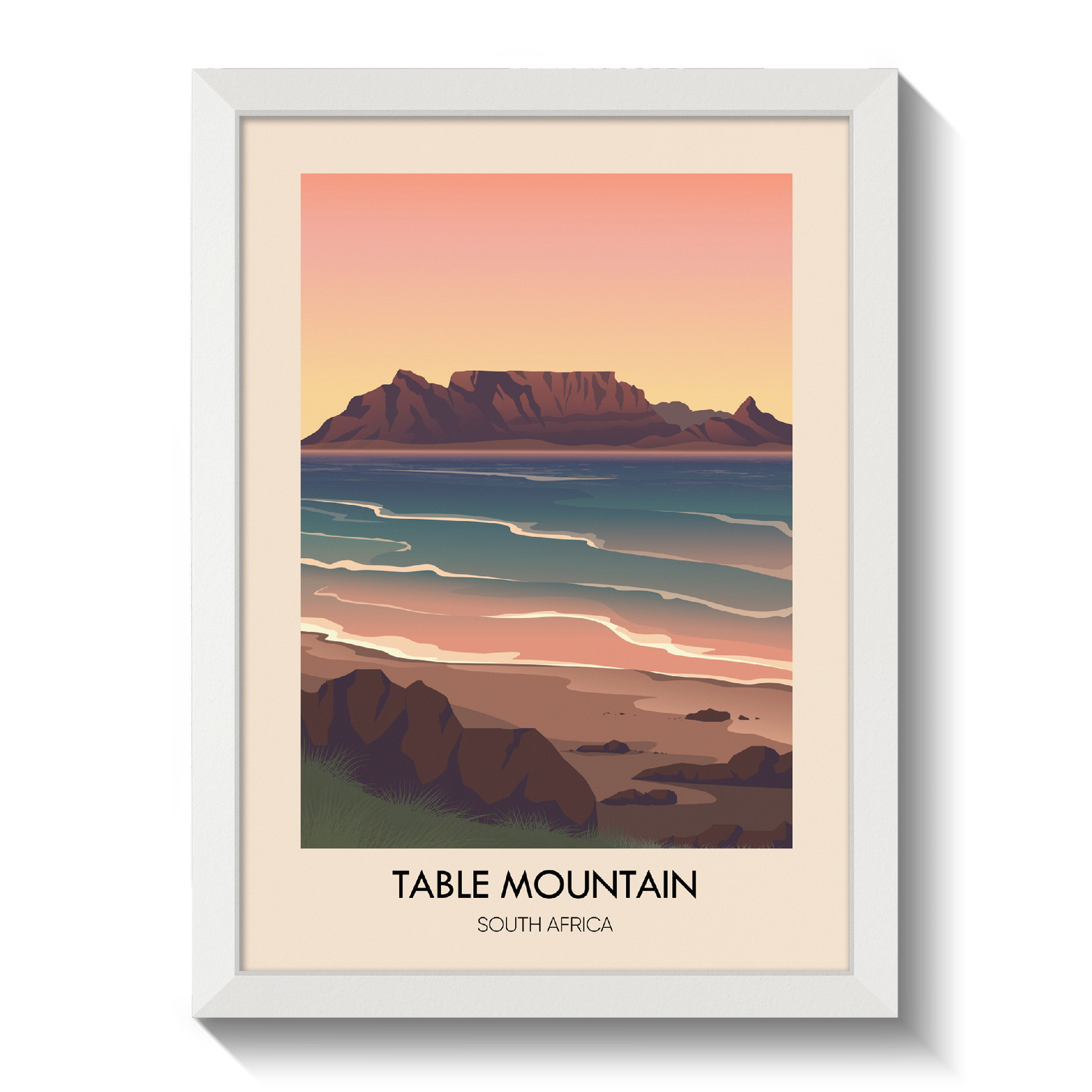 An original travel poster of the famous Table Mountain. It is a flat-topped mountain  forming a prominent landmark overlooking the city of Cape Town in South Africa.