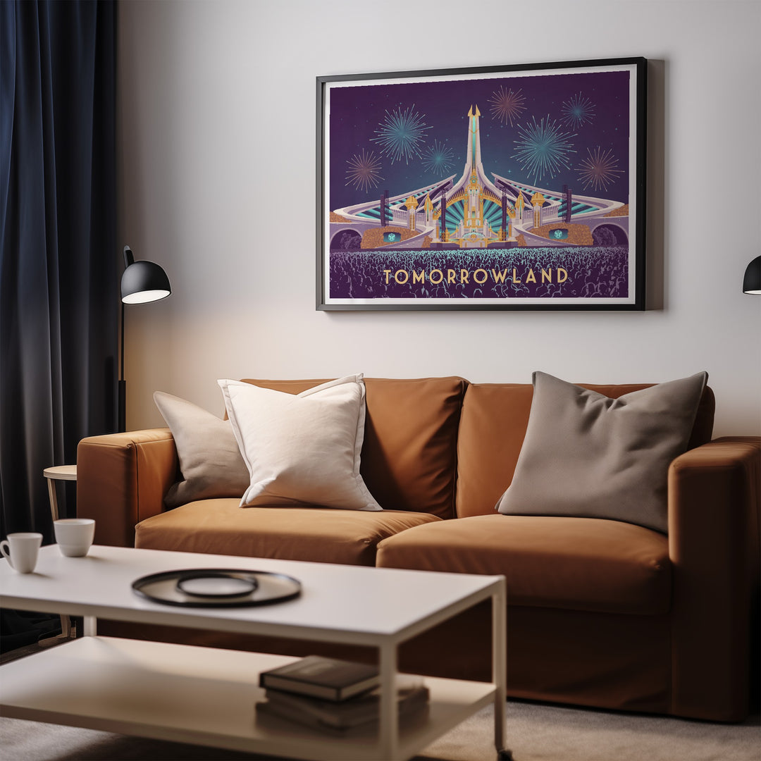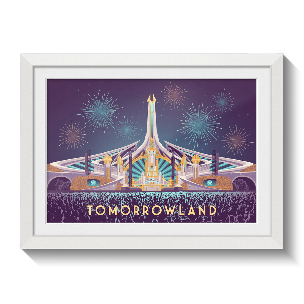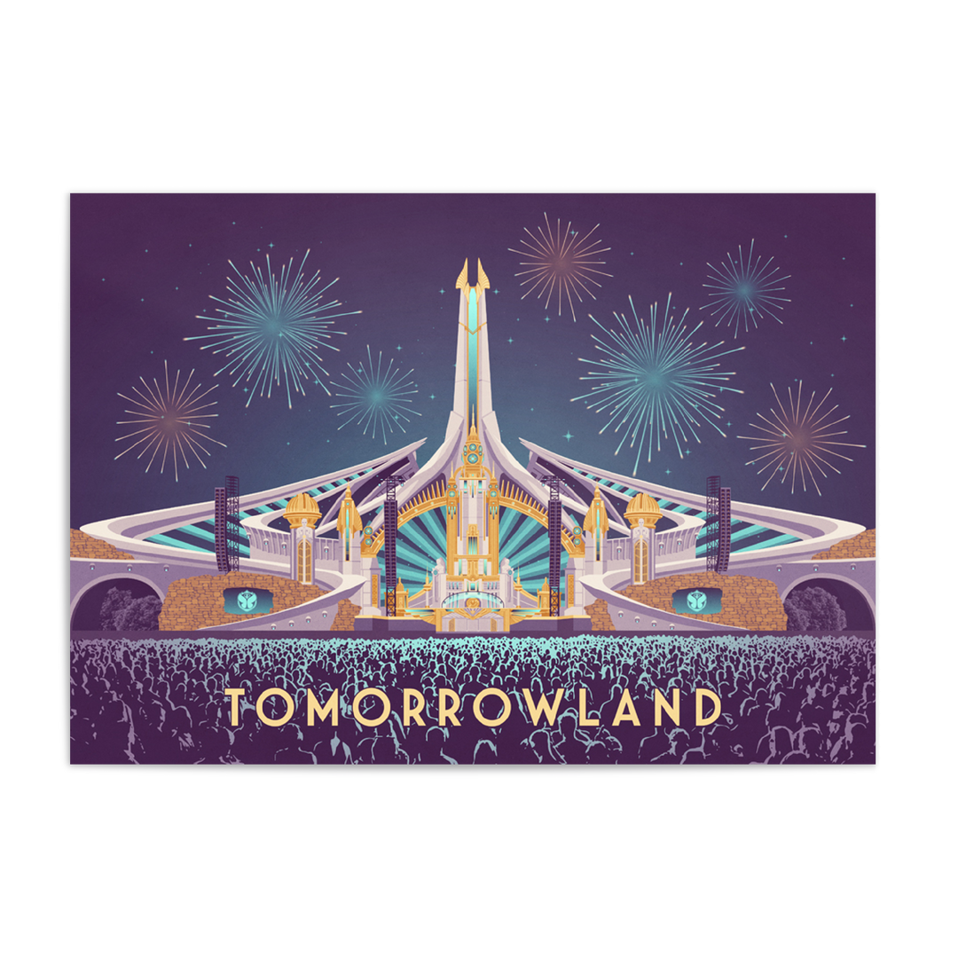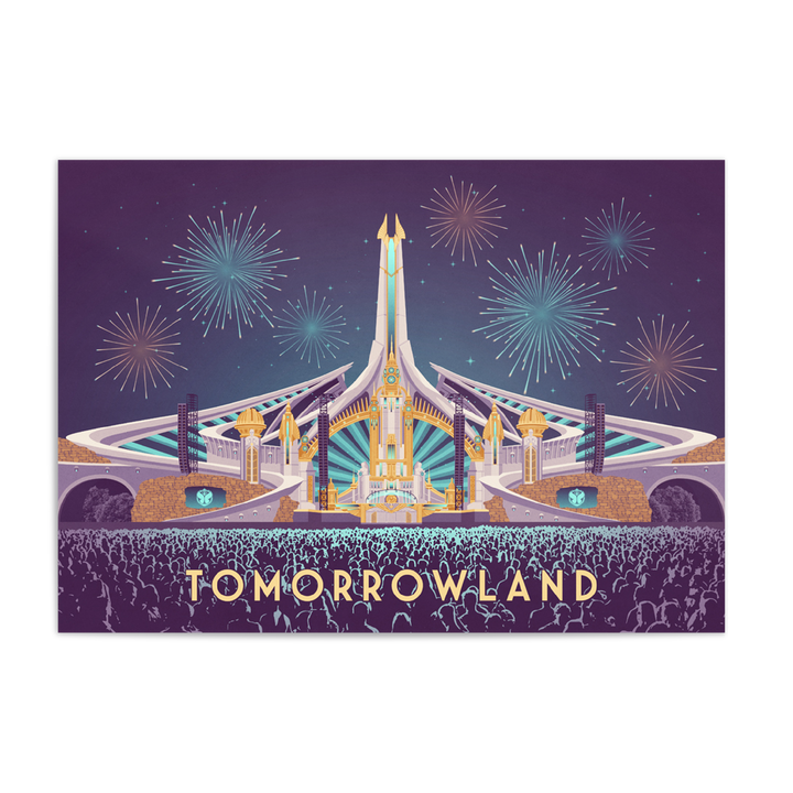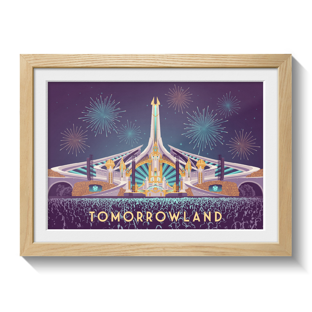 An original travel print featuring the main stage at legendary Electronic Dance Music festival, Tomorrowland.