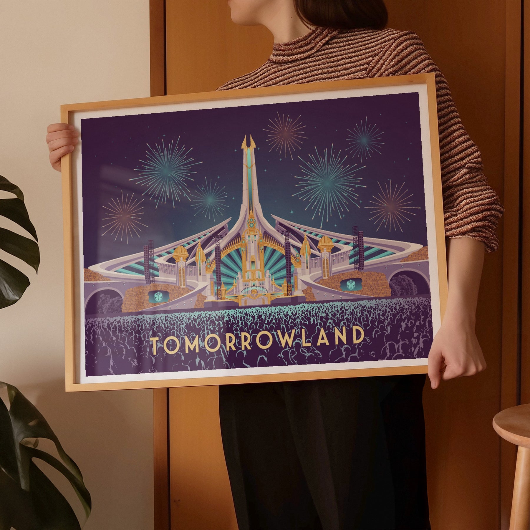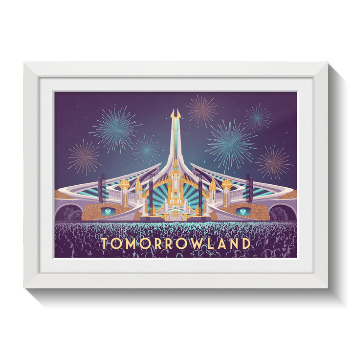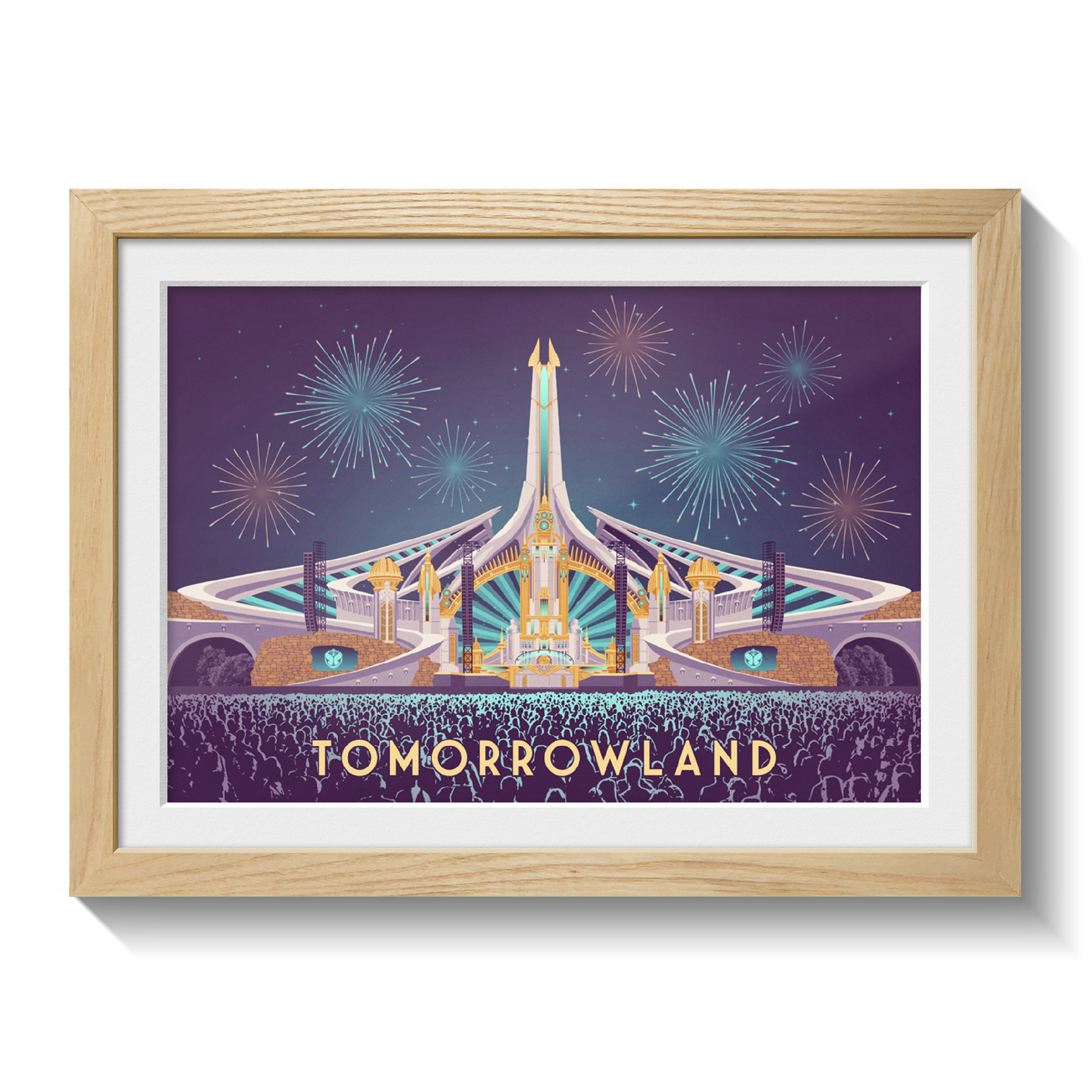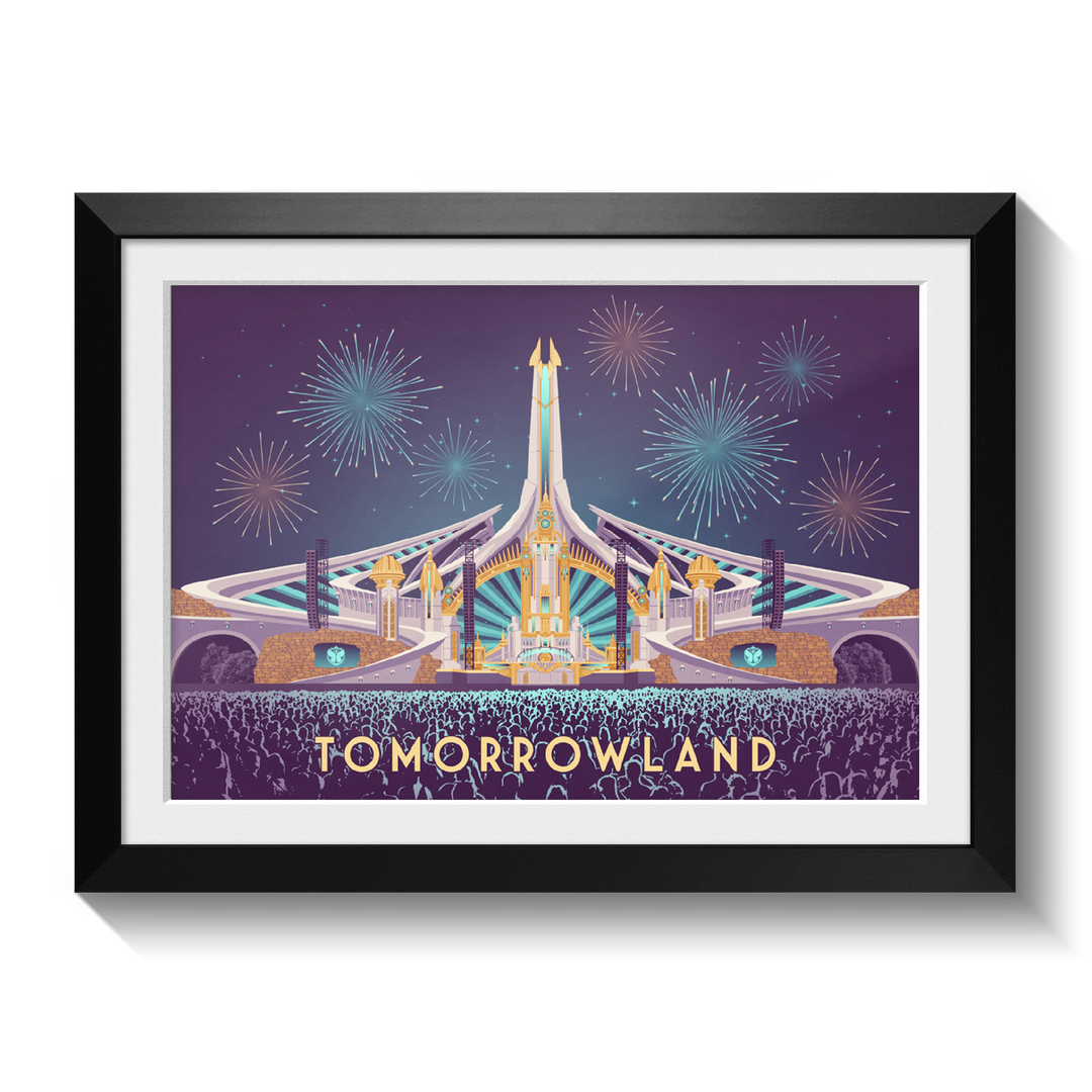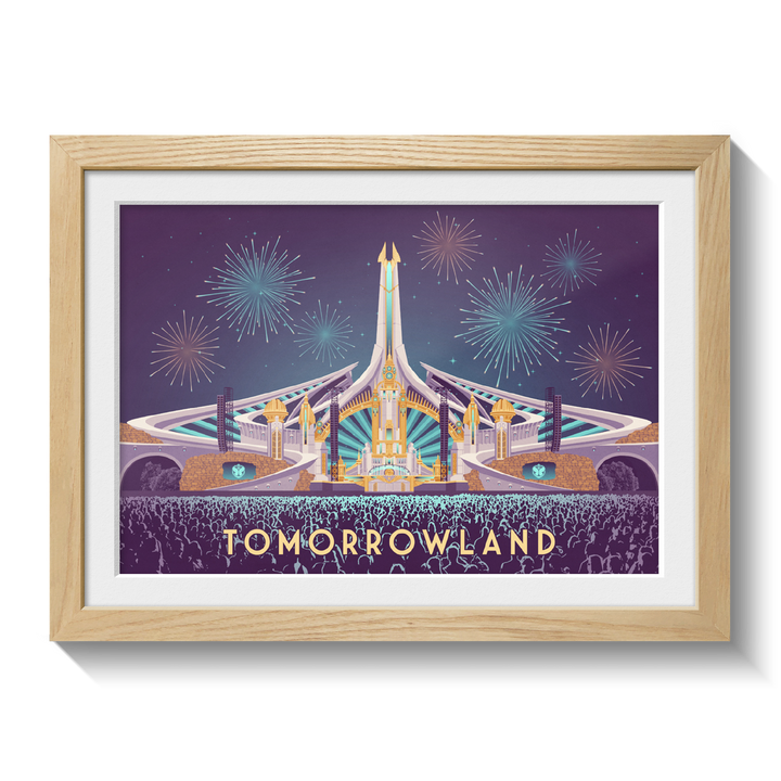 An original travel print featuring the main stage at legendary Electronic Dance Music festival, Tomorrowland.