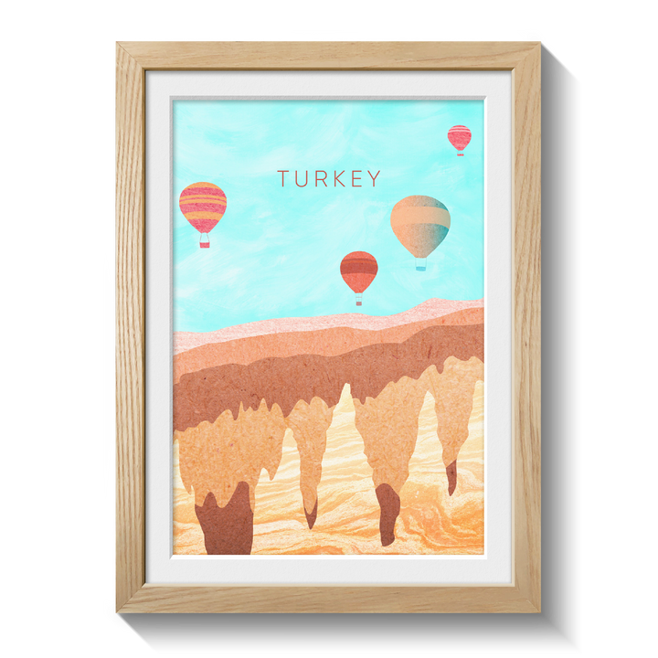 The poster features Cappadocia and area popular for hot air balloon rides, known for its 'Fairy Chimney' rock formations which can be found in the Goreme National Park in Love Valley, Monks Valley and Pigeon Valley.